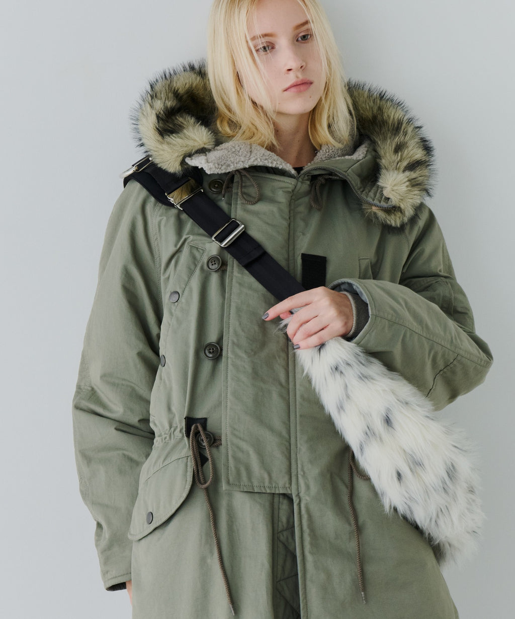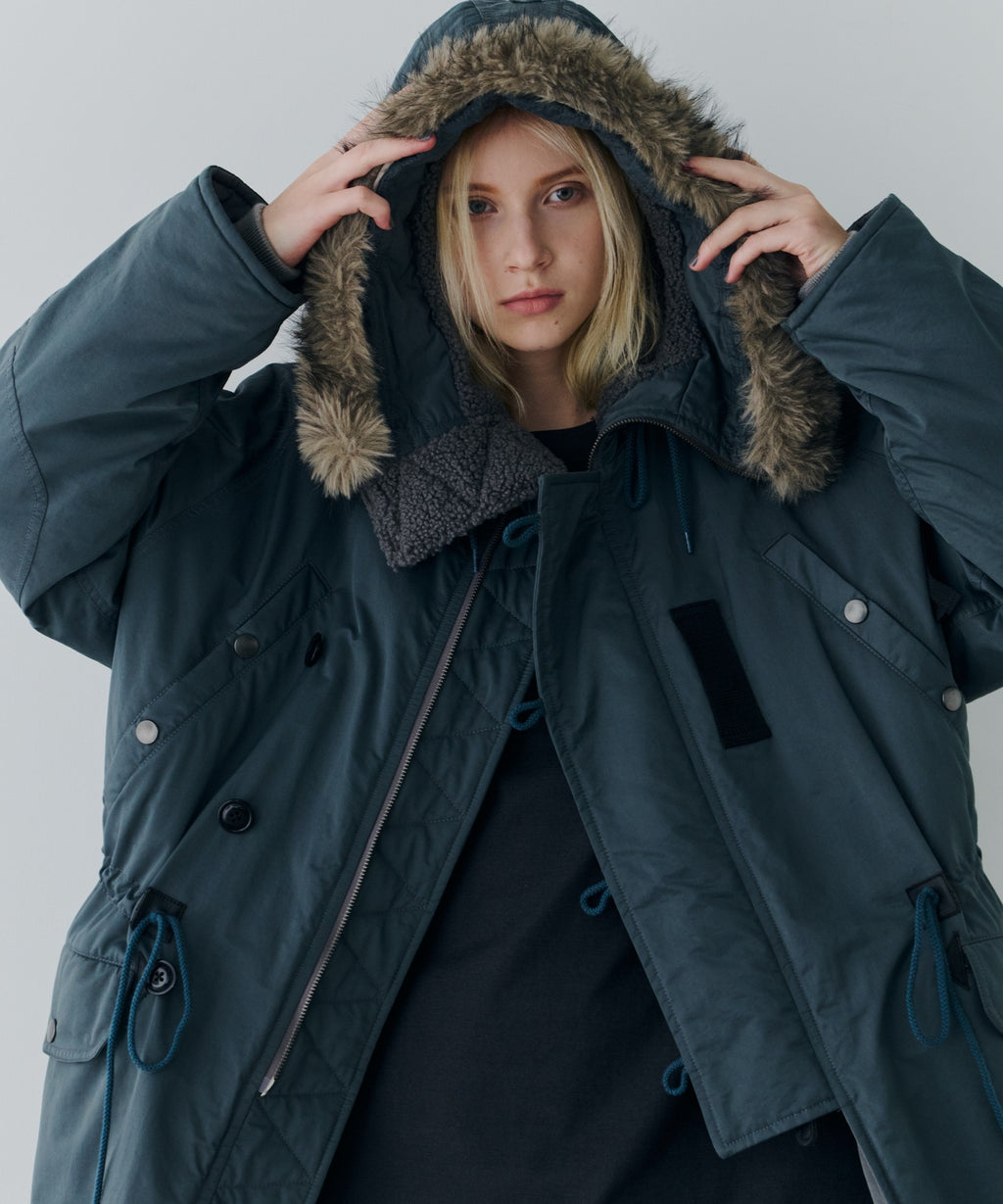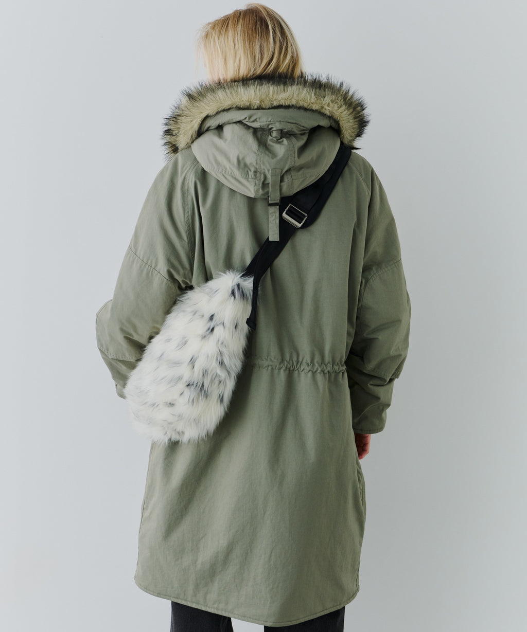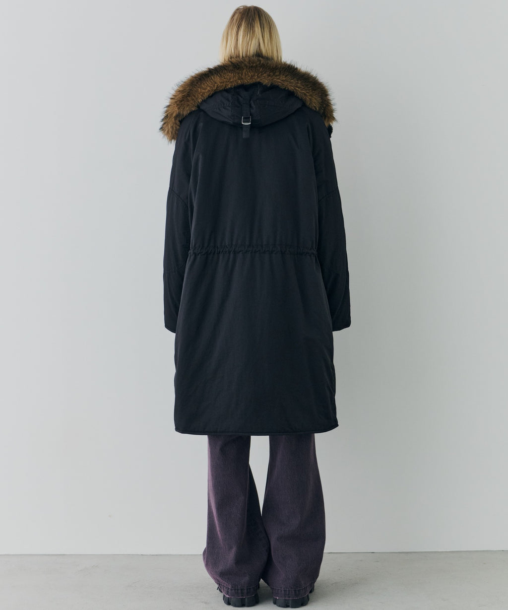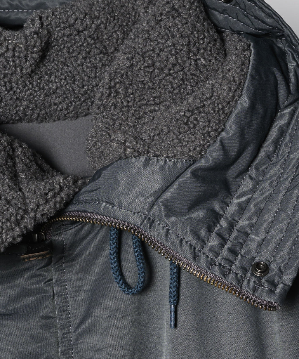 ・フード周りには毛足の長い色がミックスしたフェイクファーを取り付け、フードの裏地にはボアを張り保温性に優れた仕様