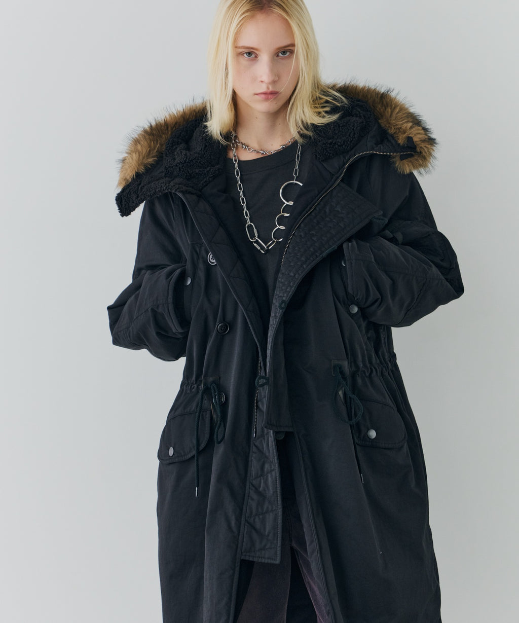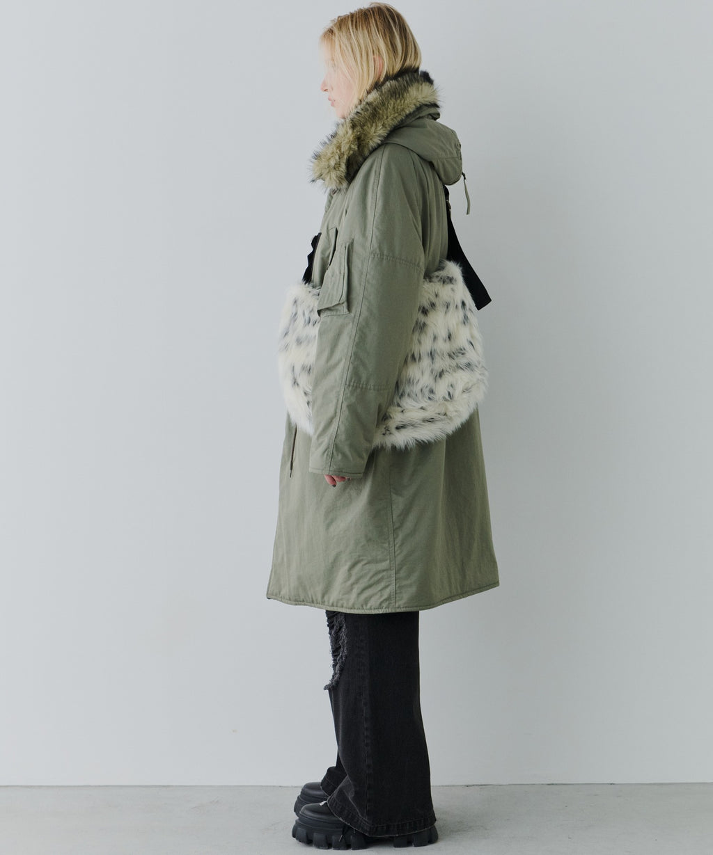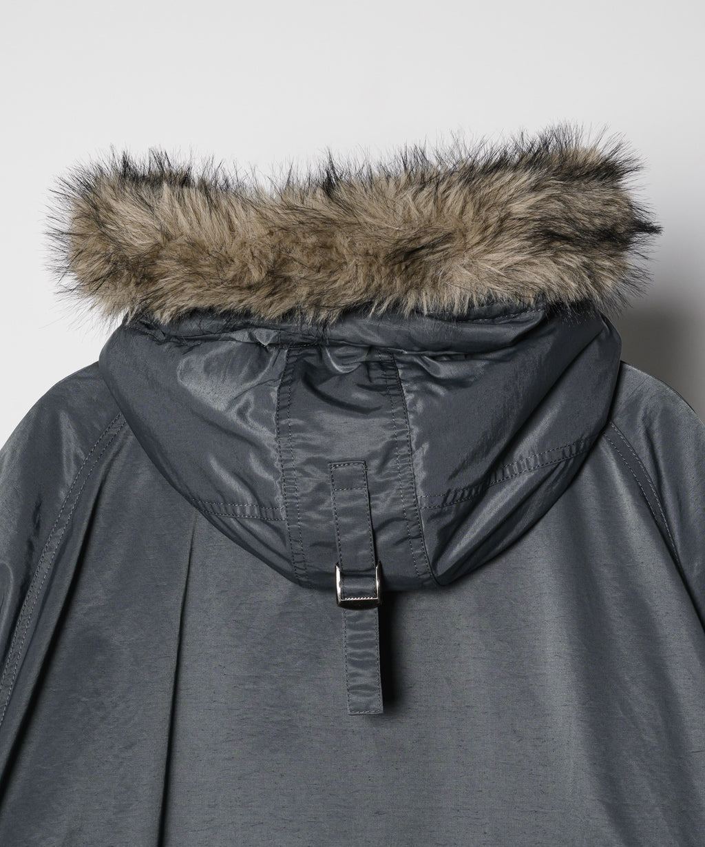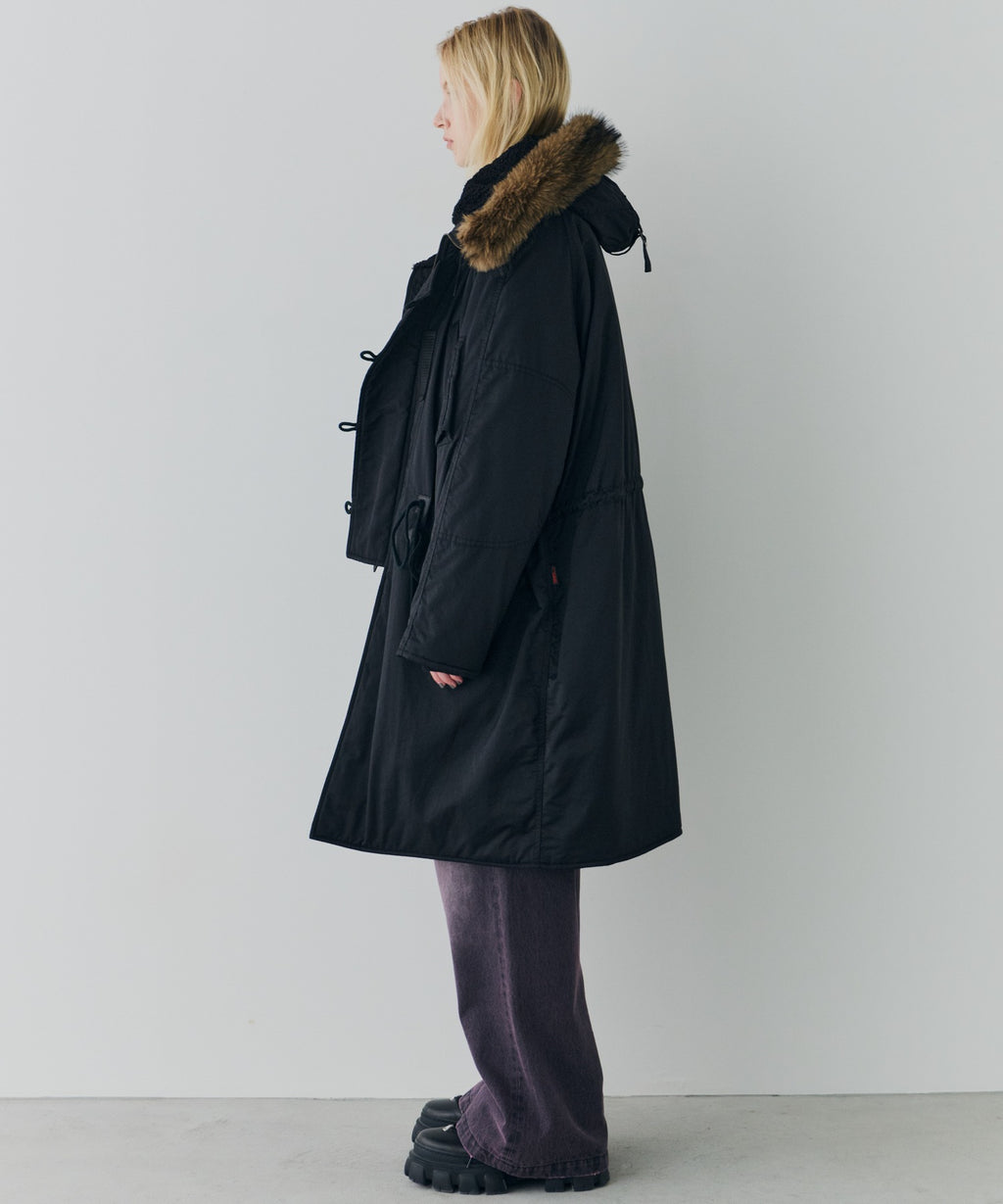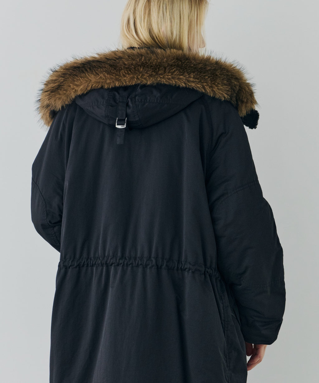 ・フード周りには毛足の長い色がミックスしたフェイクファーを取り付け、フードの裏地にはボアを張り保温性に優れた仕様