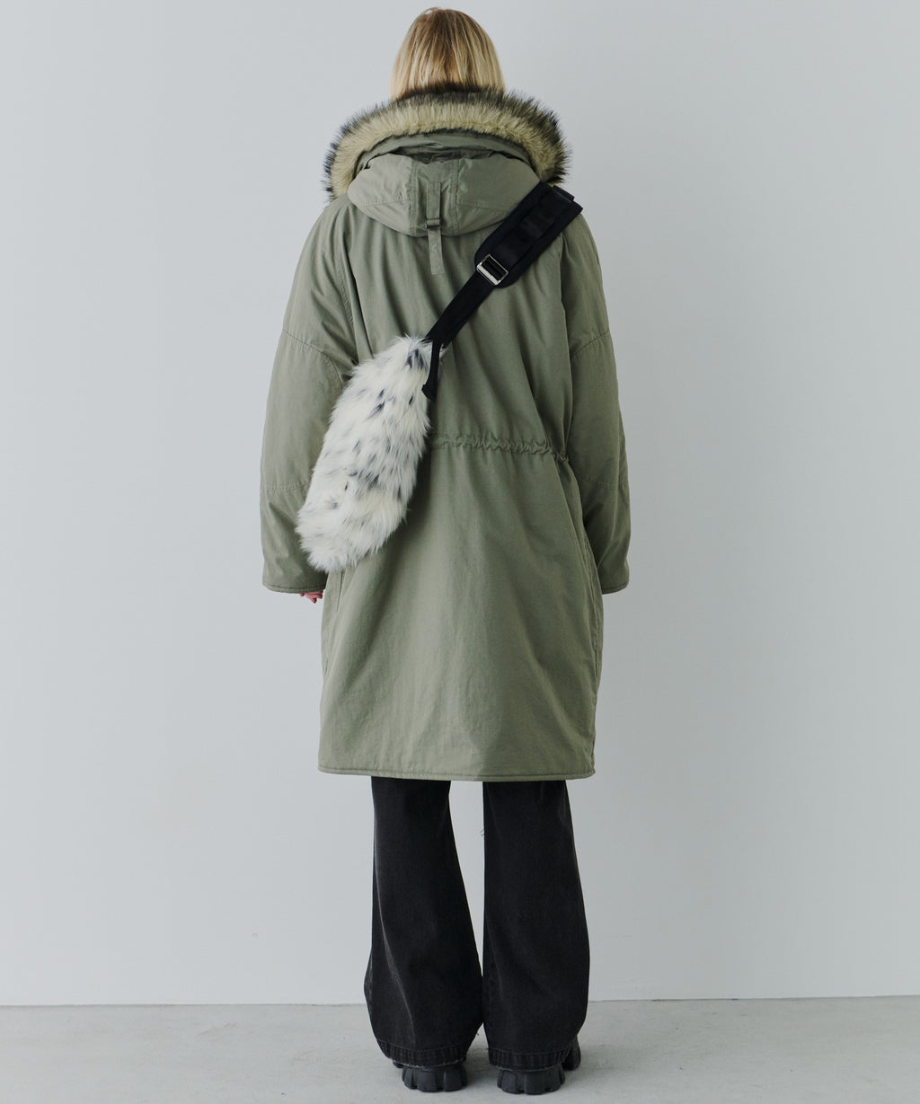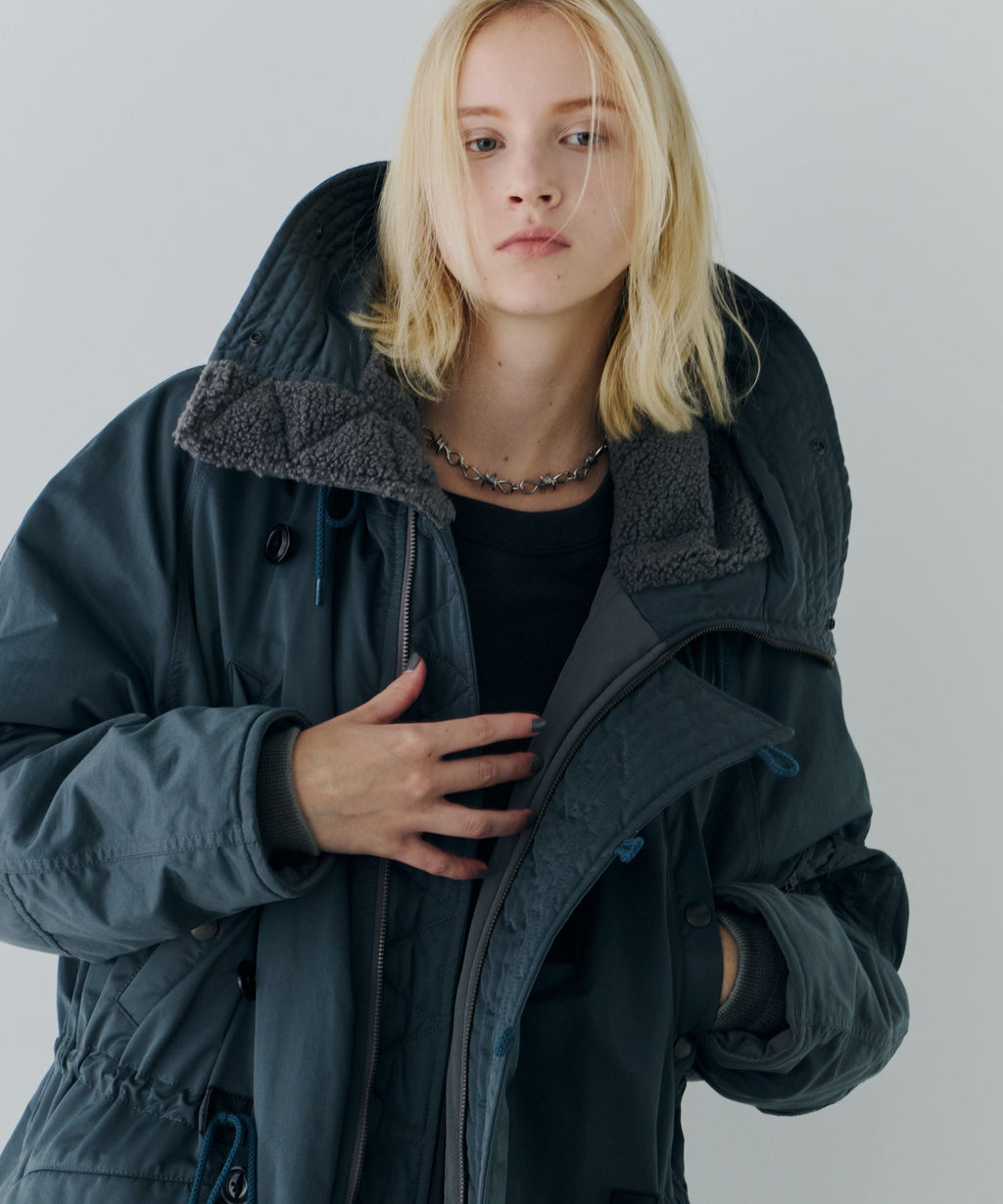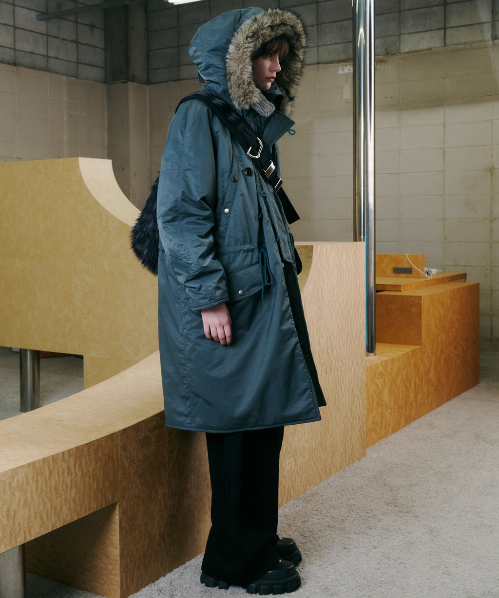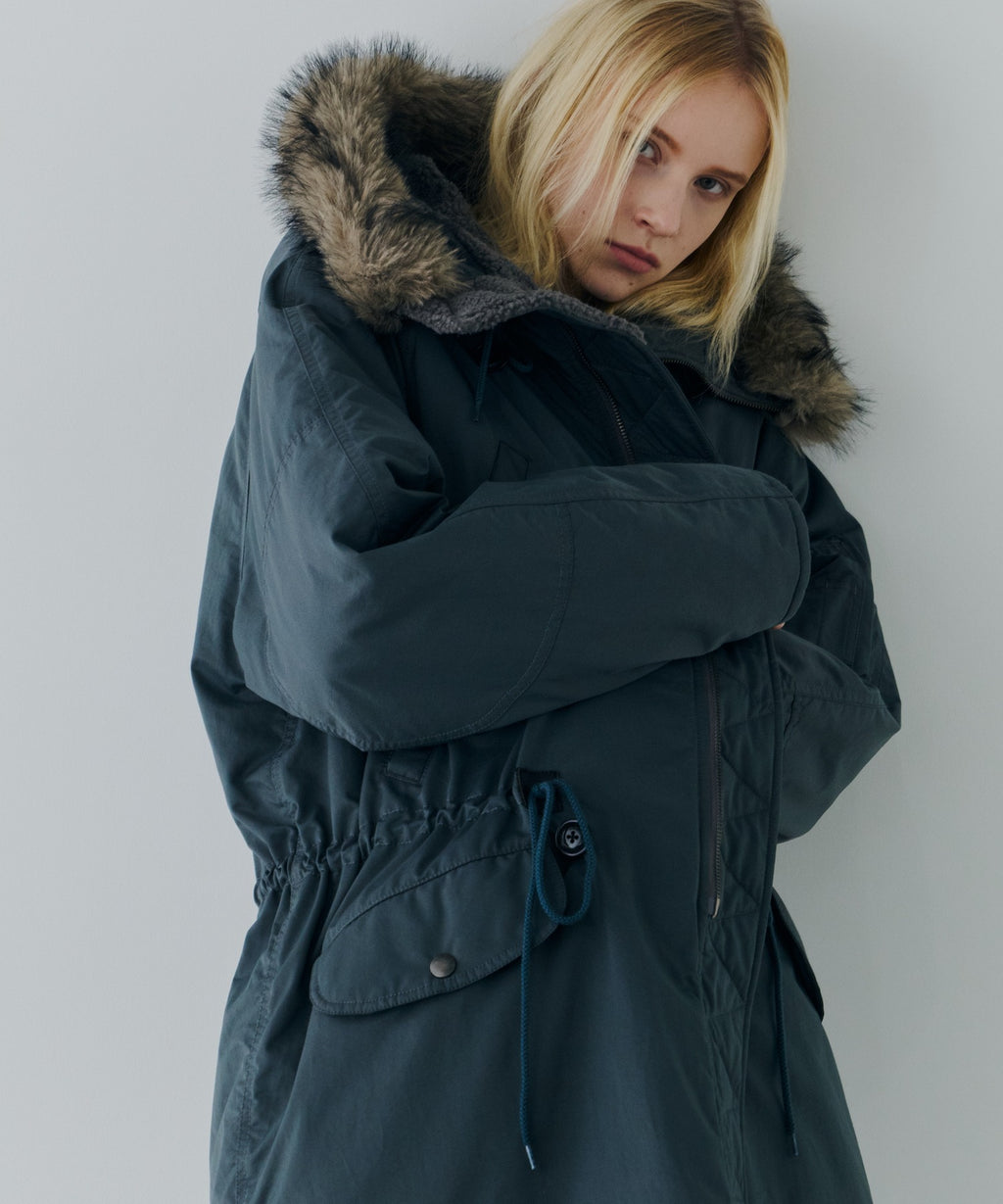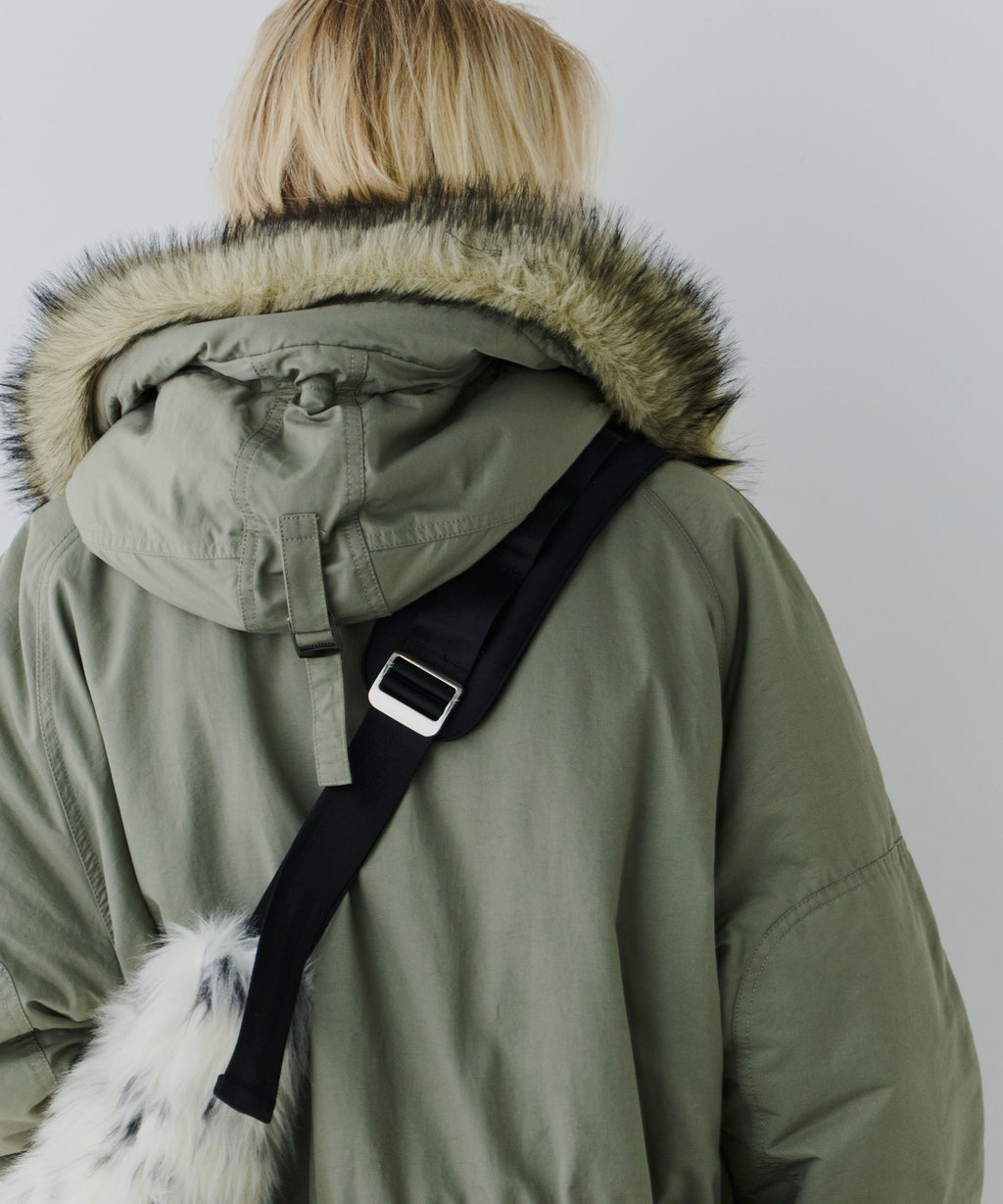 ・フード周りには毛足の長い色がミックスしたフェイクファーを取り付け、フードの裏地にはボアを張り保温性に優れた仕様