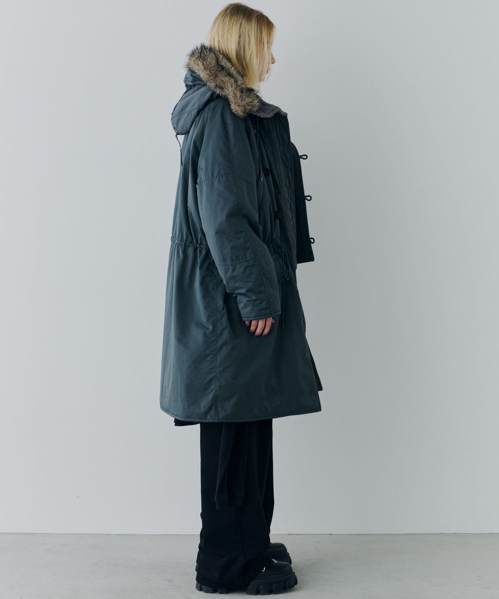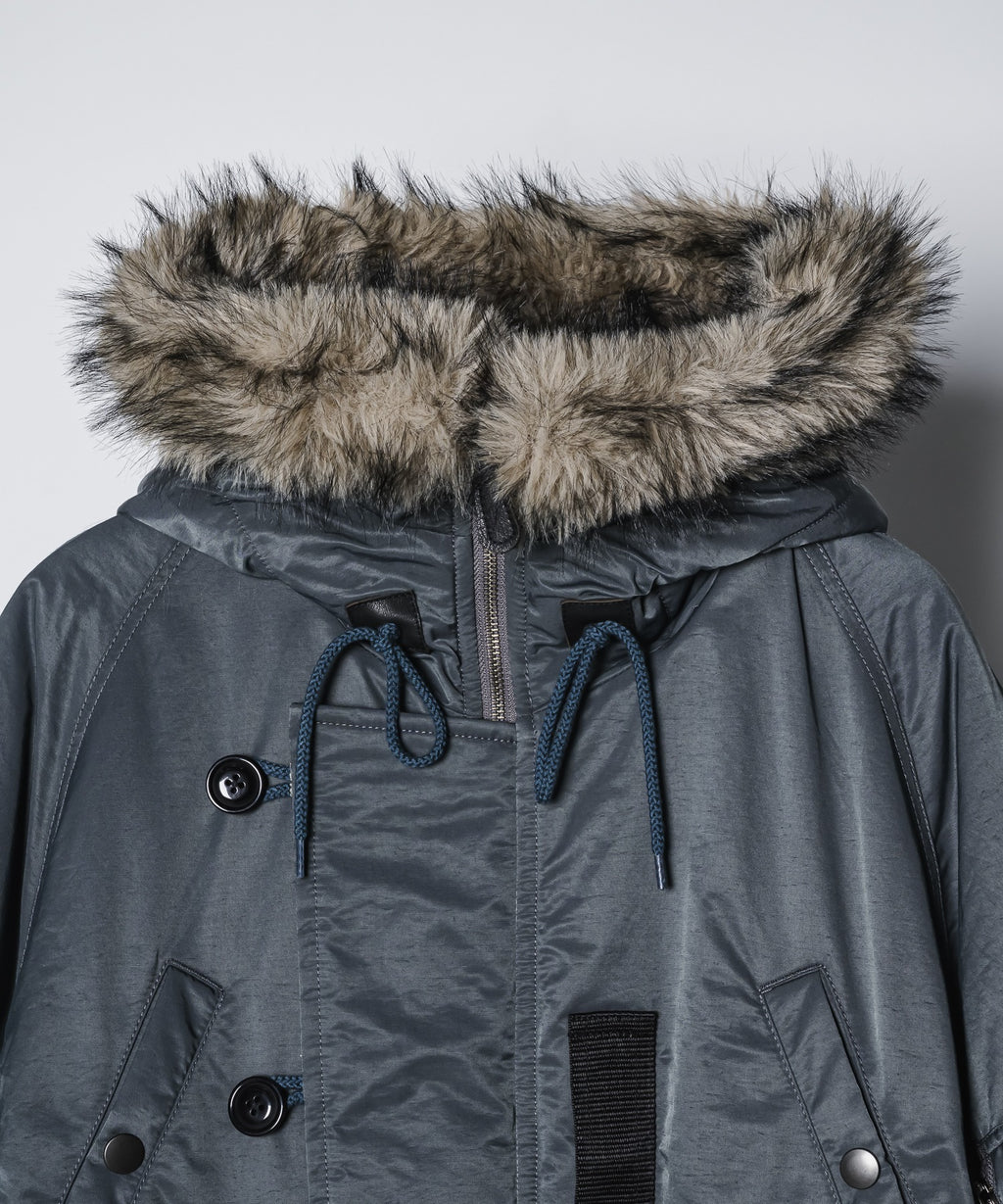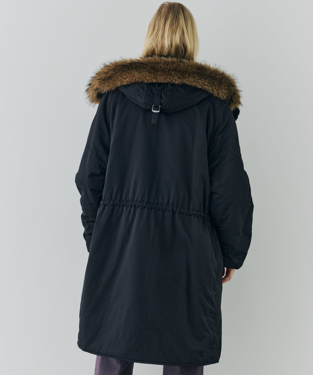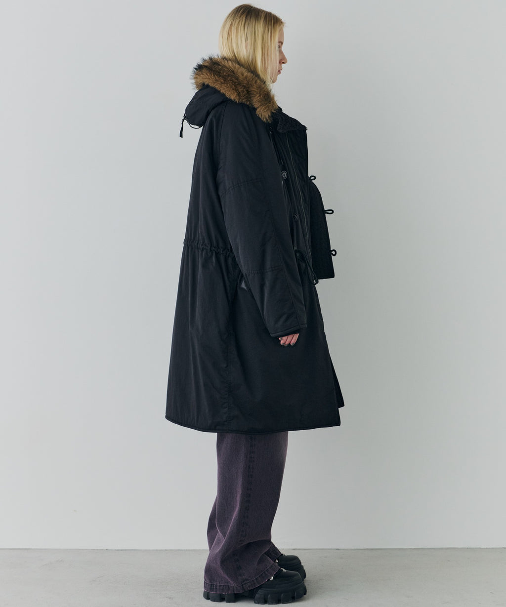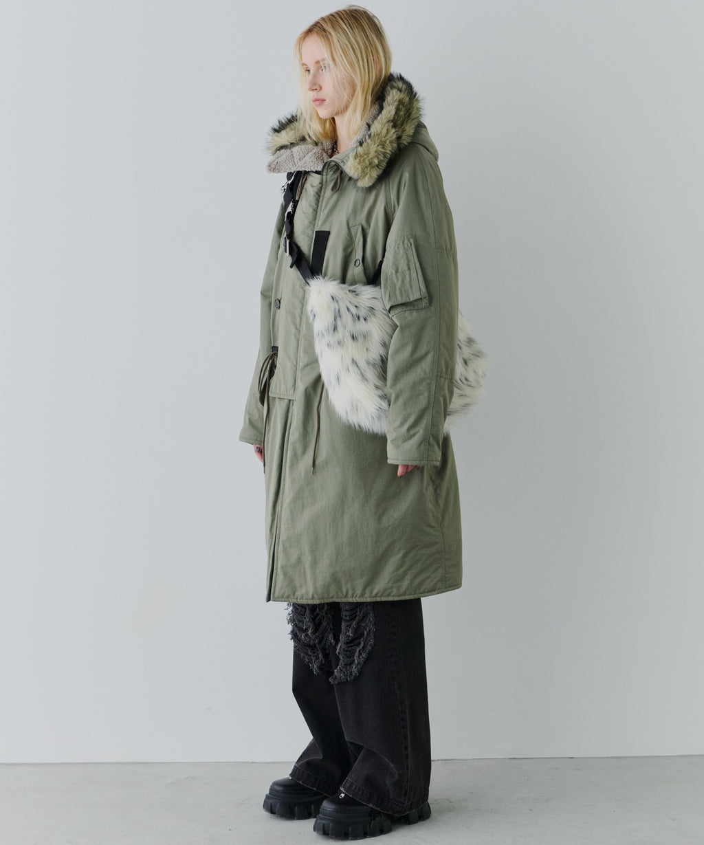 ・フード周りには毛足の長い色がミックスしたフェイクファーを取り付け、フードの裏地にはボアを張り保温性に優れた仕様