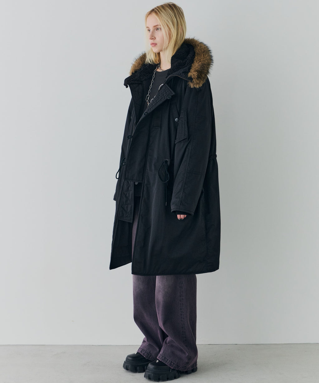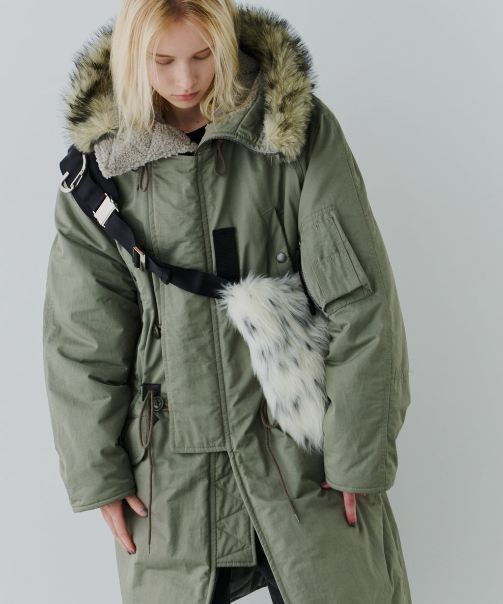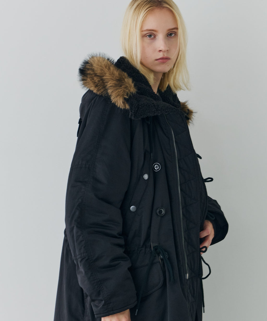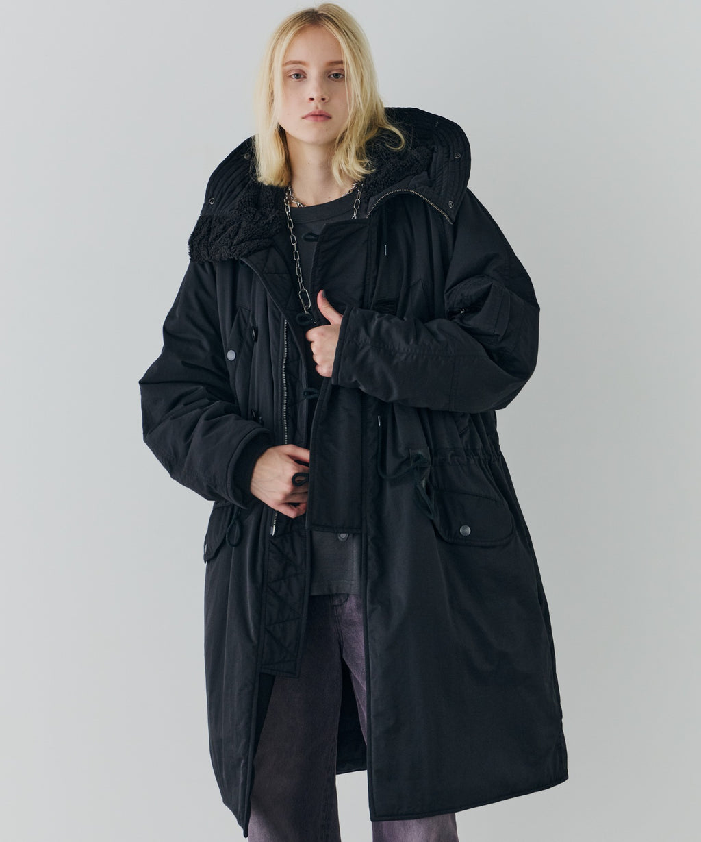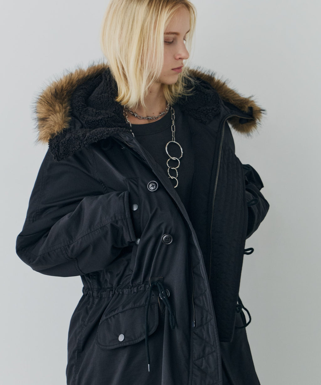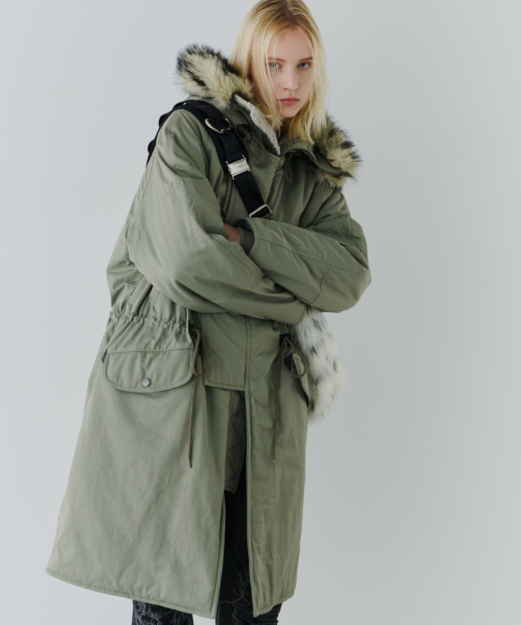 ・フード周りには毛足の長い色がミックスしたフェイクファーを取り付け、フードの裏地にはボアを張り保温性に優れた仕様