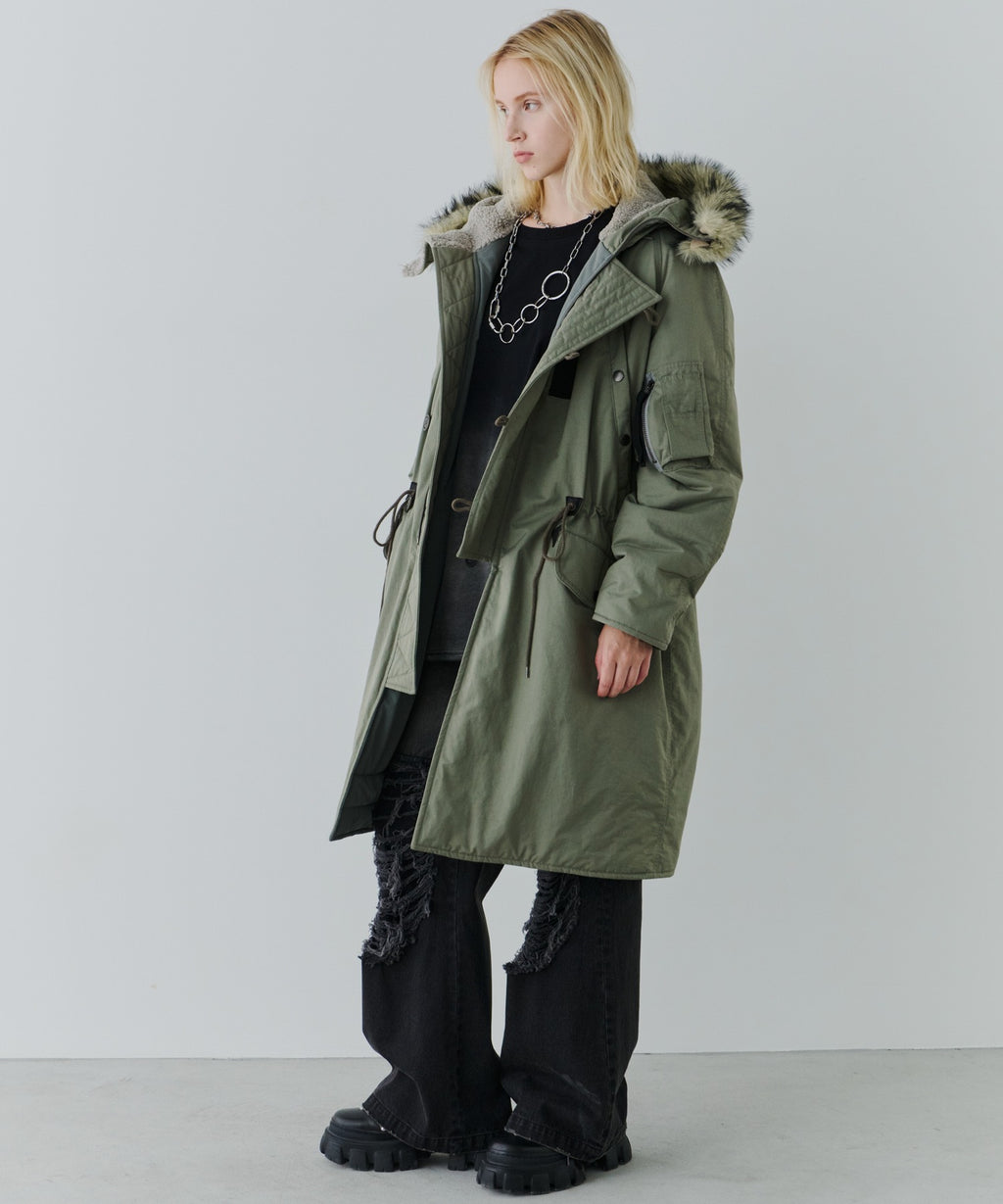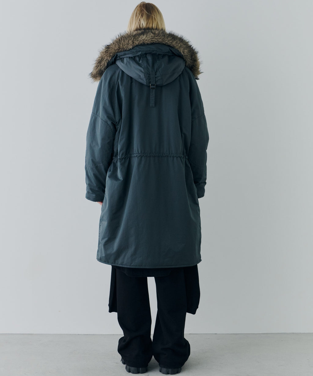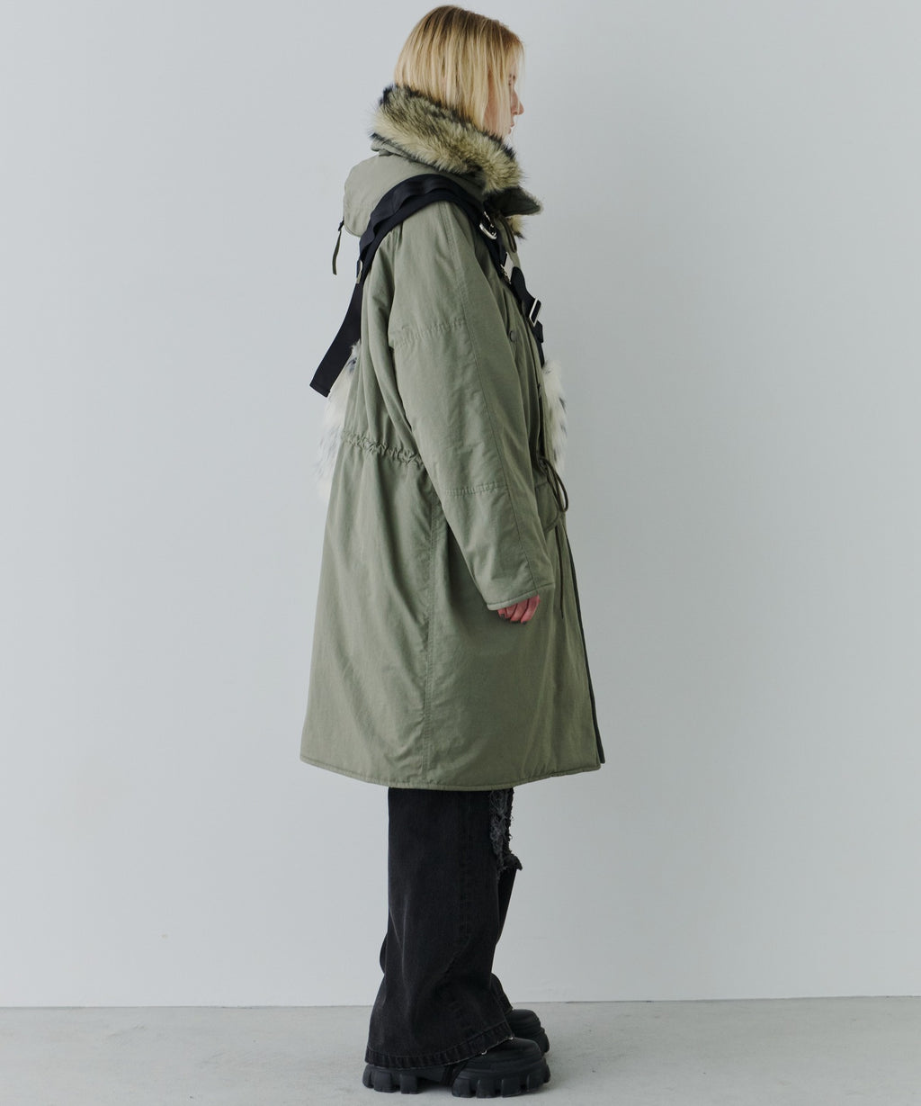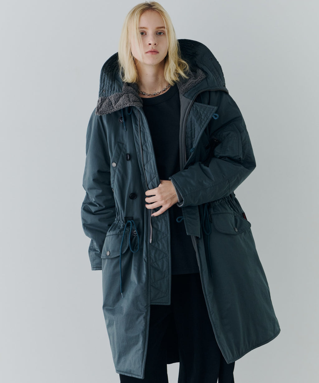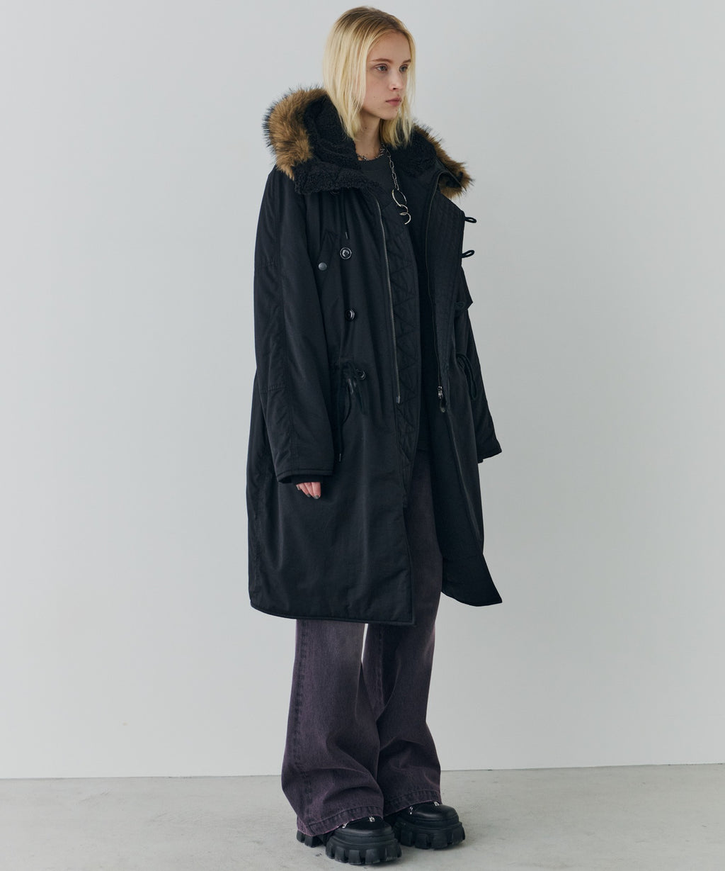 ・フード周りには毛足の長い色がミックスしたフェイクファーを取り付け、フードの裏地にはボアを張り保温性に優れた仕様
