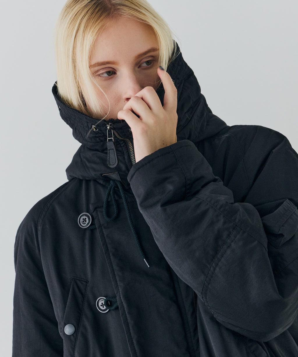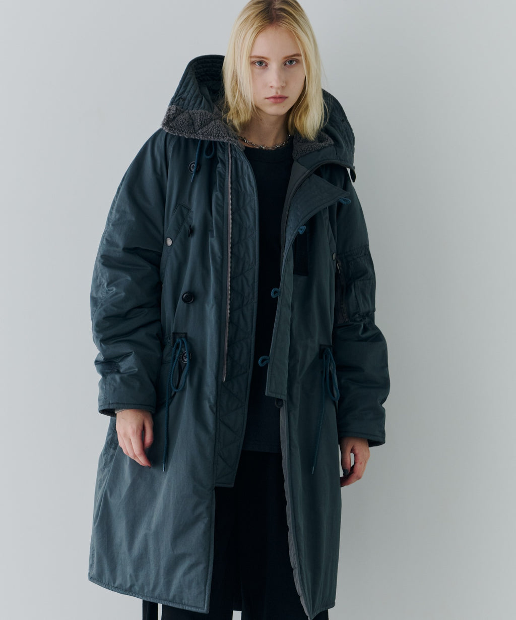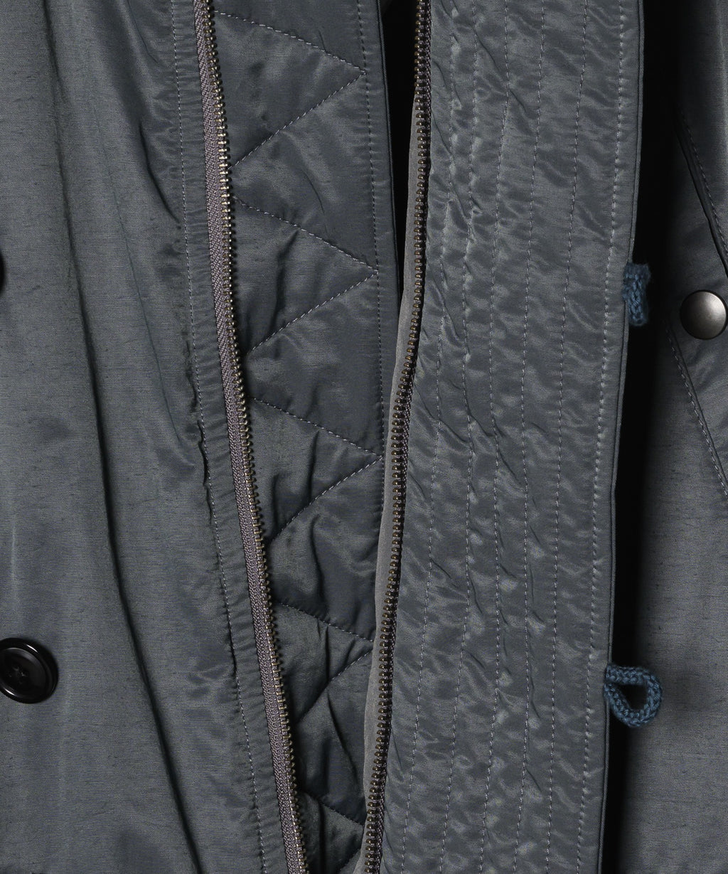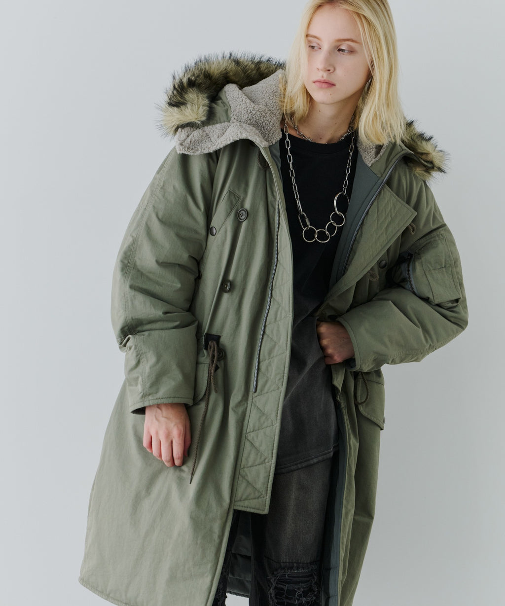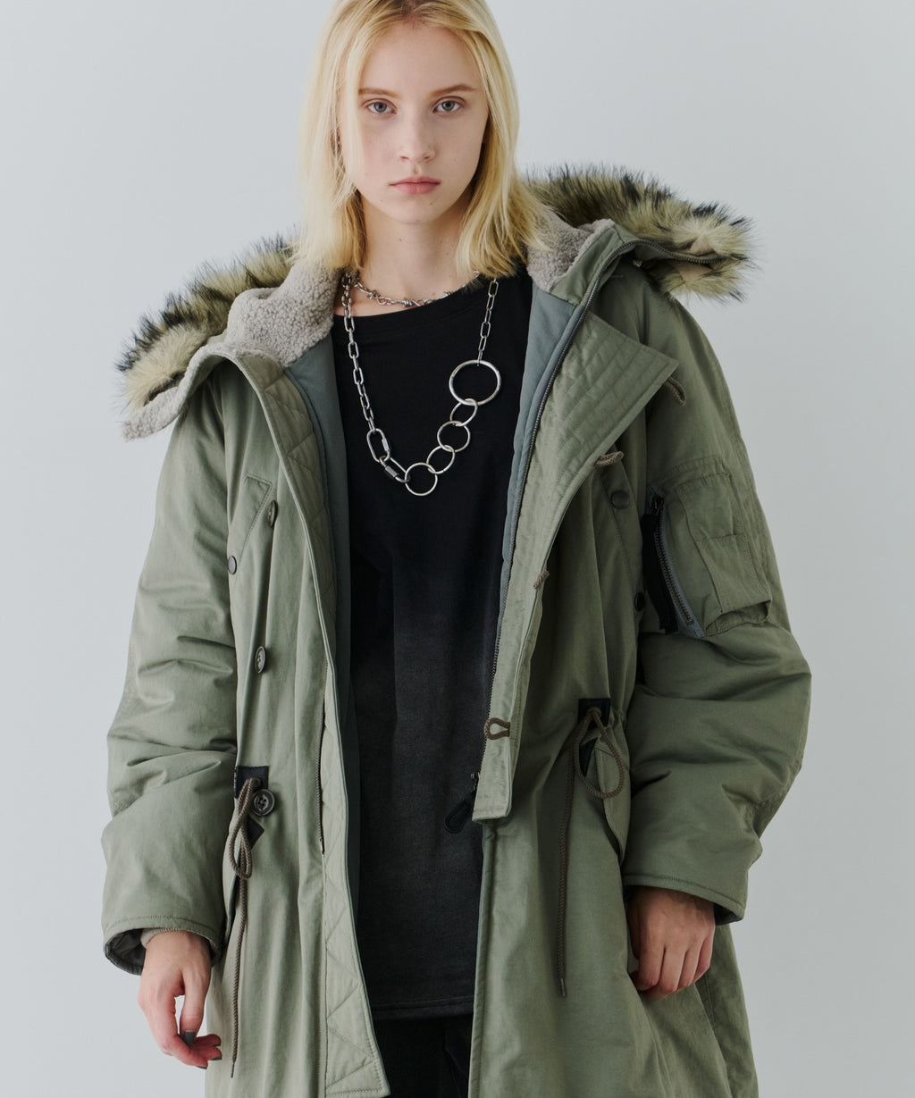 ・フード周りには毛足の長い色がミックスしたフェイクファーを取り付け、フードの裏地にはボアを張り保温性に優れた仕様