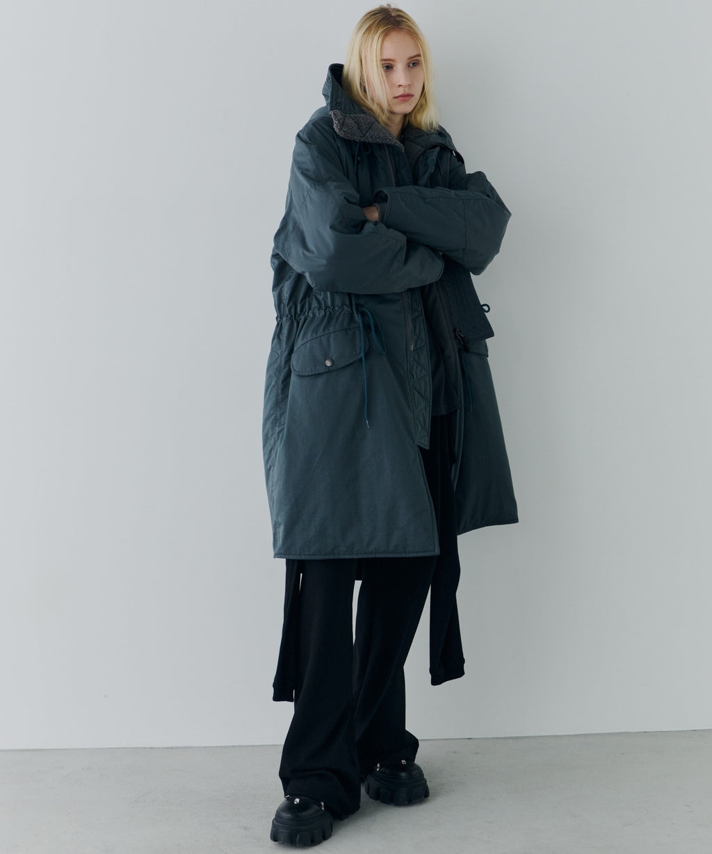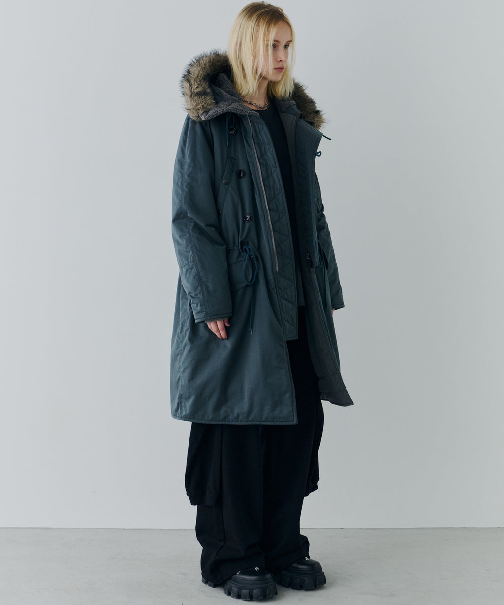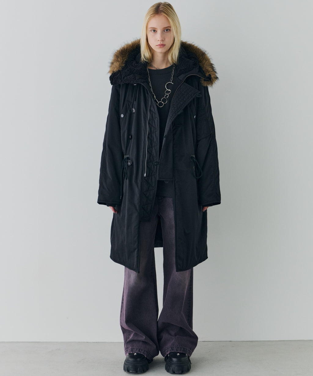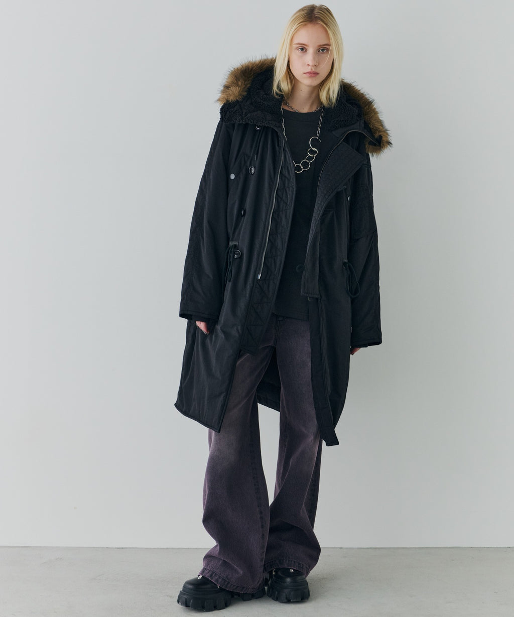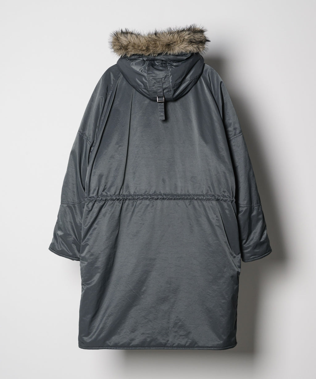 ・フード周りには毛足の長い色がミックスしたフェイクファーを取り付け、フードの裏地にはボアを張り保温性に優れた仕様