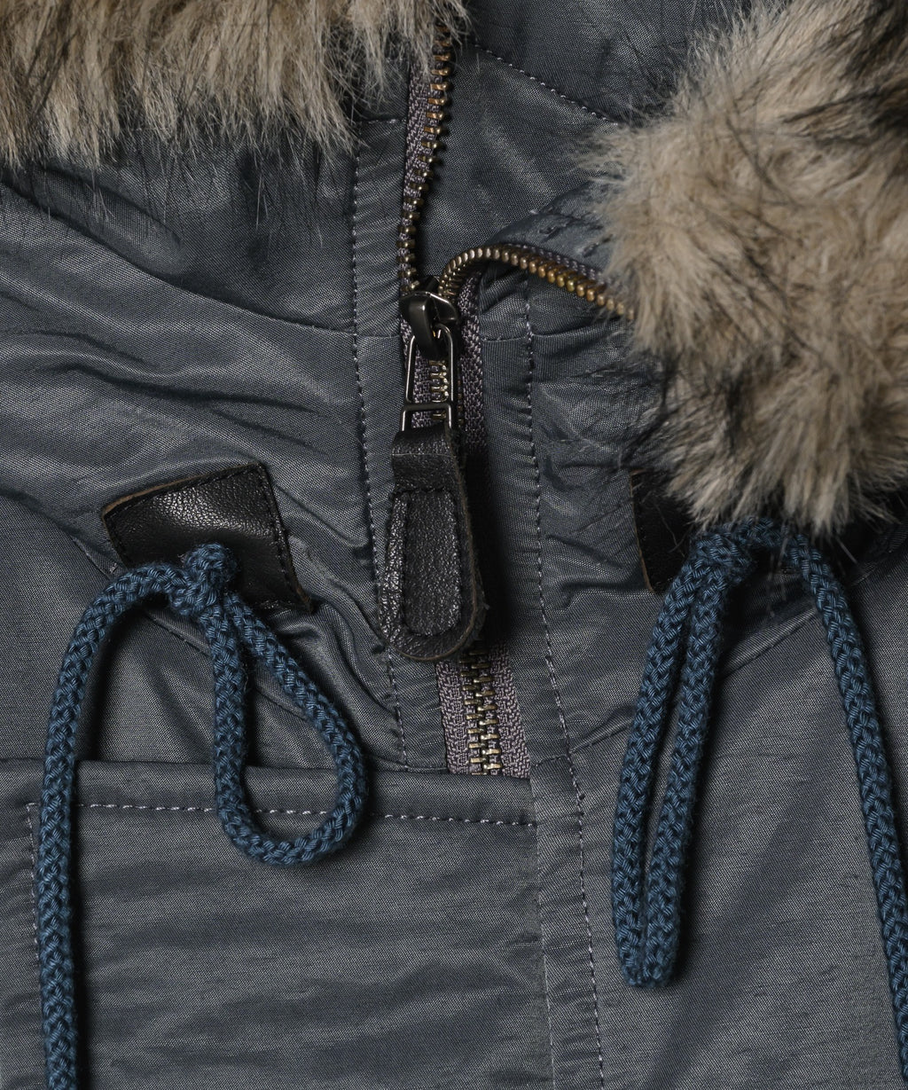 ・左袖のポケットのジップの引手には太目のテープ、センタージップの引手・フードとウエストスピンドル出口には本革パーツ