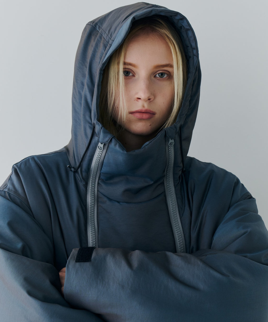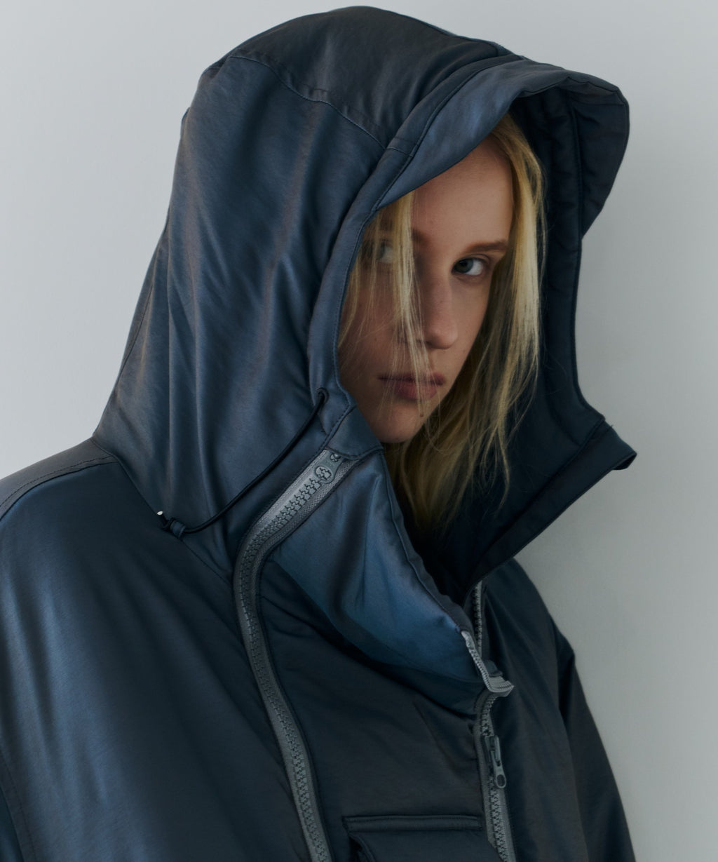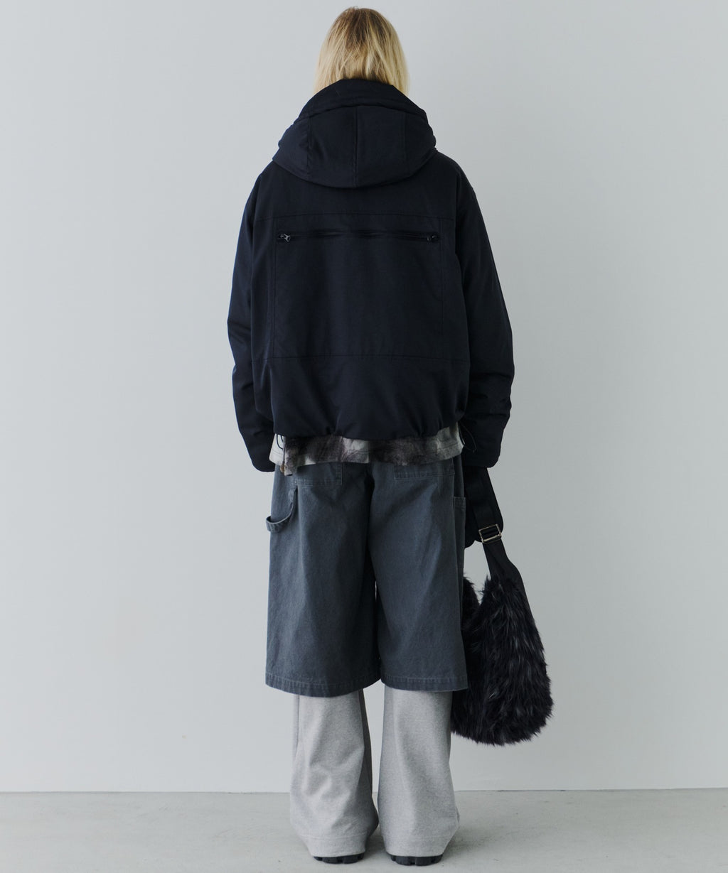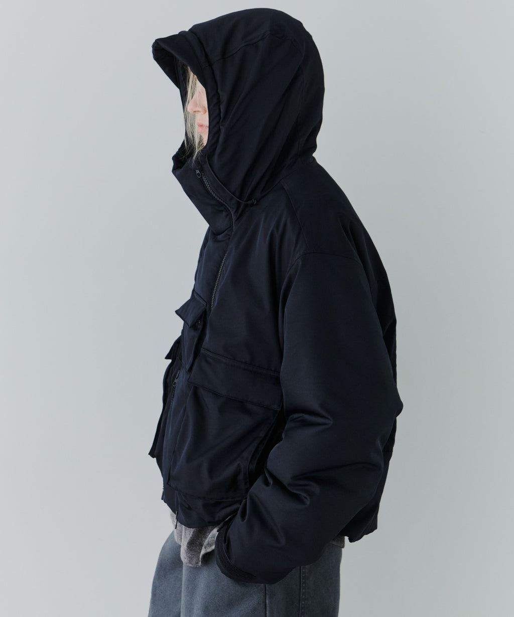 ・中綿入りのボリュームのあるフードには小さいツバ付き