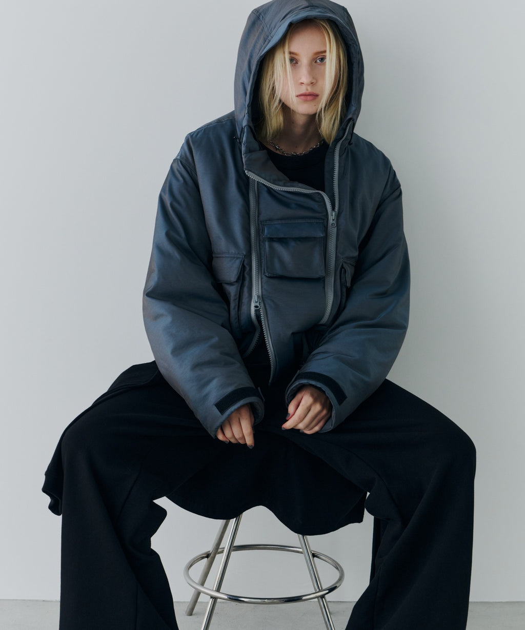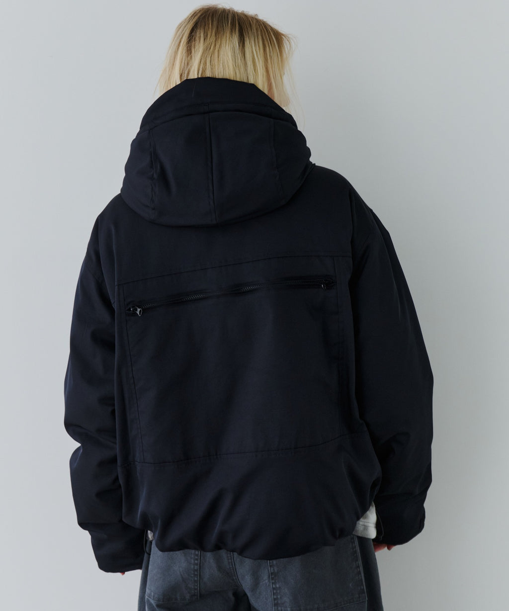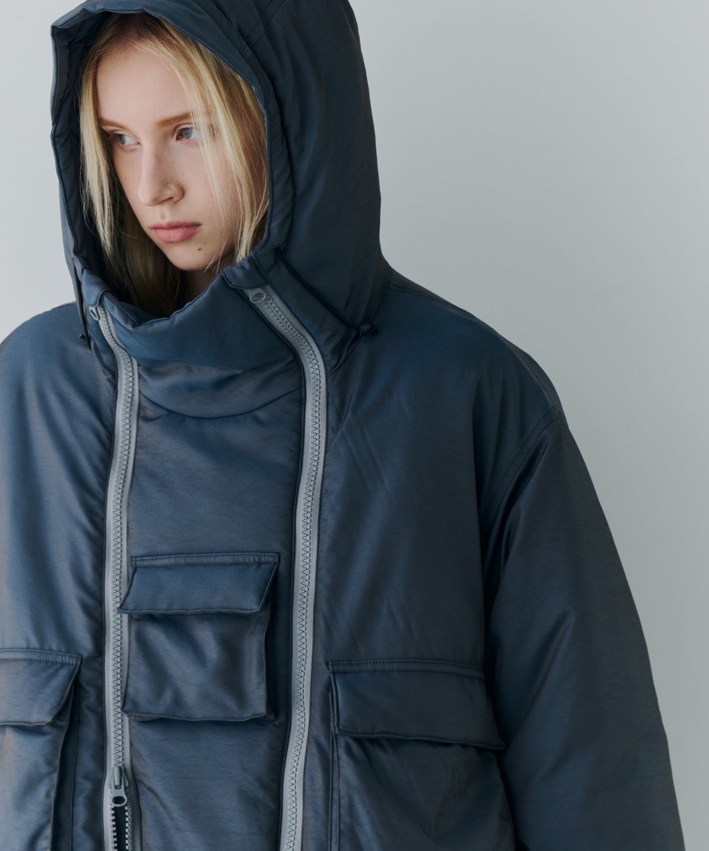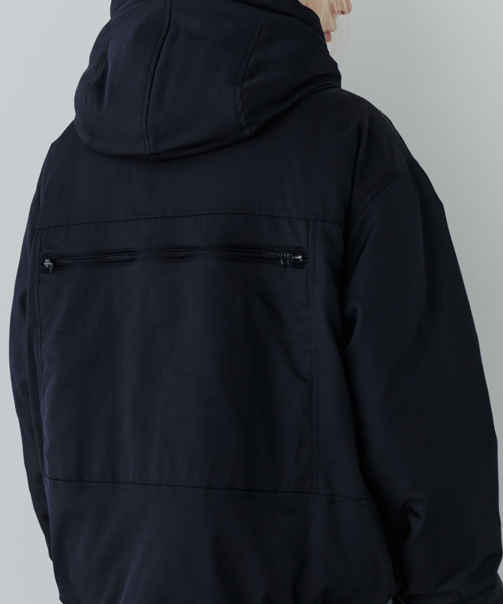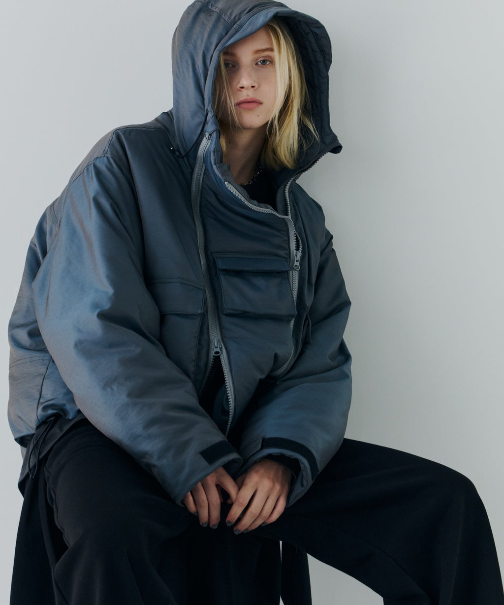 ・中綿入りのボリュームのあるフードには小さいツバ付き
