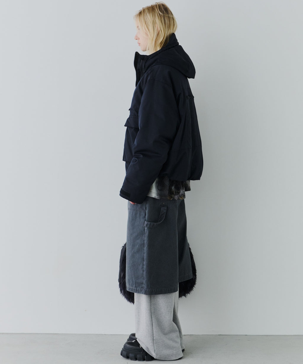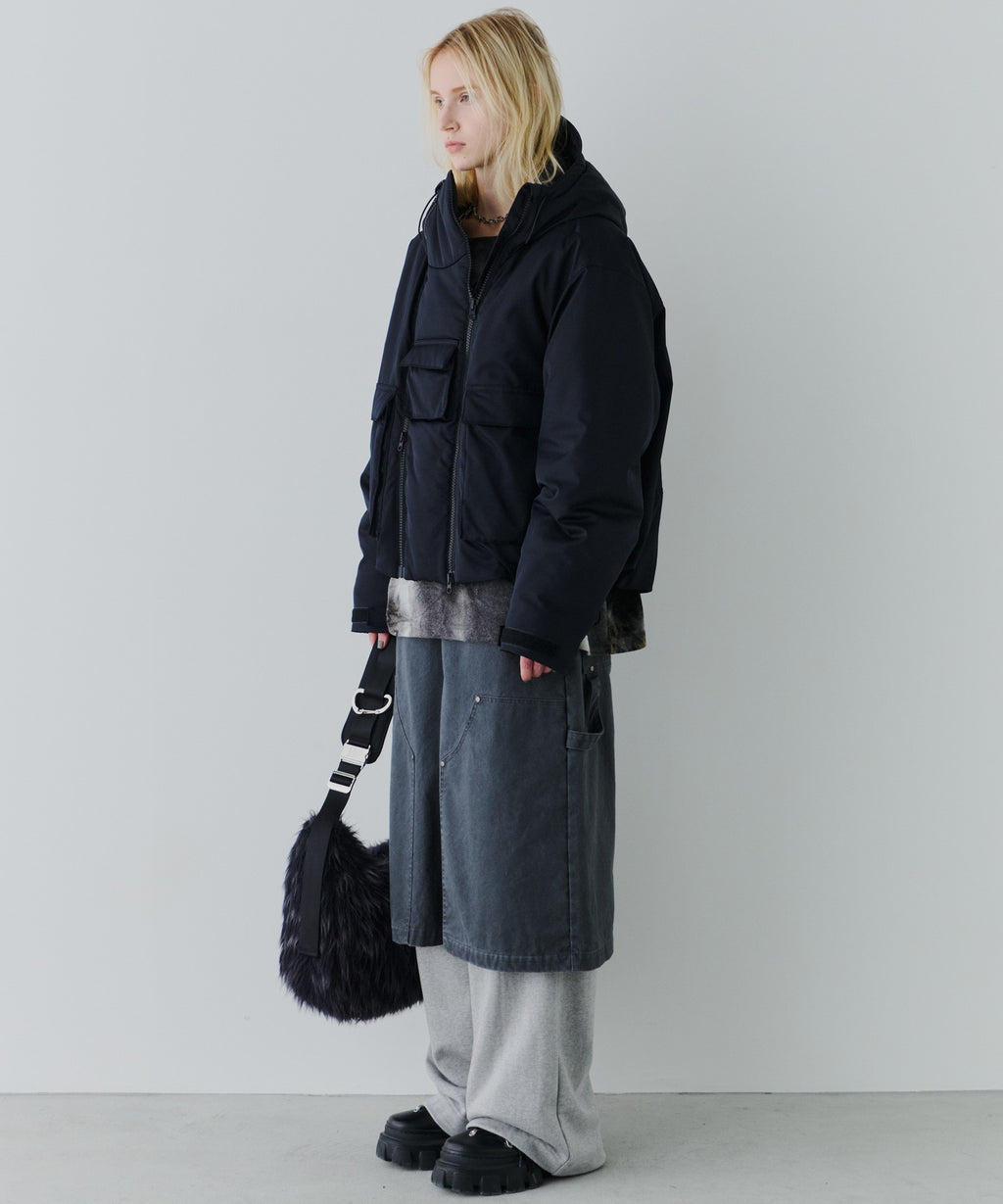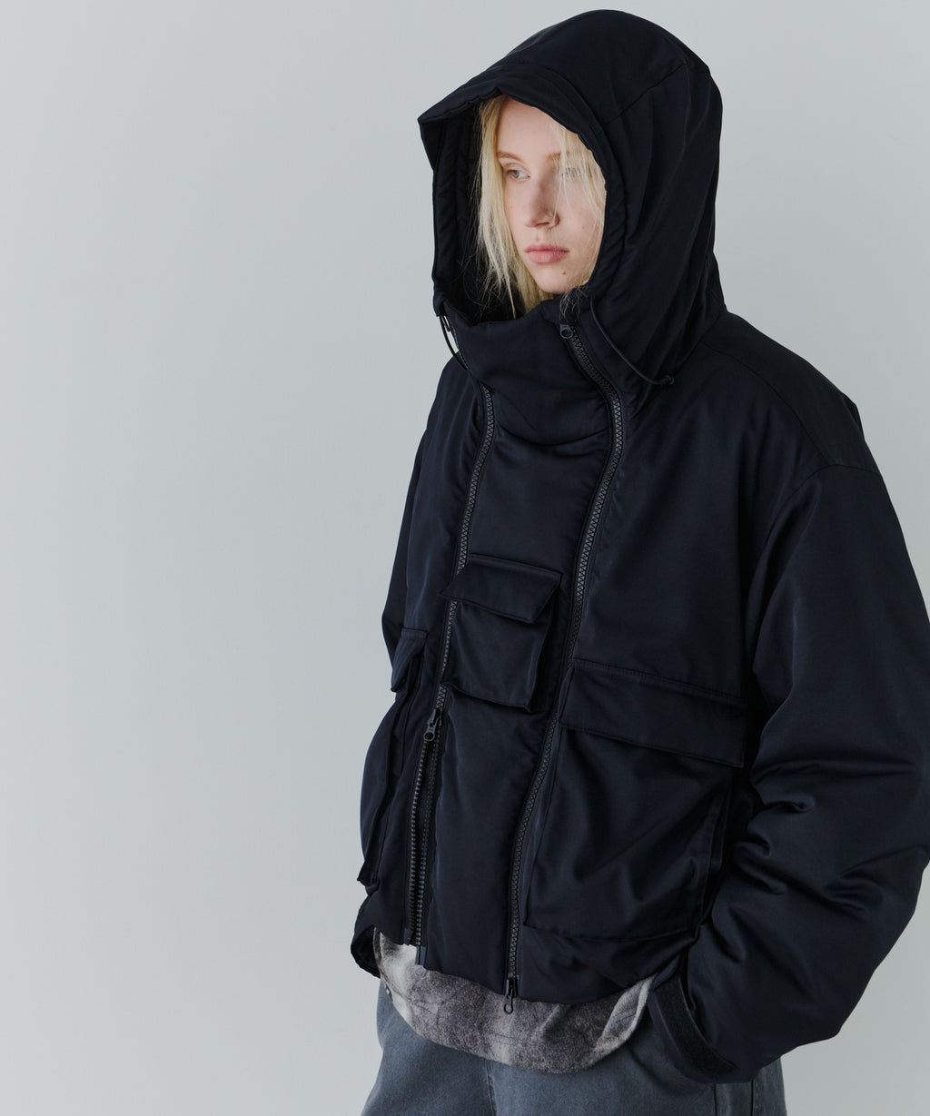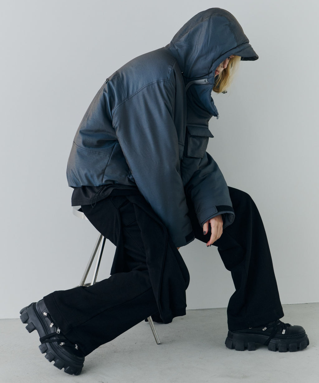 ・中綿入りのボリュームのあるフードには小さいツバ付き