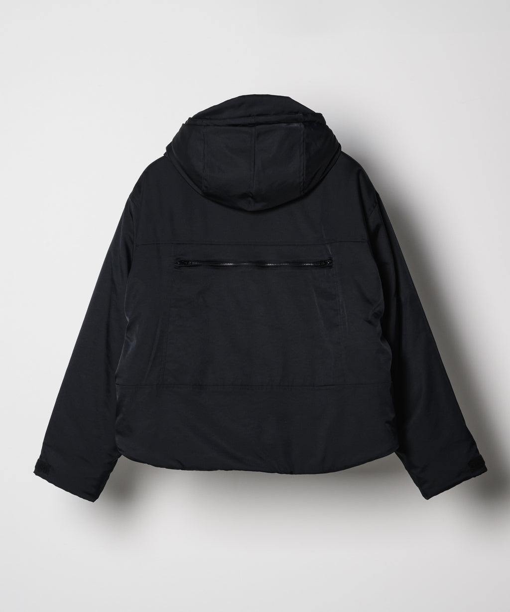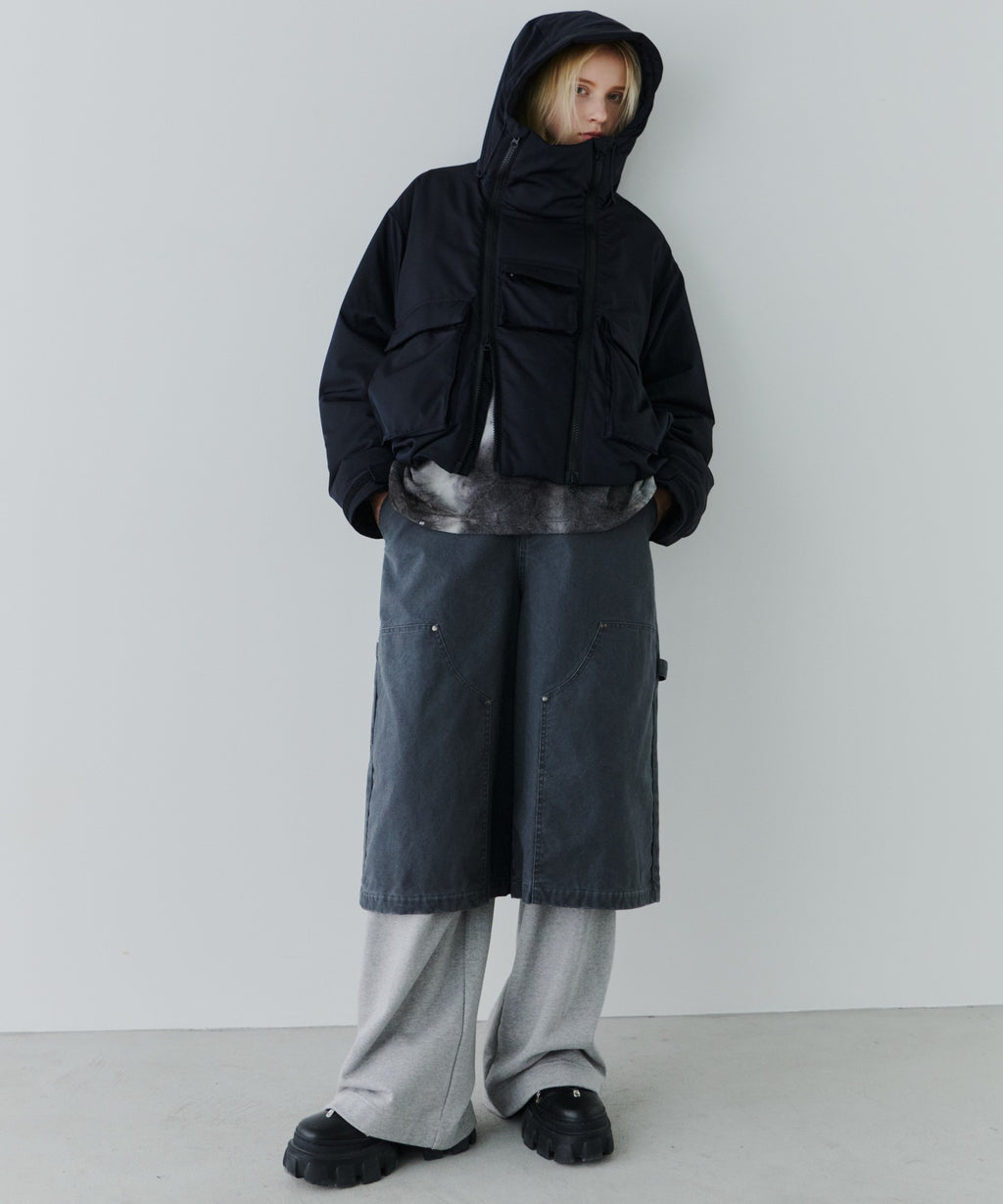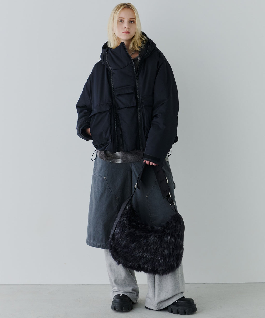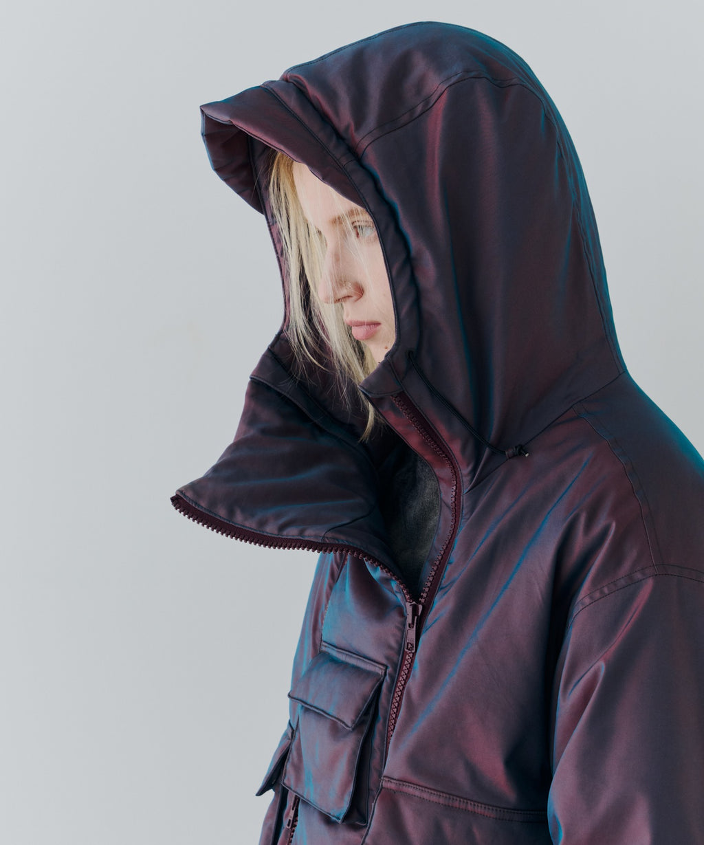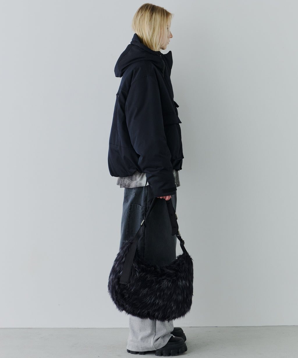 ・中綿入りのボリュームのあるフードには小さいツバ付き