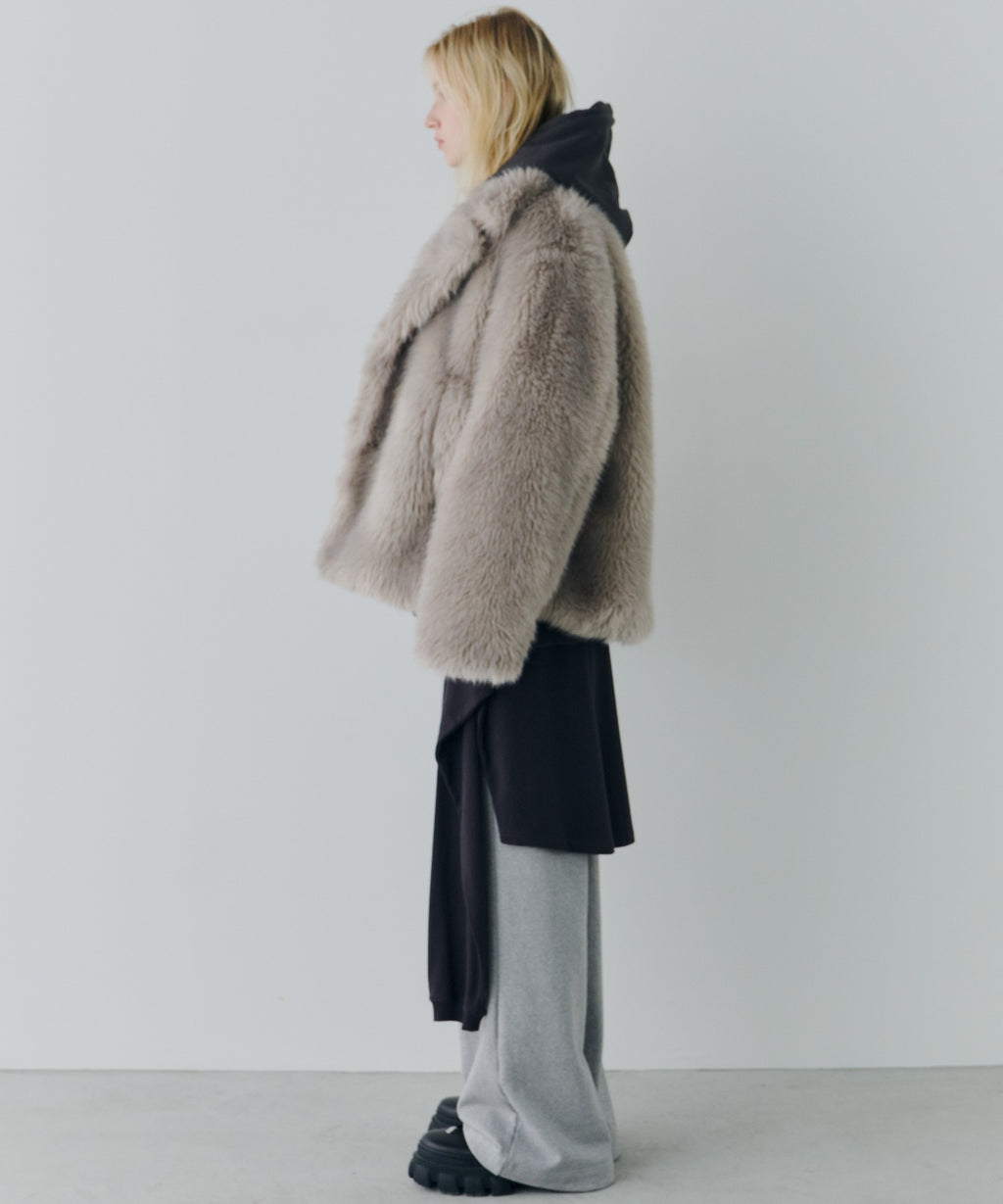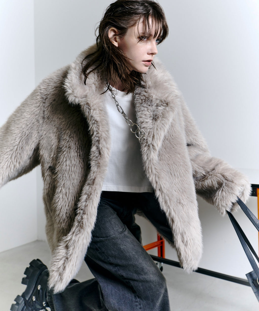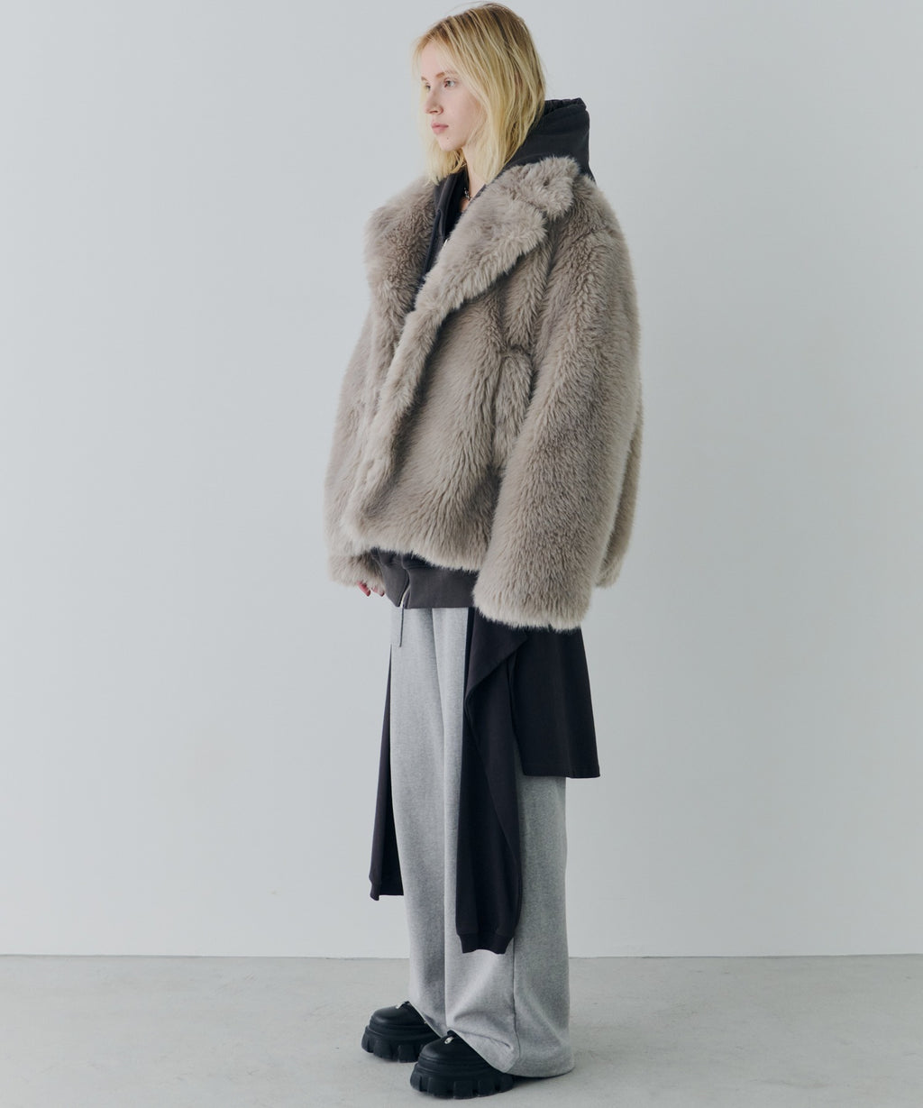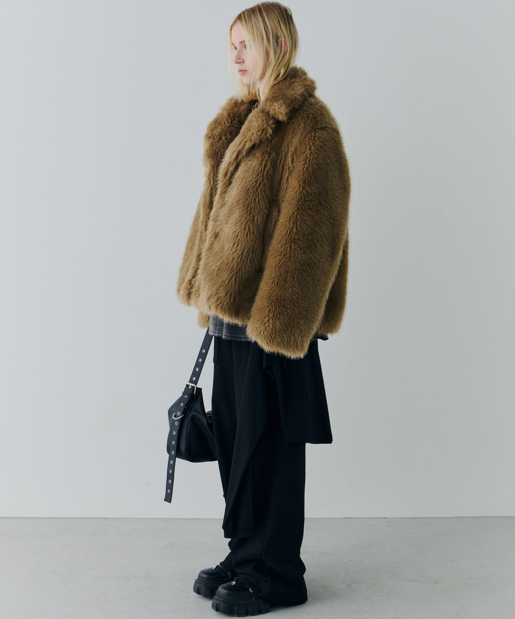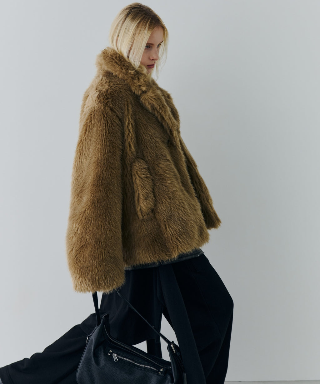・ワイドパンツなどと合わせやすいく、身幅はゆとりがあり中に着こみやすくゆったり着用し易いサイズ感に仕上げたファーコート