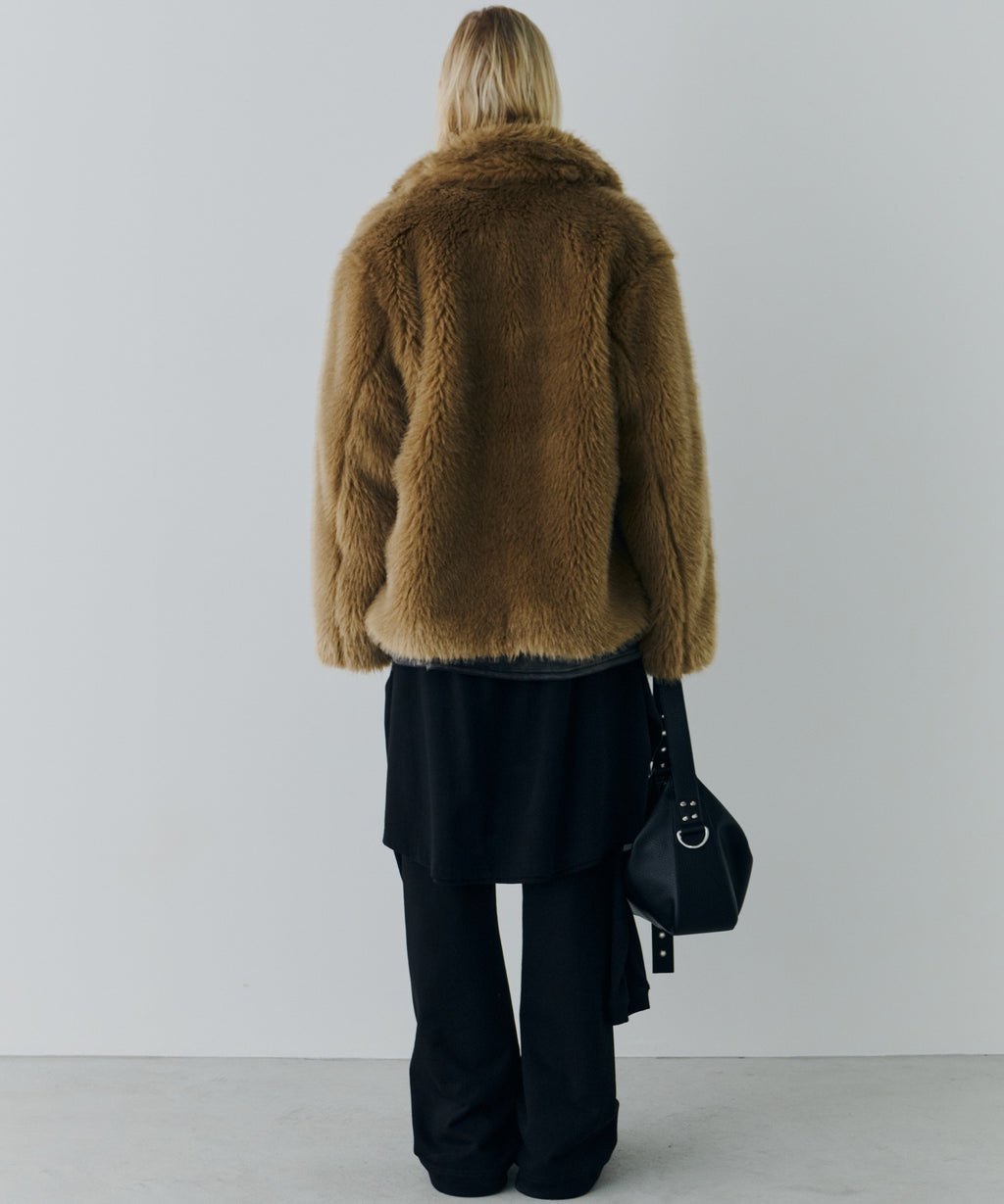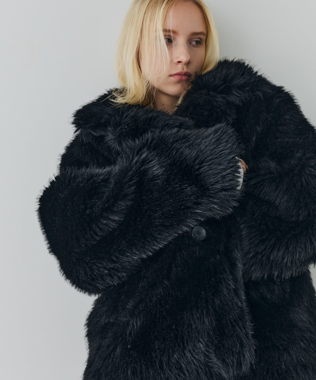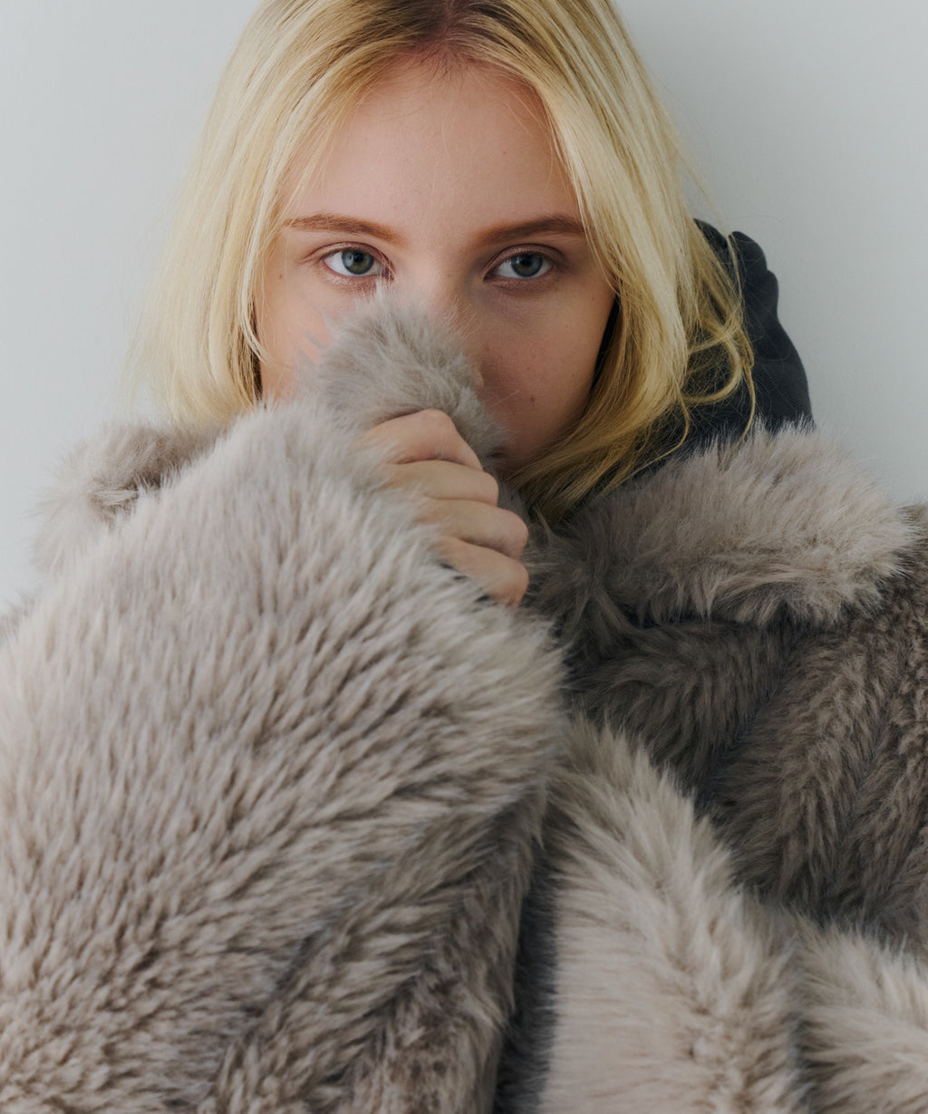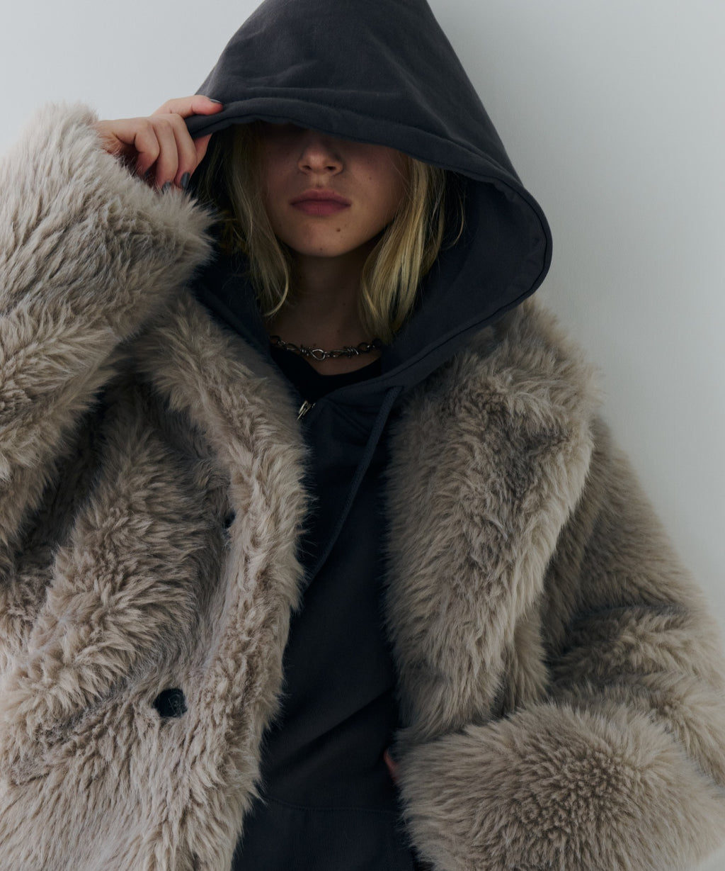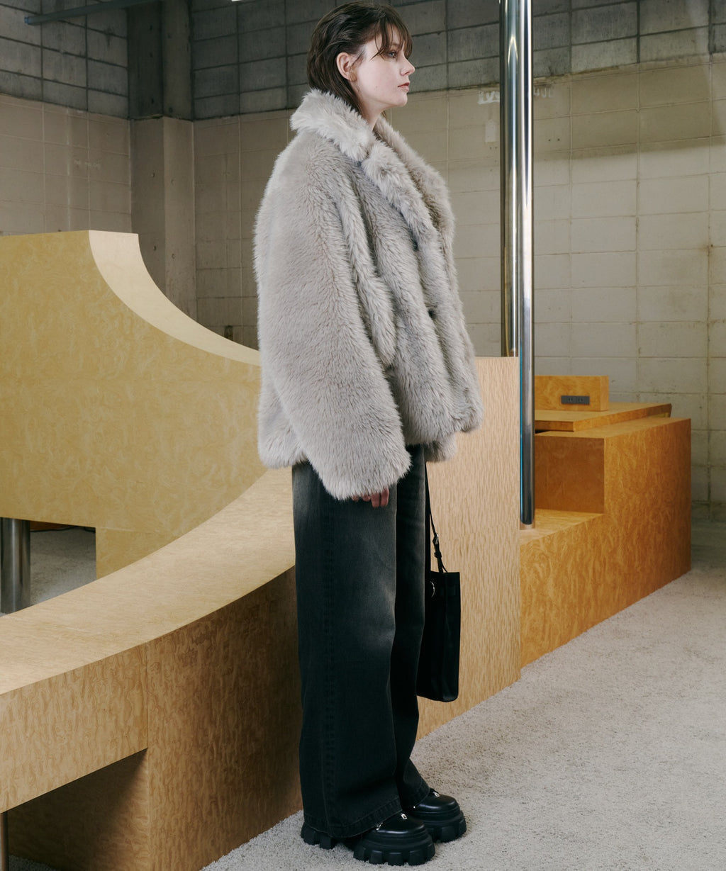 ・ワイドパンツなどと合わせやすいく、身幅はゆとりがあり中に着こみやすくゆったり着用し易いサイズ感に仕上げたファーコート