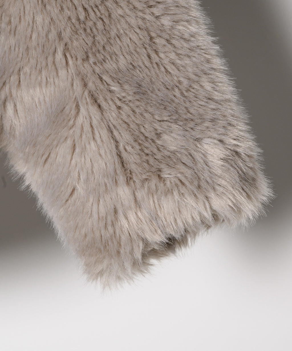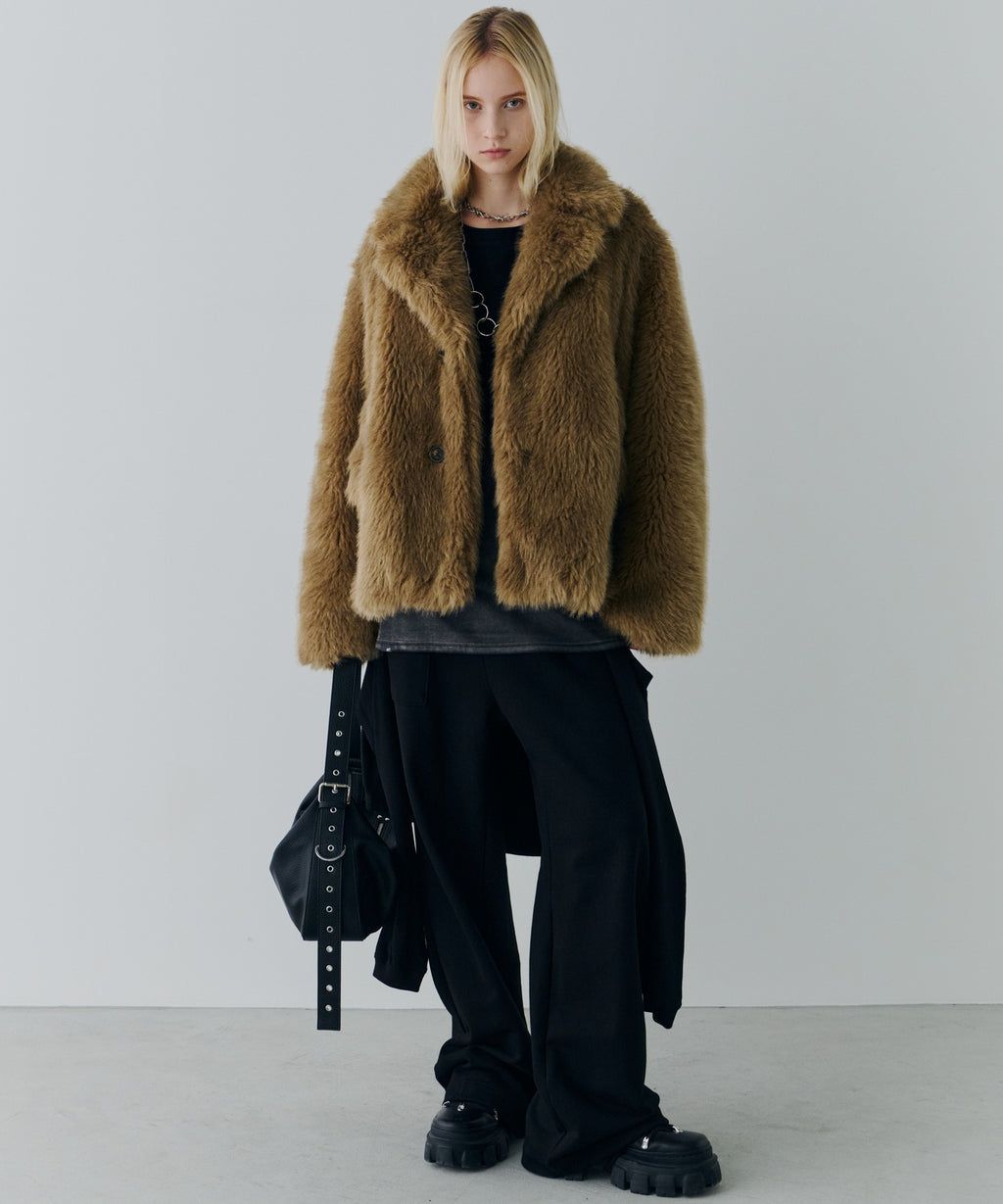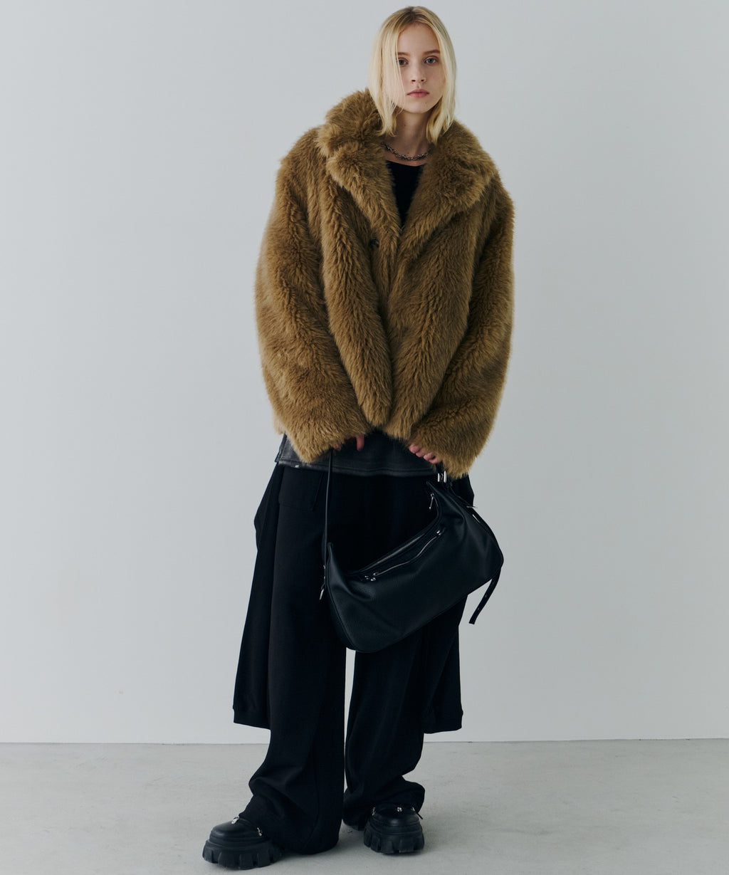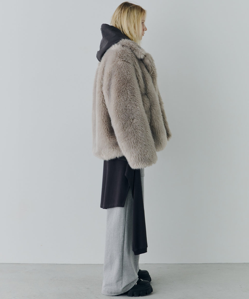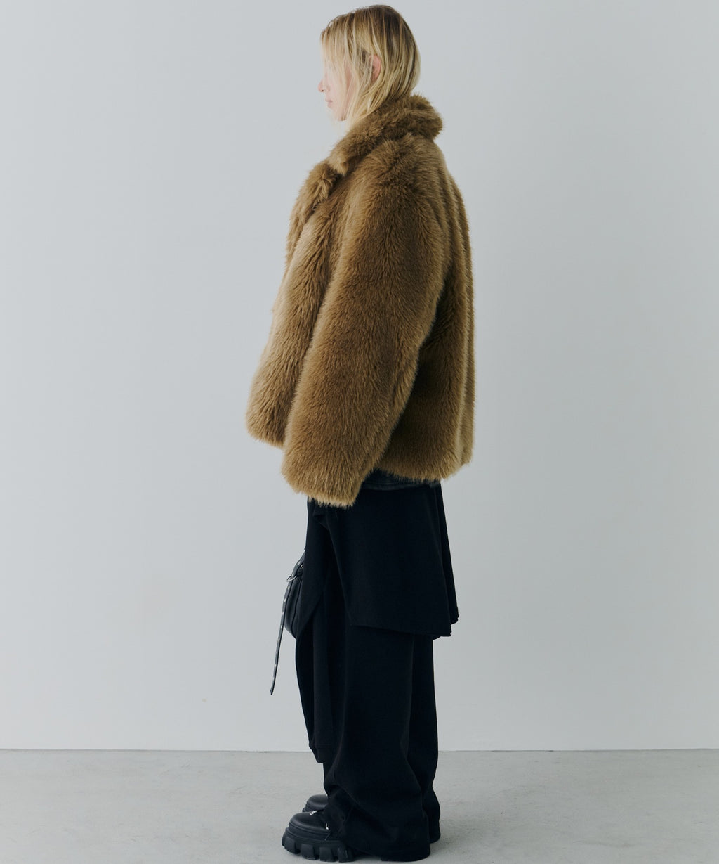 ・ワイドパンツなどと合わせやすいく、身幅はゆとりがあり中に着こみやすくゆったり着用し易いサイズ感に仕上げたファーコート