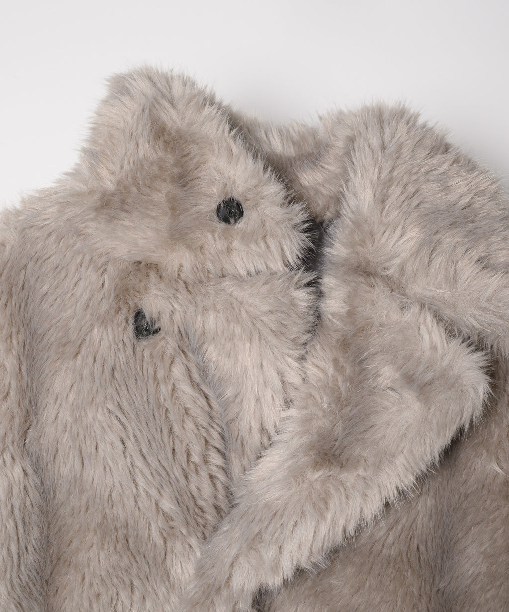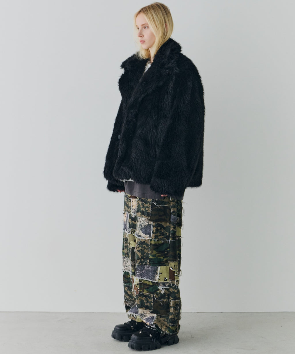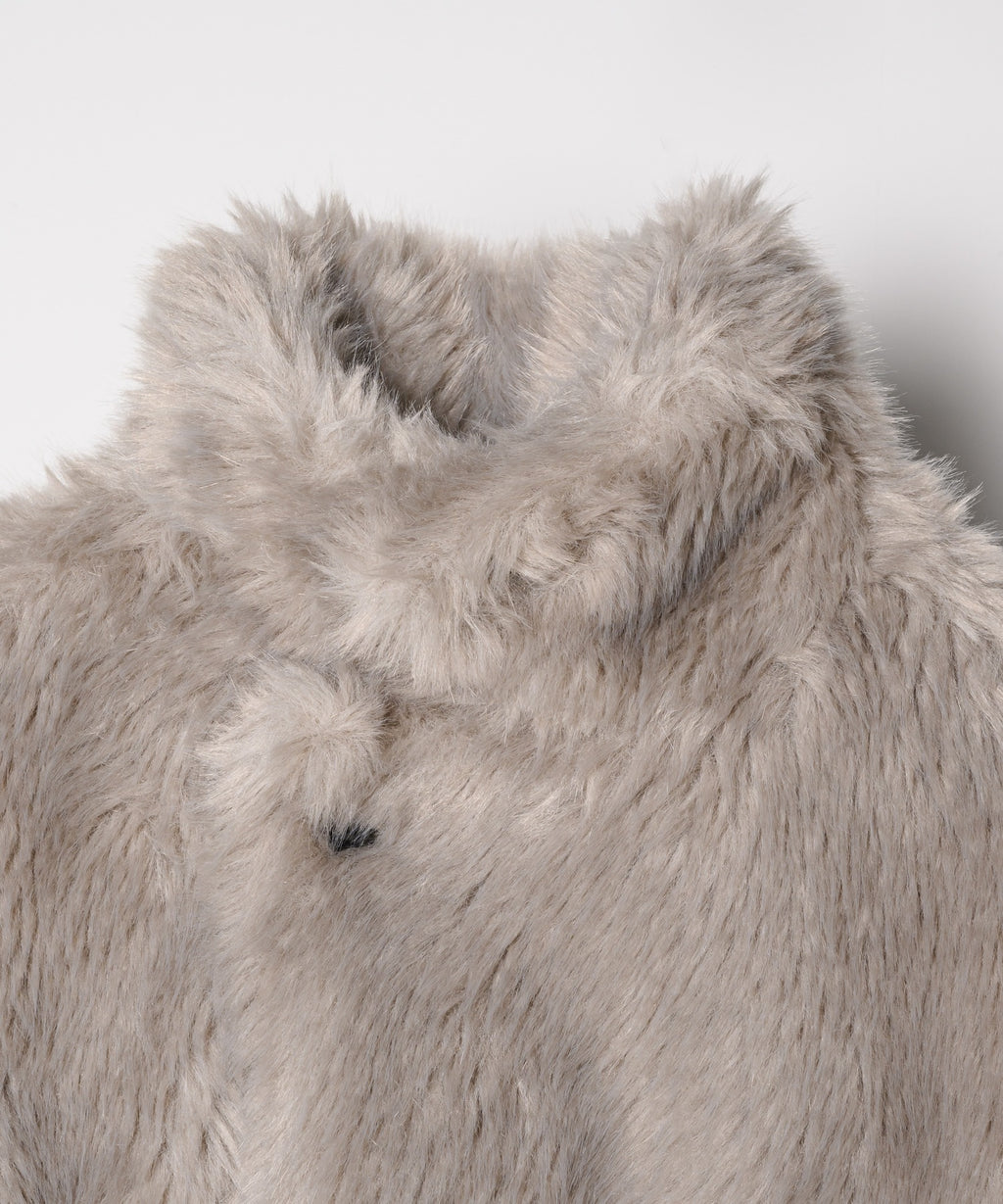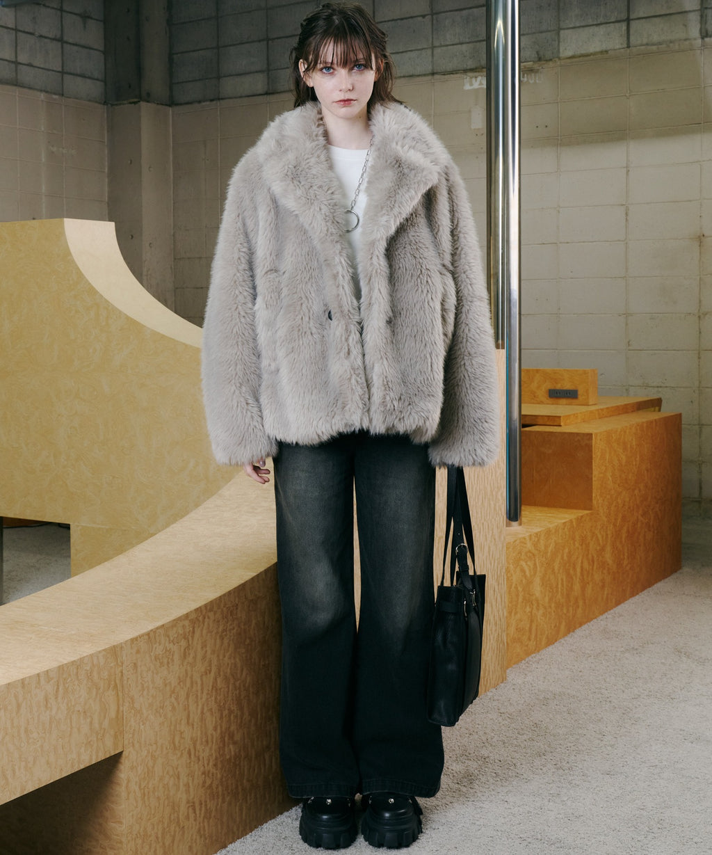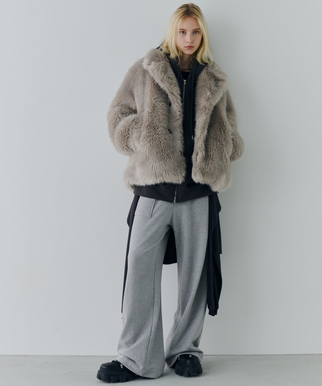 ・ワイドパンツなどと合わせやすいく、身幅はゆとりがあり中に着こみやすくゆったり着用し易いサイズ感に仕上げたファーコート