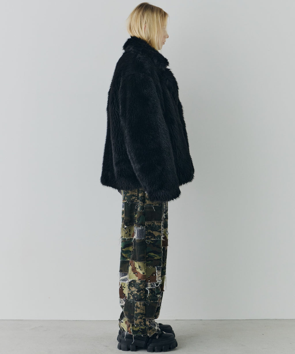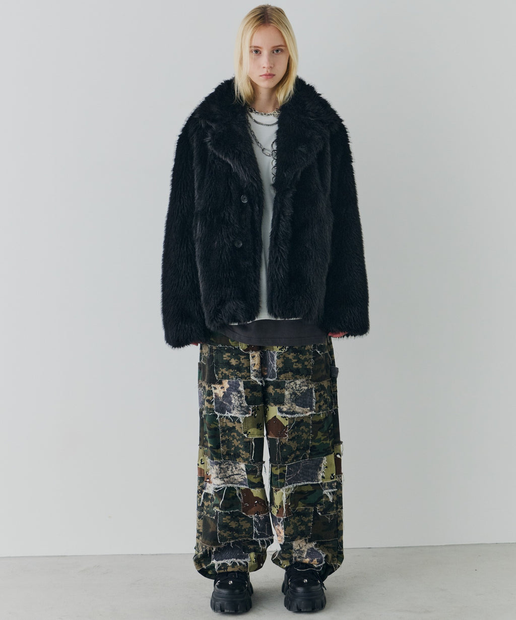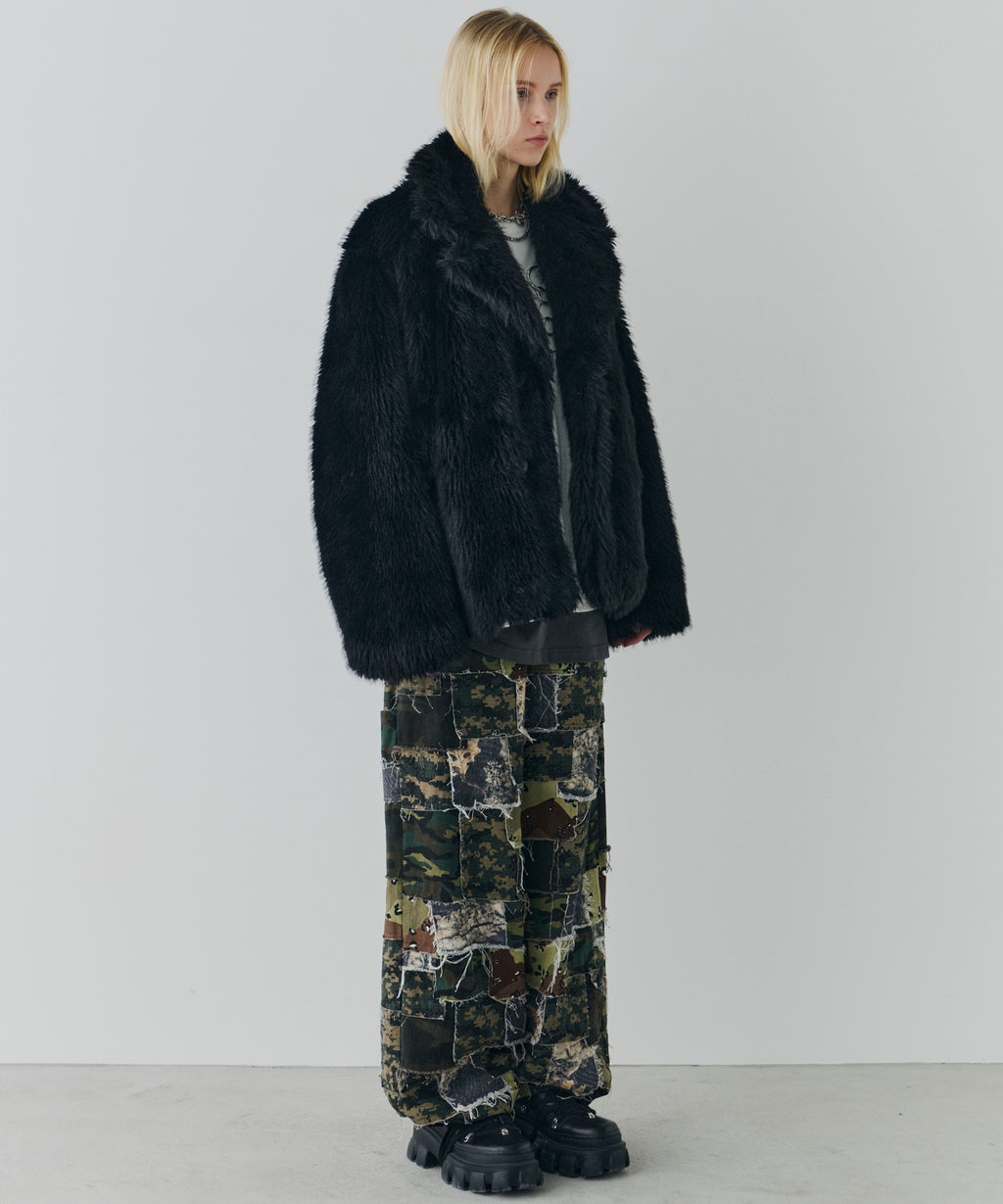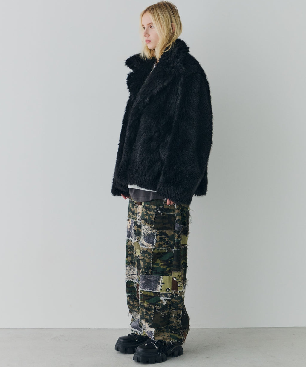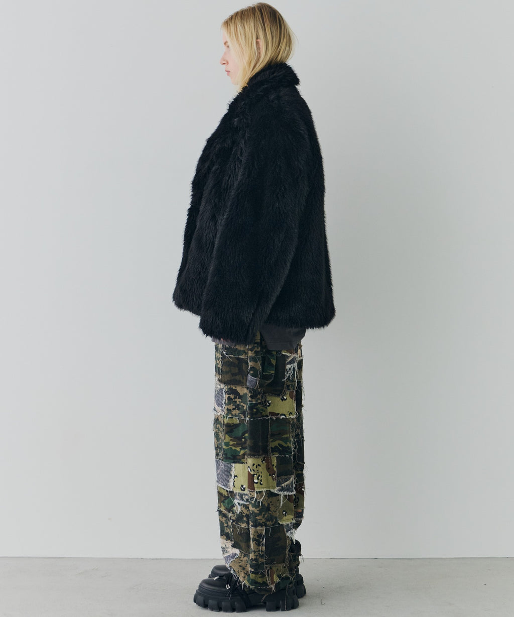 ・ワイドパンツなどと合わせやすいく、身幅はゆとりがあり中に着こみやすくゆったり着用し易いサイズ感に仕上げたファーコート