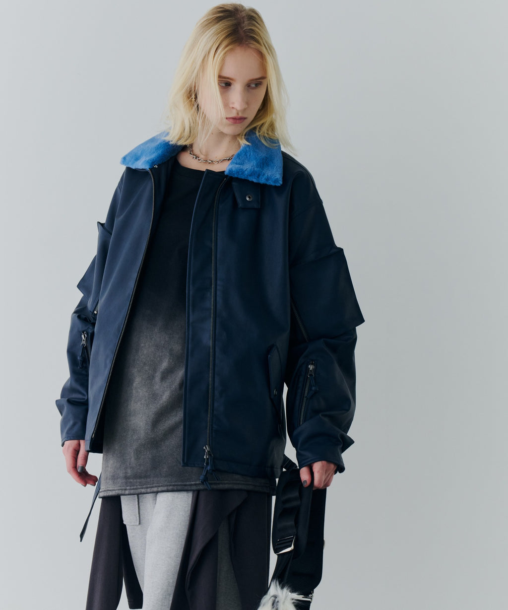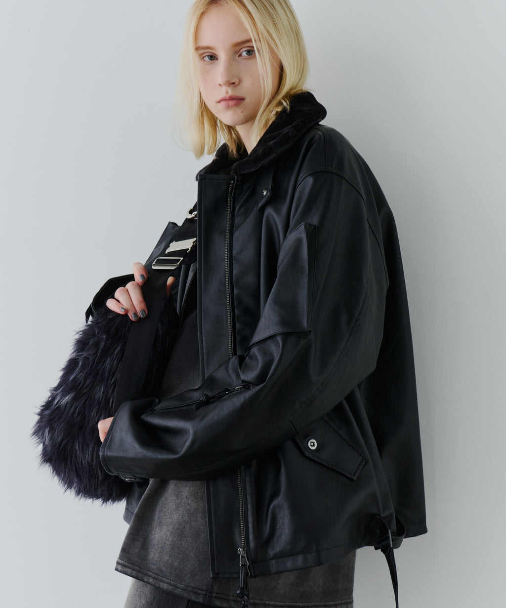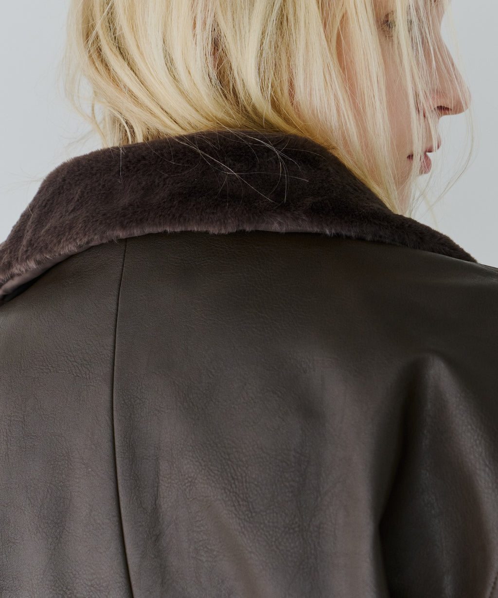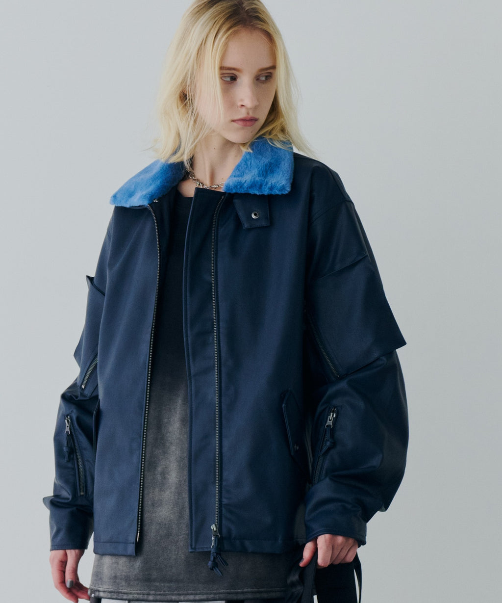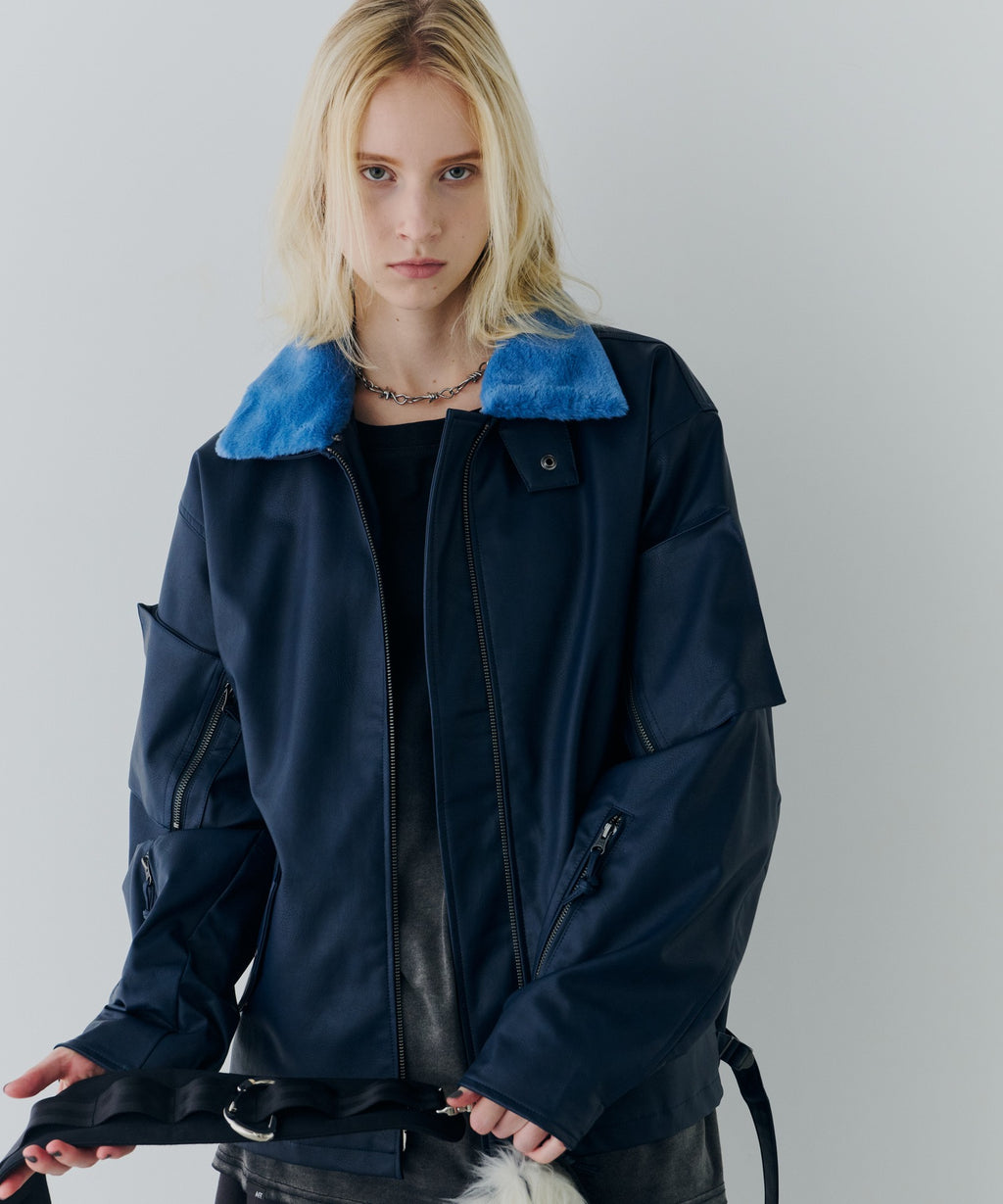 ・首元のリブをなくし、襟で仕立て、襟部分にはボタンで取り外しのできる厚みのあるフェイクファーをあしらった2WAYデザイン