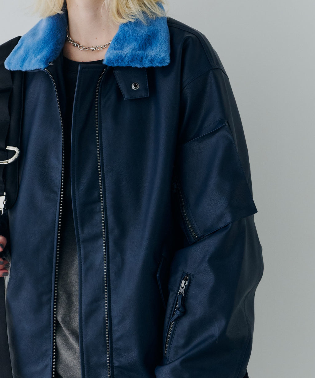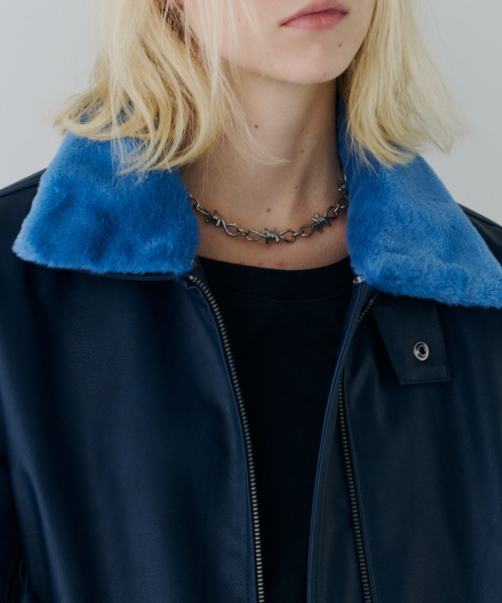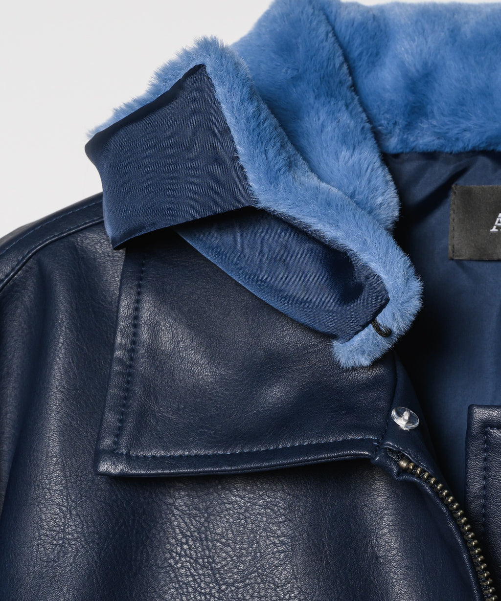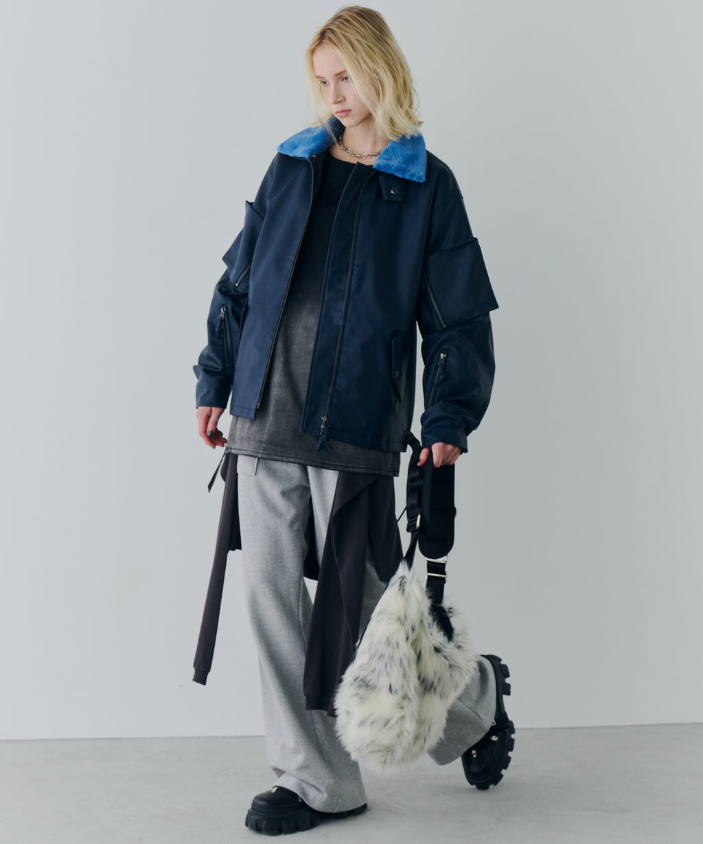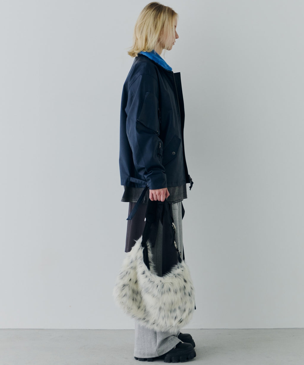 ・首元のリブをなくし、襟で仕立て、襟部分にはボタンで取り外しのできる厚みのあるフェイクファーをあしらった2WAYデザイン