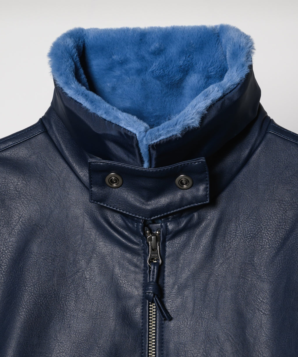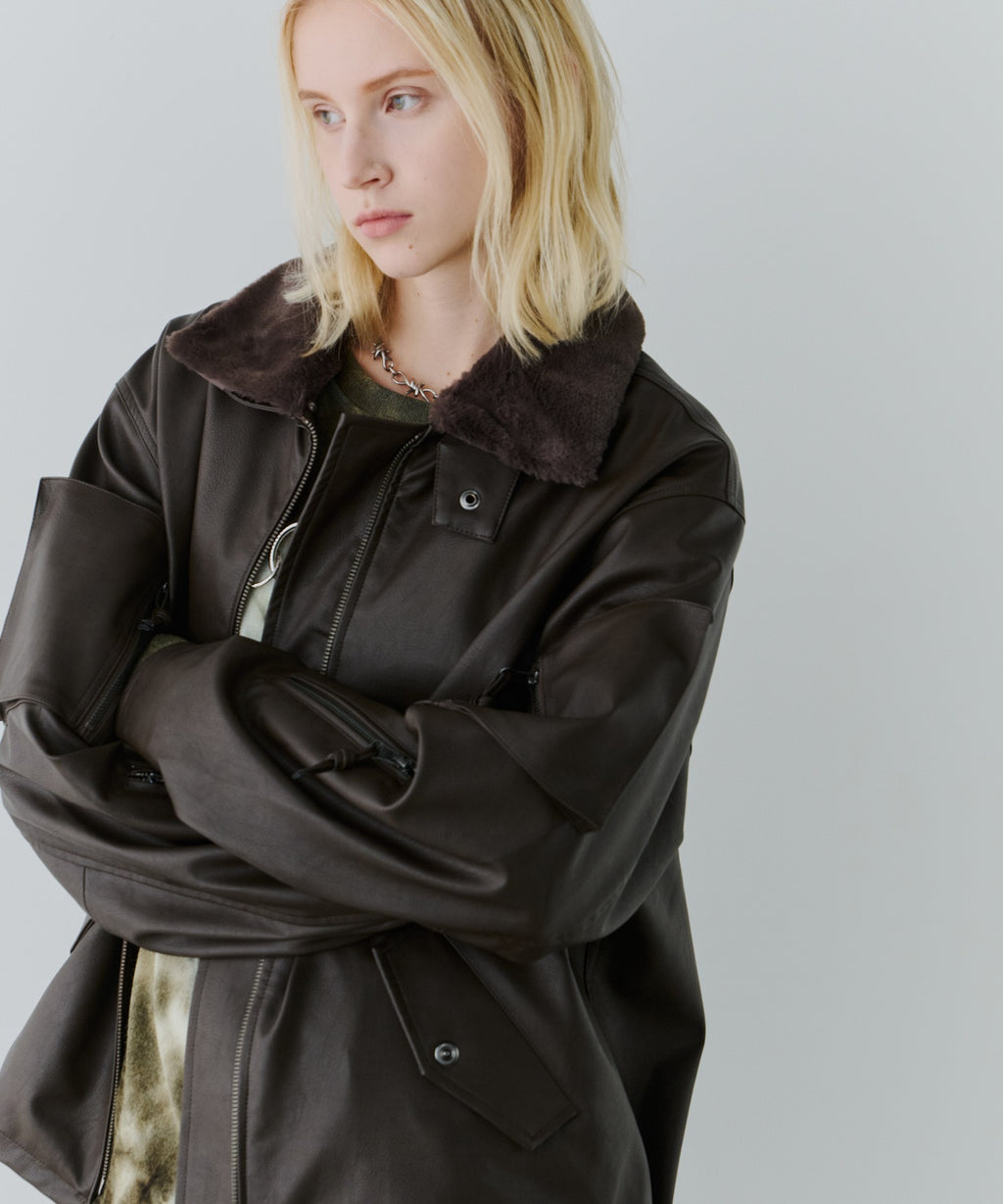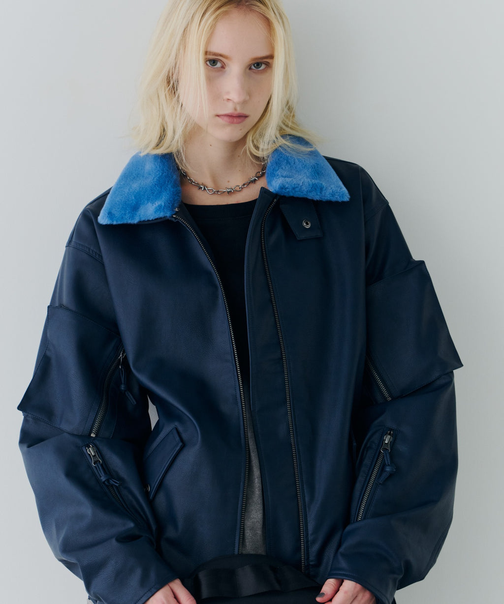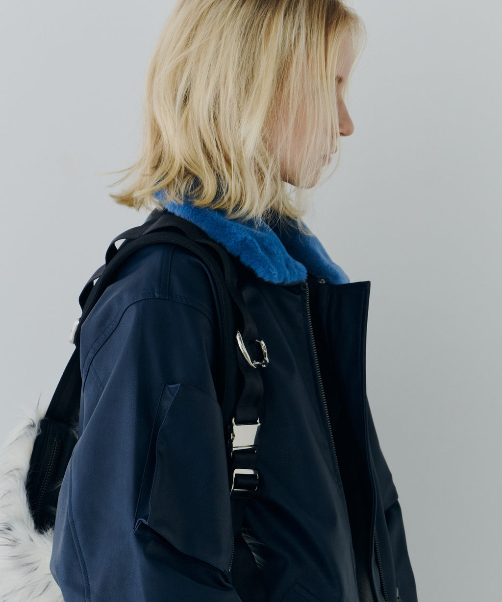 ・首元のリブをなくし、襟で仕立て、襟部分にはボタンで取り外しのできる厚みのあるフェイクファーをあしらった2WAYデザイン
