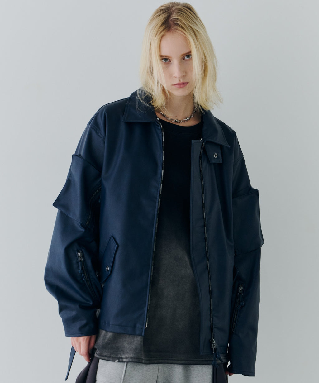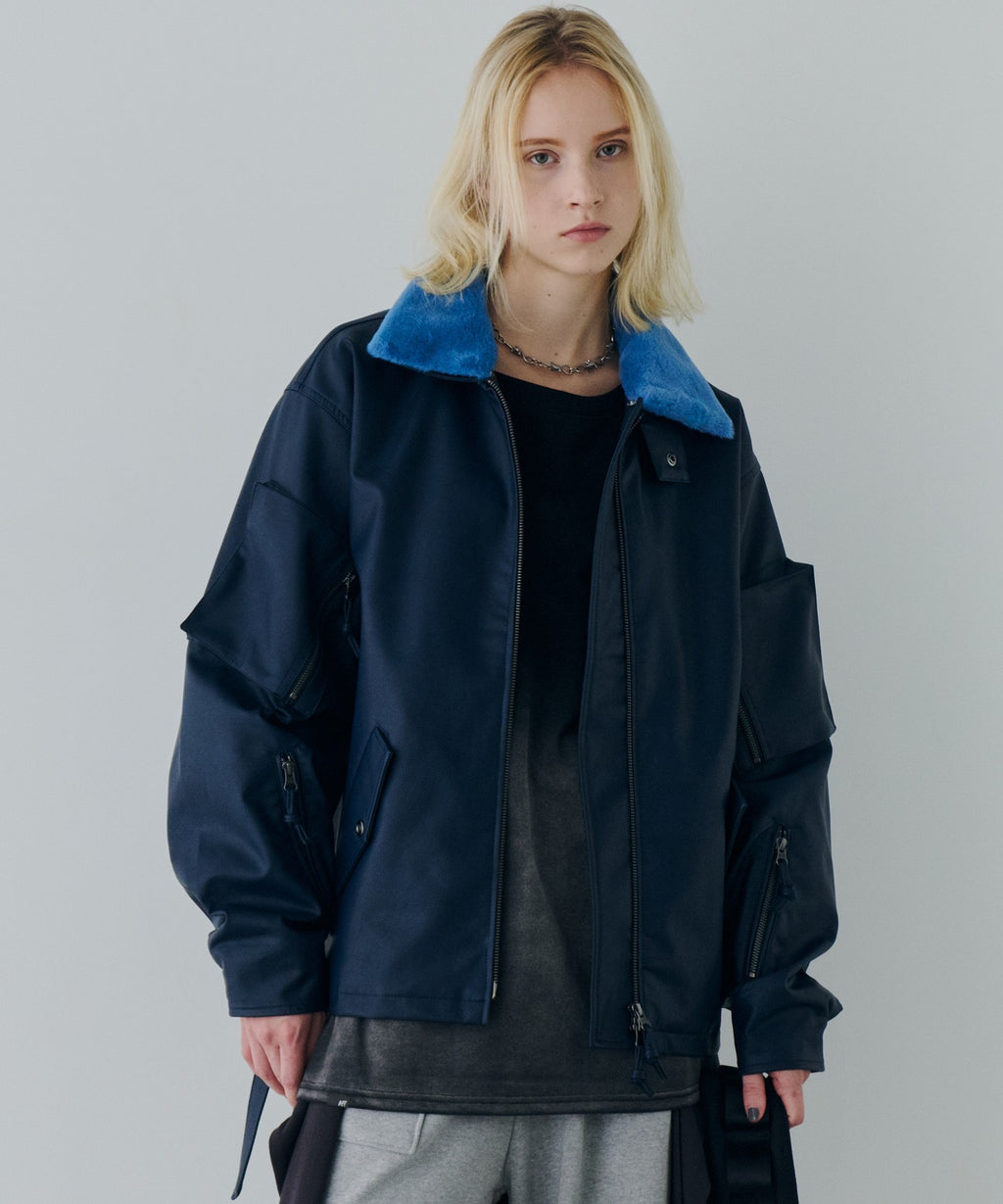 ・フロントにスナップボタン付きのフラップポケット2つ、袖部分には実際に操縦している姿勢でも物を取り出しやすいように取り付けられたジップ付きのパイロットポケットを右左に計4つ