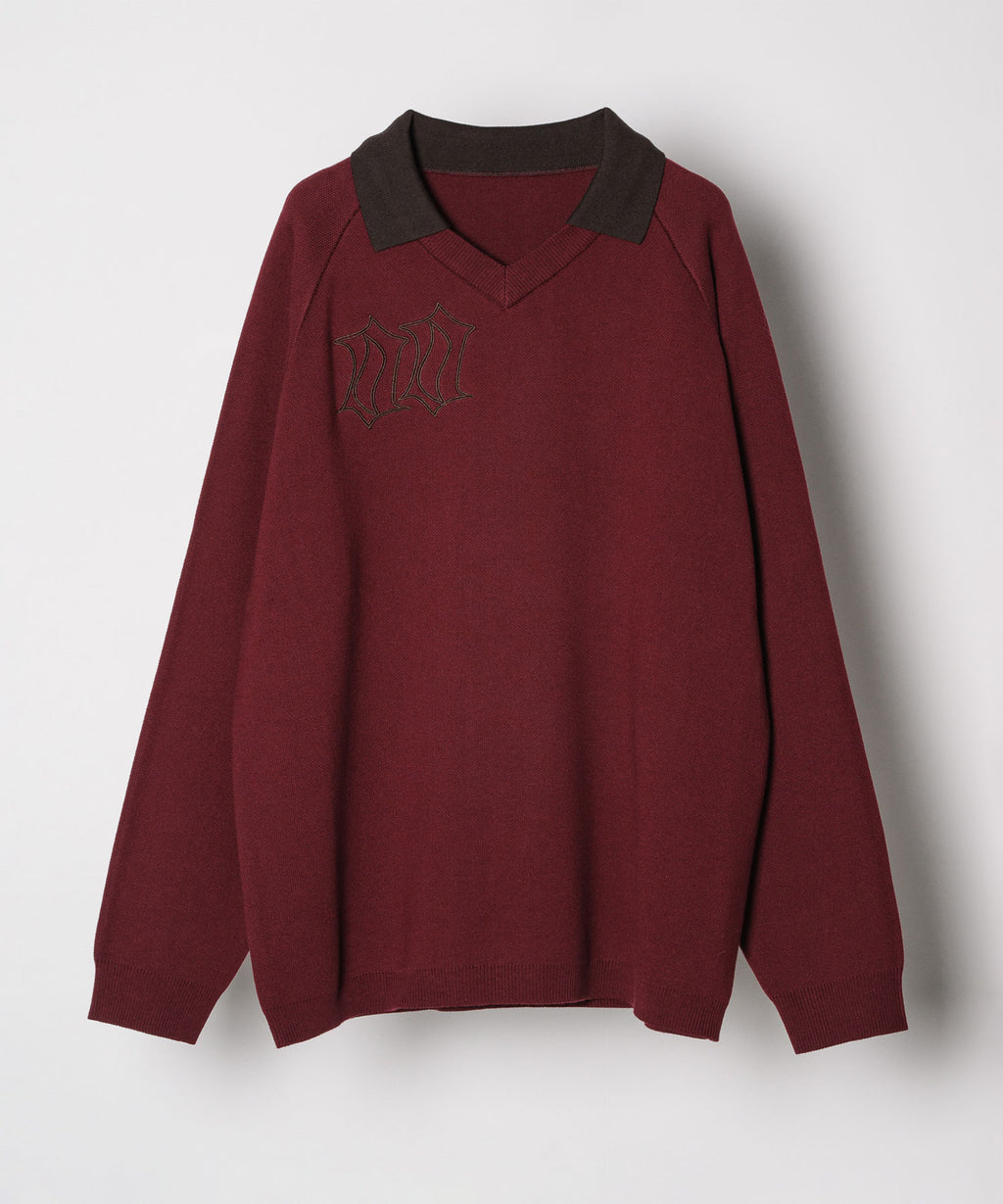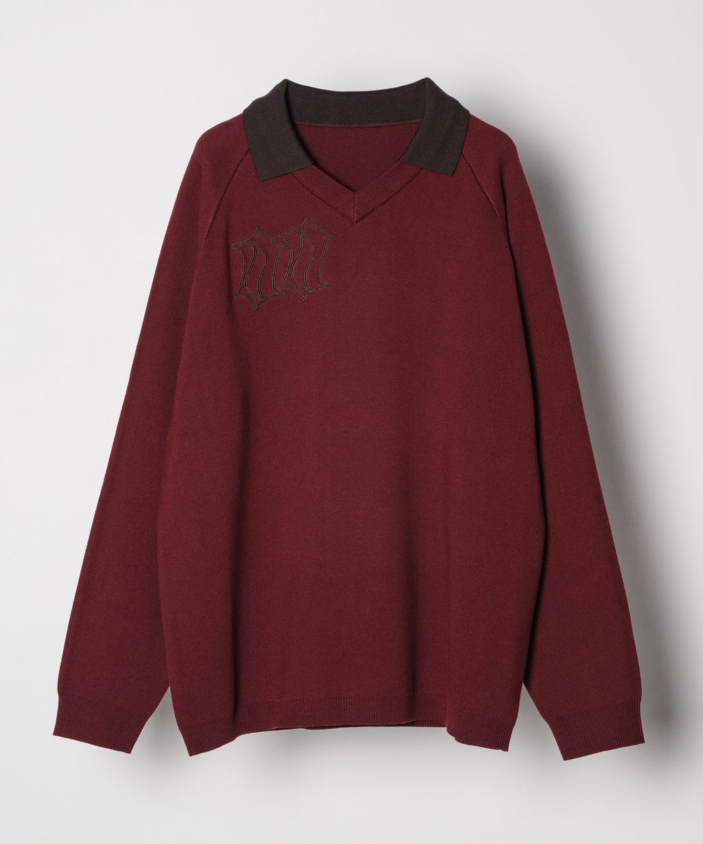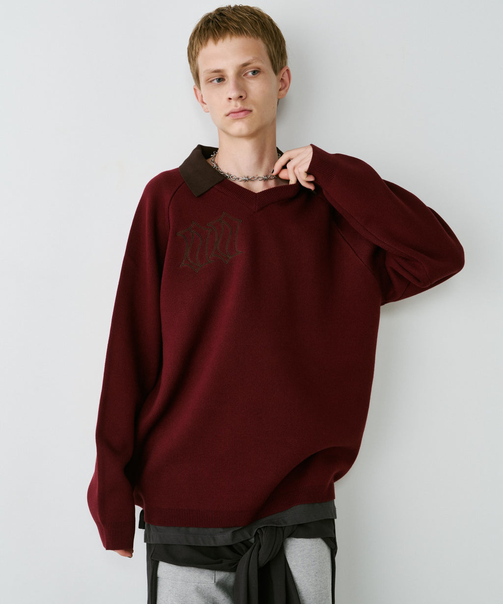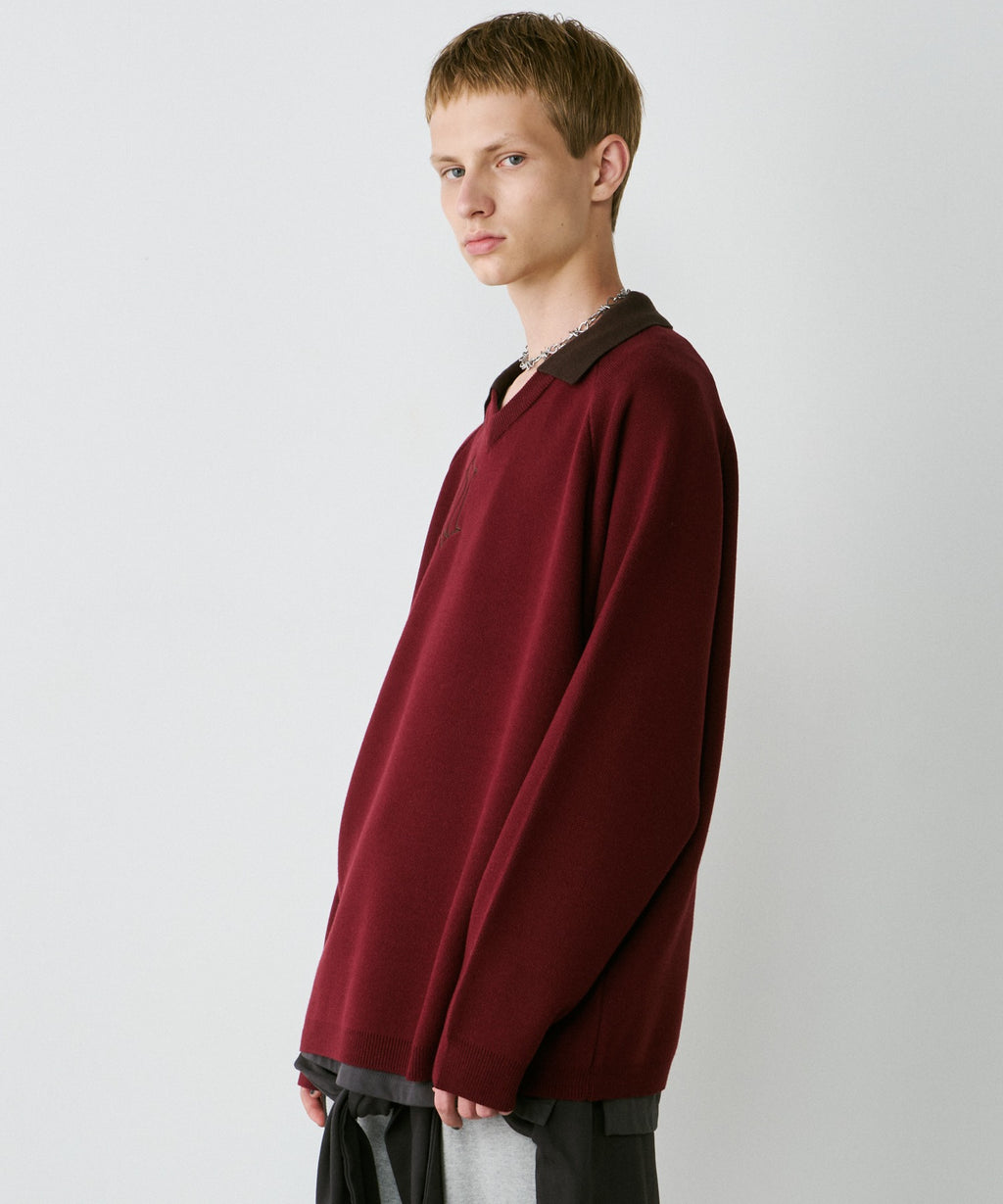 ・Vネックに大きめの襟を取り付けた長袖ニットポロシャツ