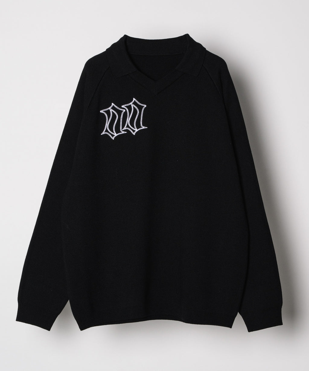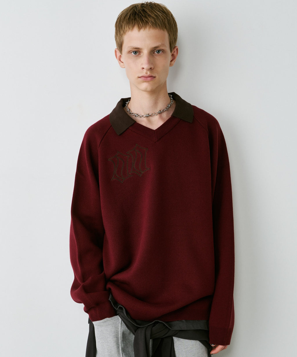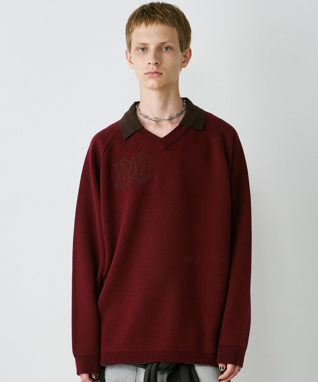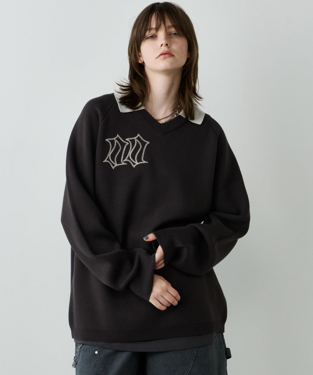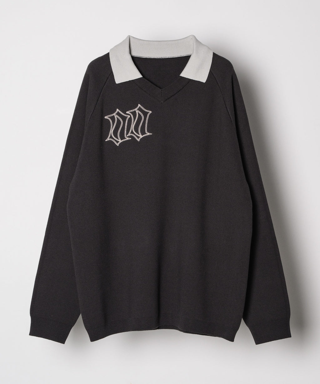 ・Vネックに大きめの襟を取り付けた長袖ニットポロシャツ