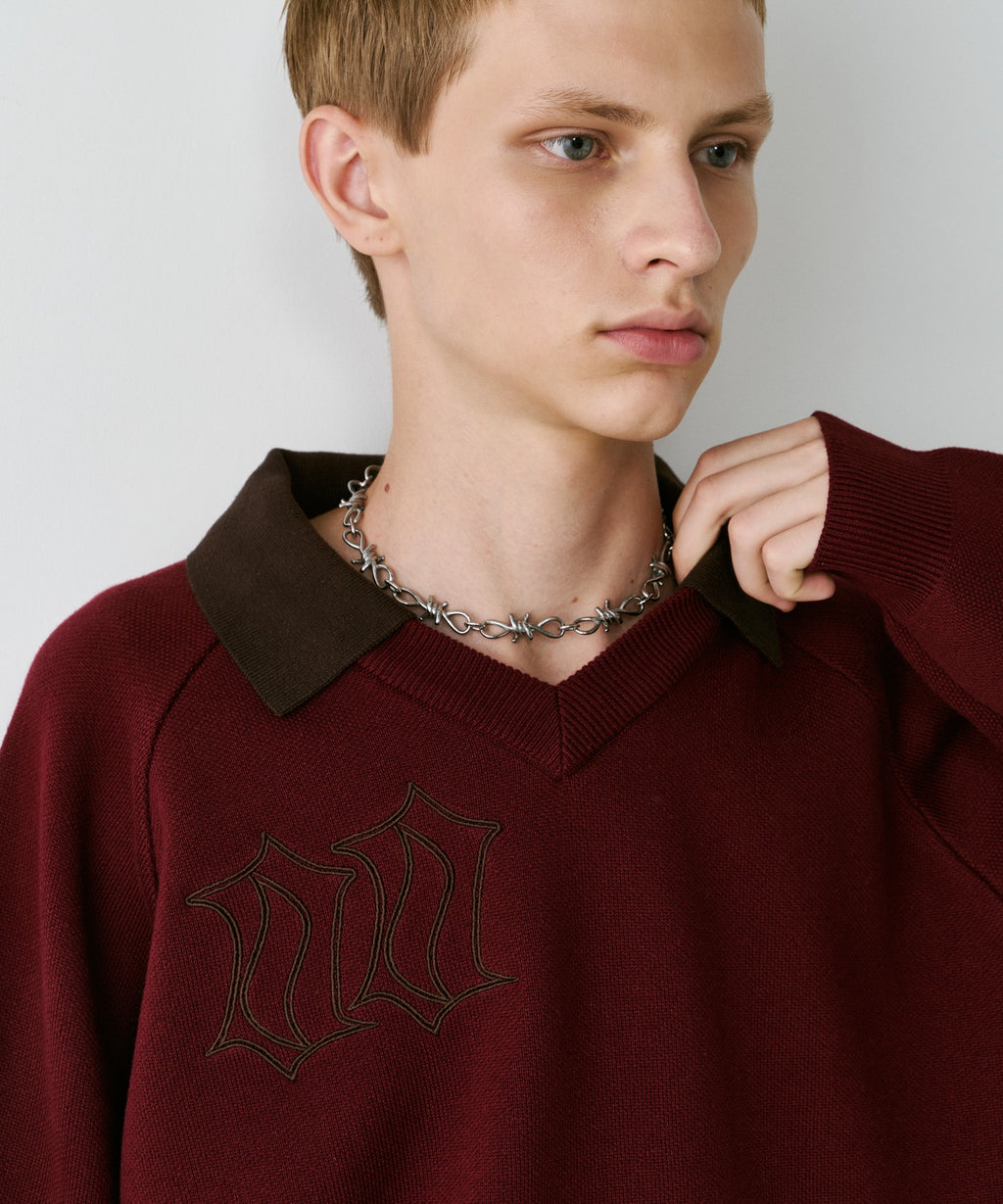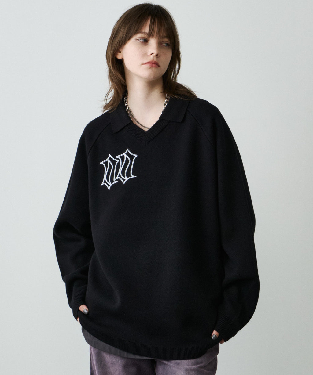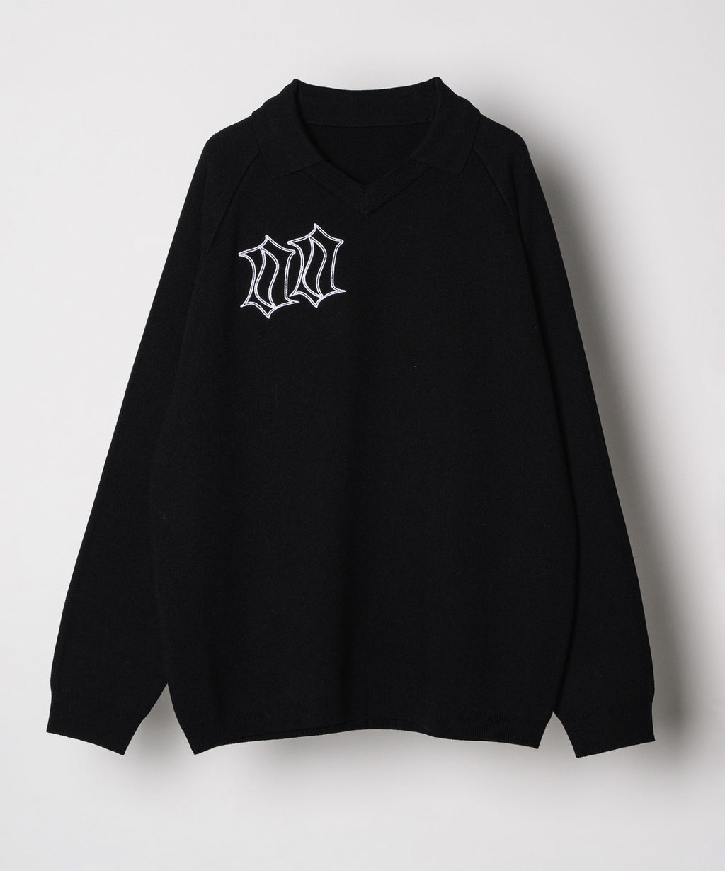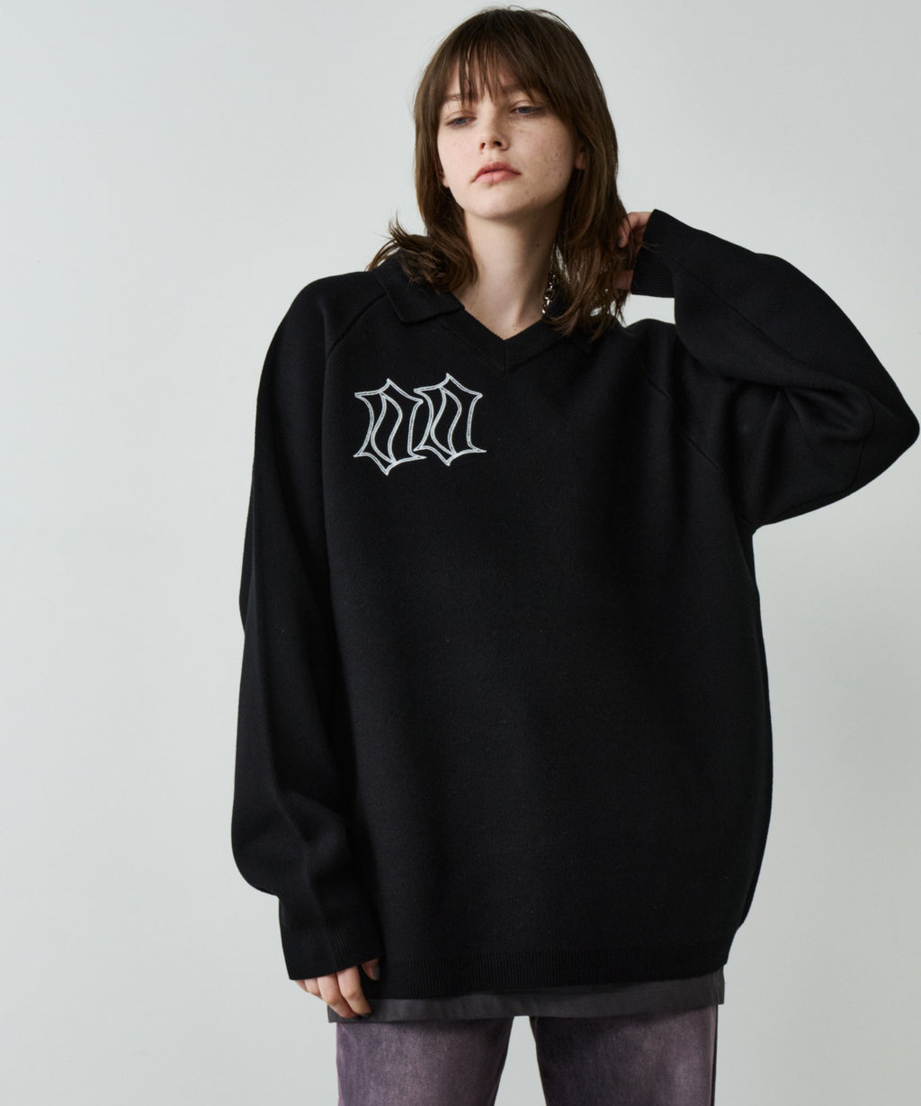 ・Vネックに大きめの襟を取り付けた長袖ニットポロシャツ