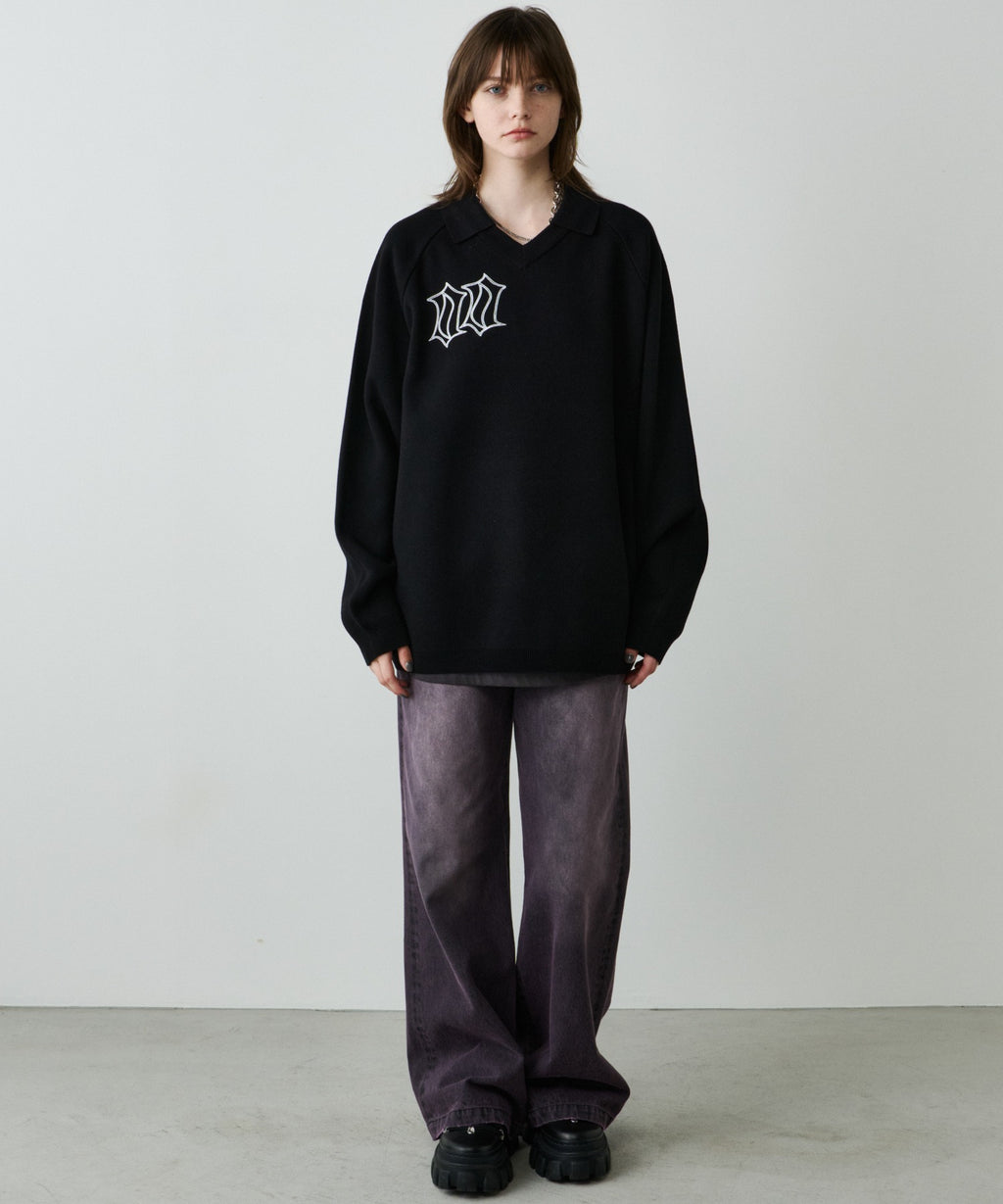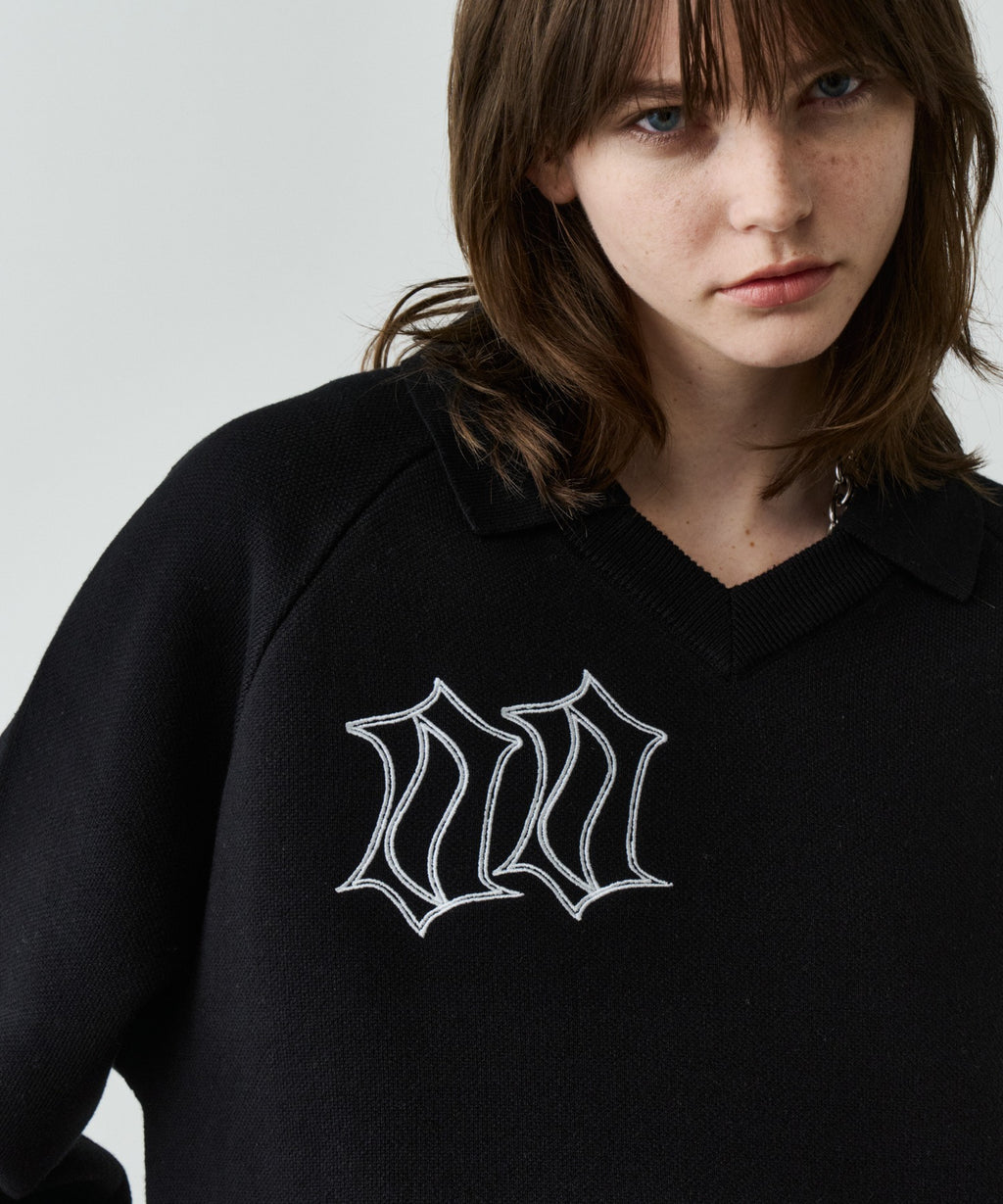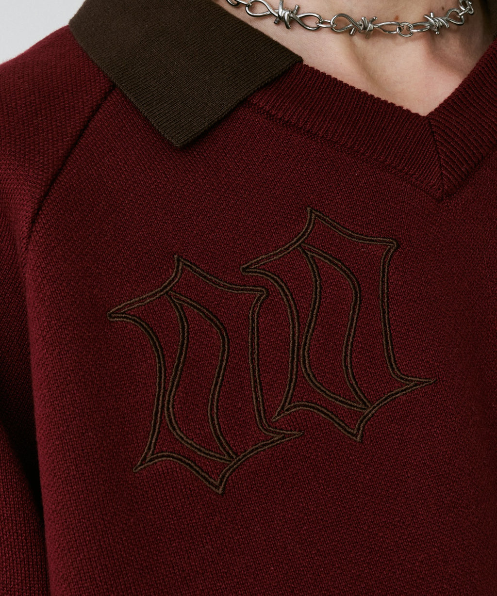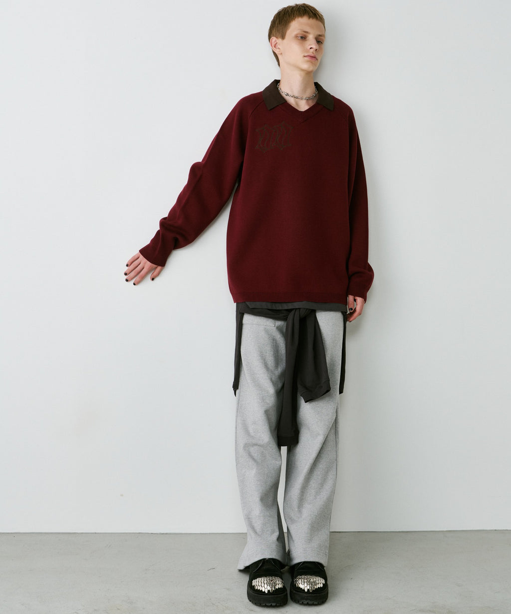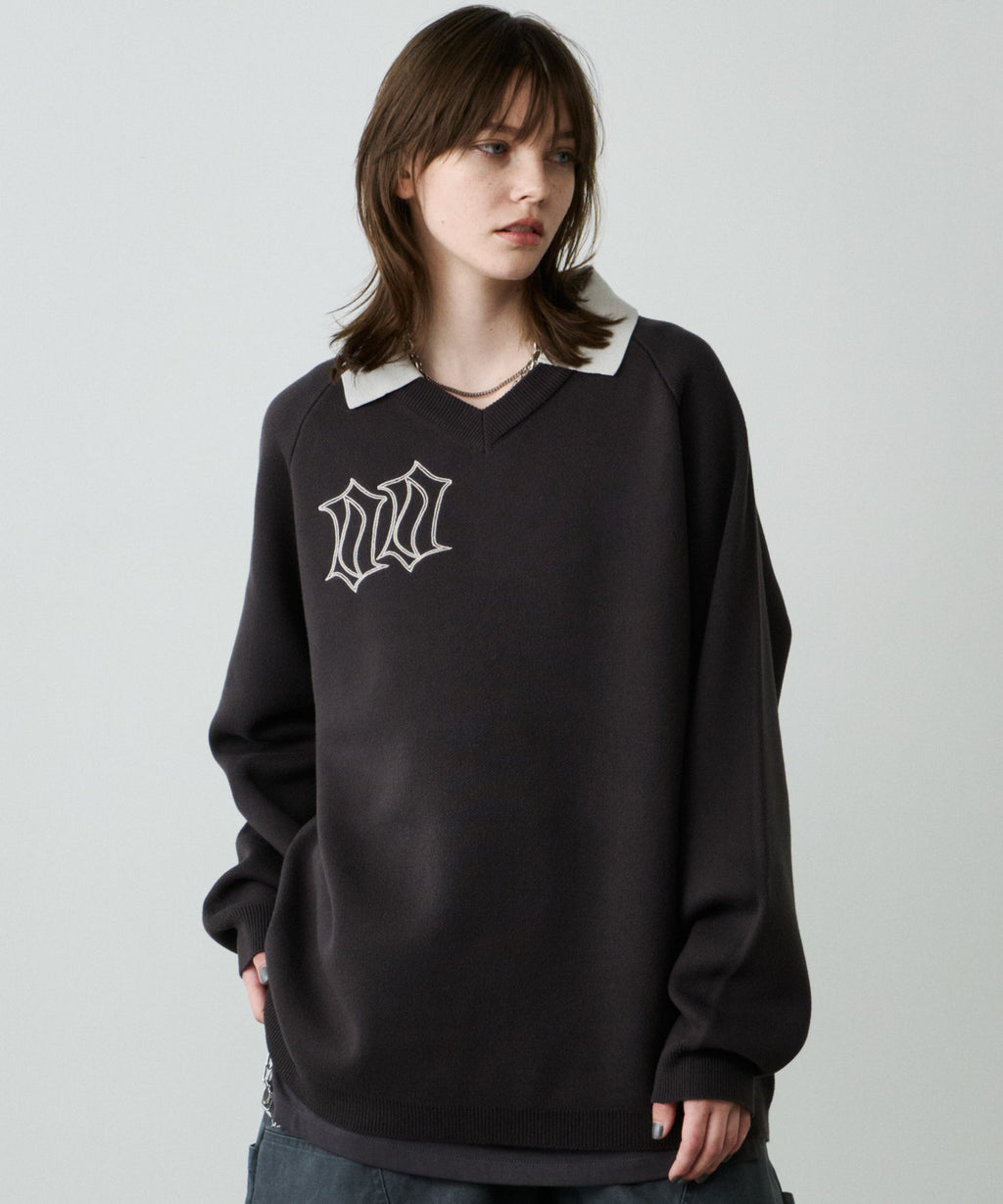 ・Vネックに大きめの襟を取り付けた長袖ニットポロシャツ