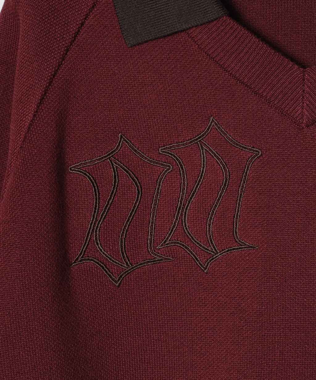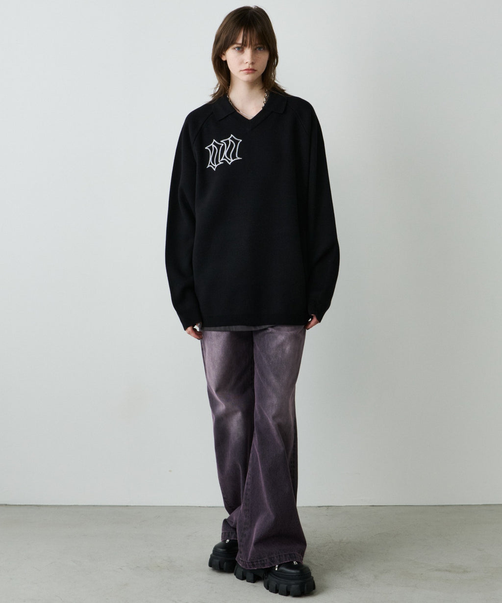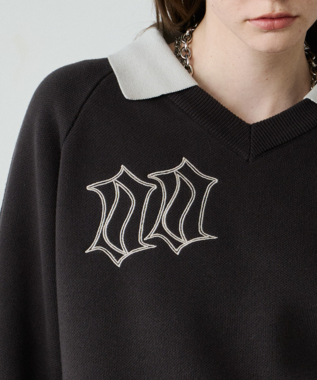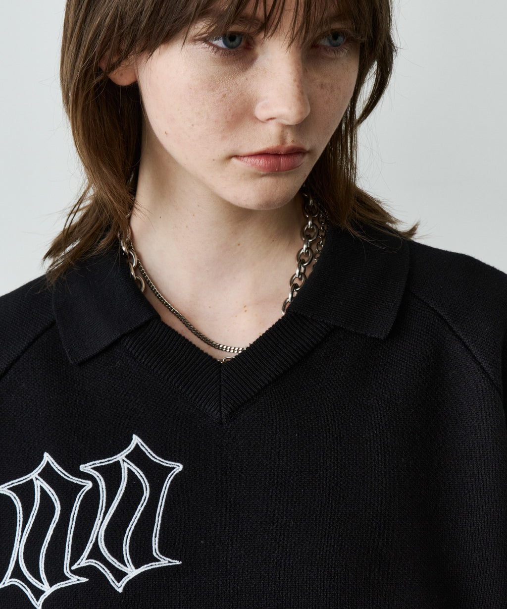 ・Vネックに大きめの襟を取り付けた長袖ニットポロシャツ