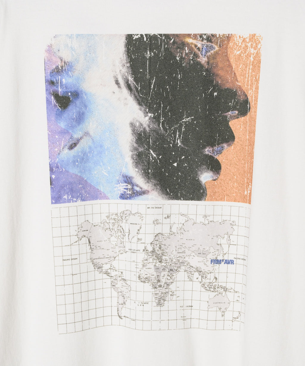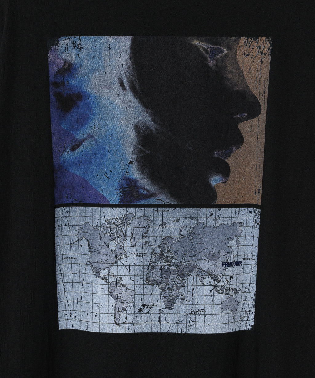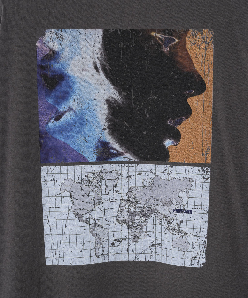 ・人物のカラーフォトプリントとモノクロの地図をプリントし地図のプリント部分にはFRM AVRのロゴ入り