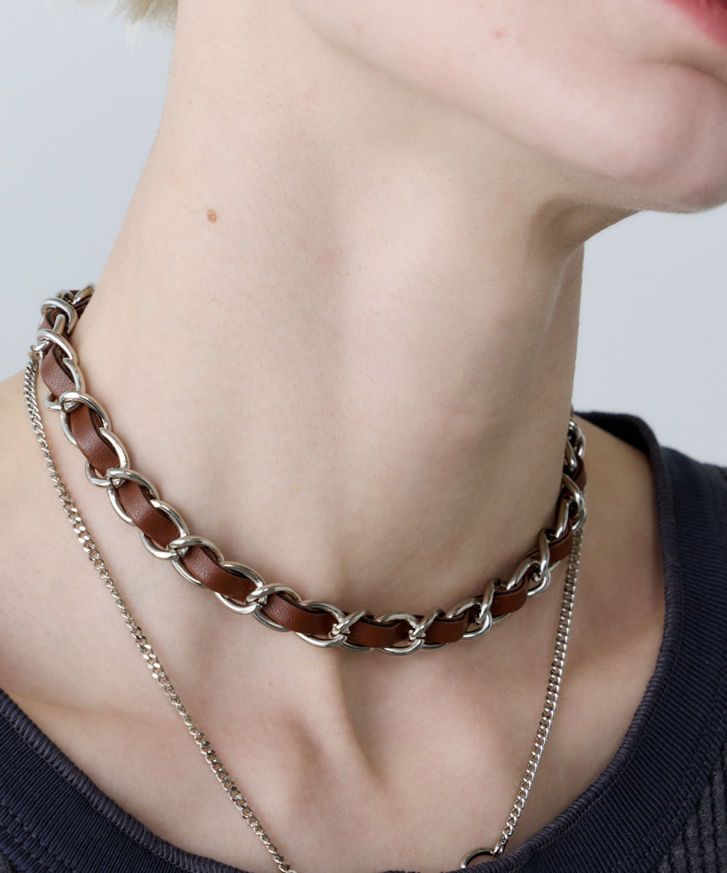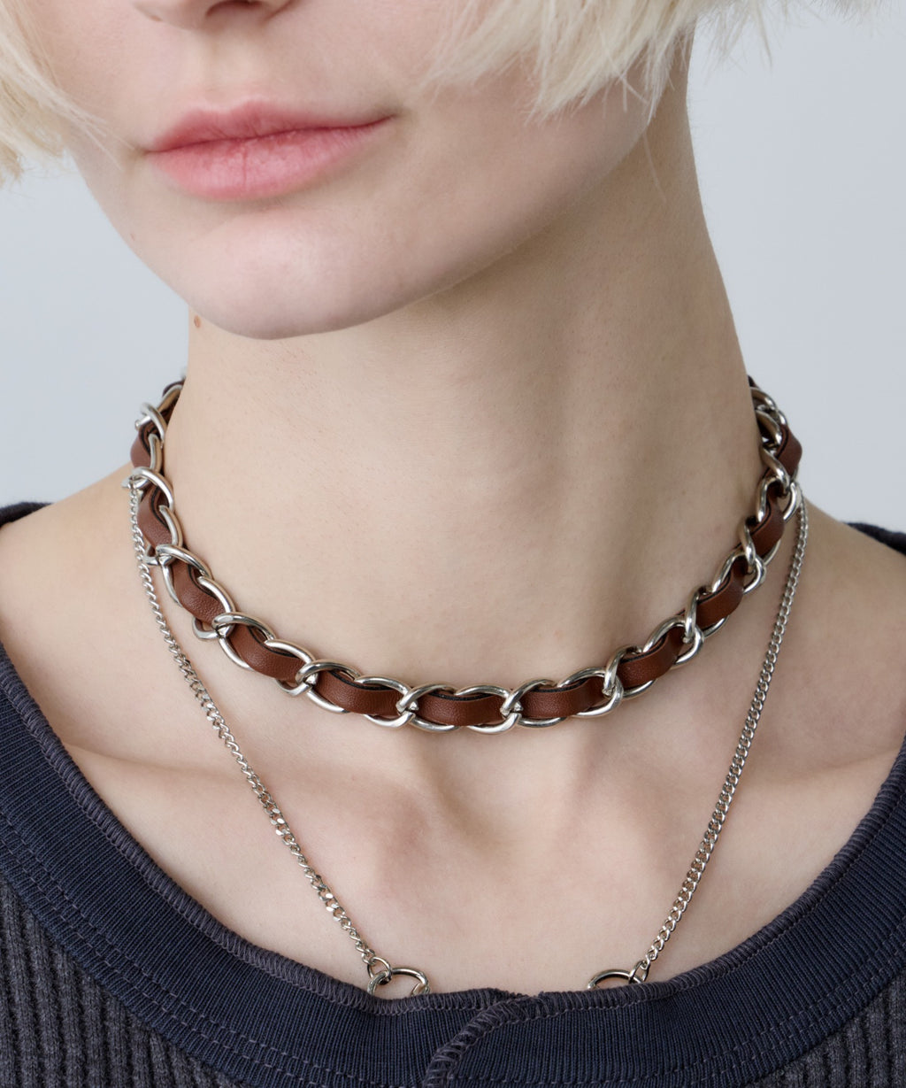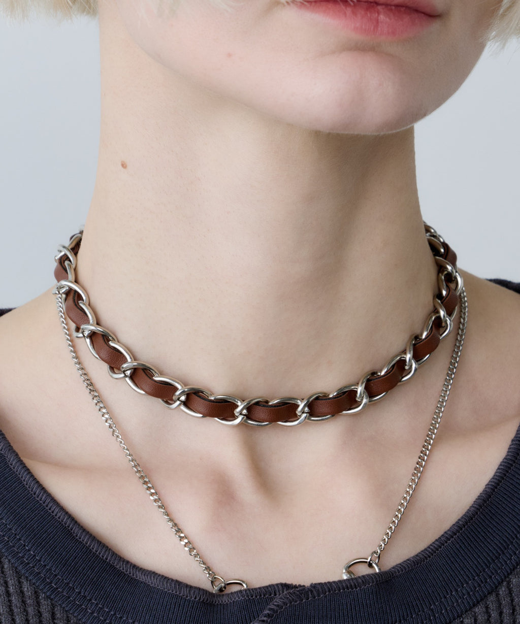 ・2面カットのチェーンにフェイクレザーを編み込んだデザイン・レザー自体はしなやかで柔らかく首に沿う仕上がり・好みの長さで付けられチョーカーネックレスでもショートネックレスでもどちらでも対応・レザーのないチェーン部分を約8cm取り付けているためその分サイズ調節可能・サイズ約35cm~約43cm対応・留め具にはナスカンを採用し止めやすい仕様・日本製・ブラック、ブラウン2色展開