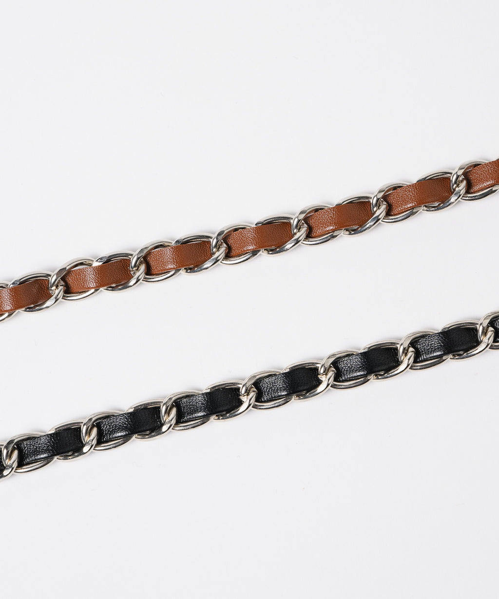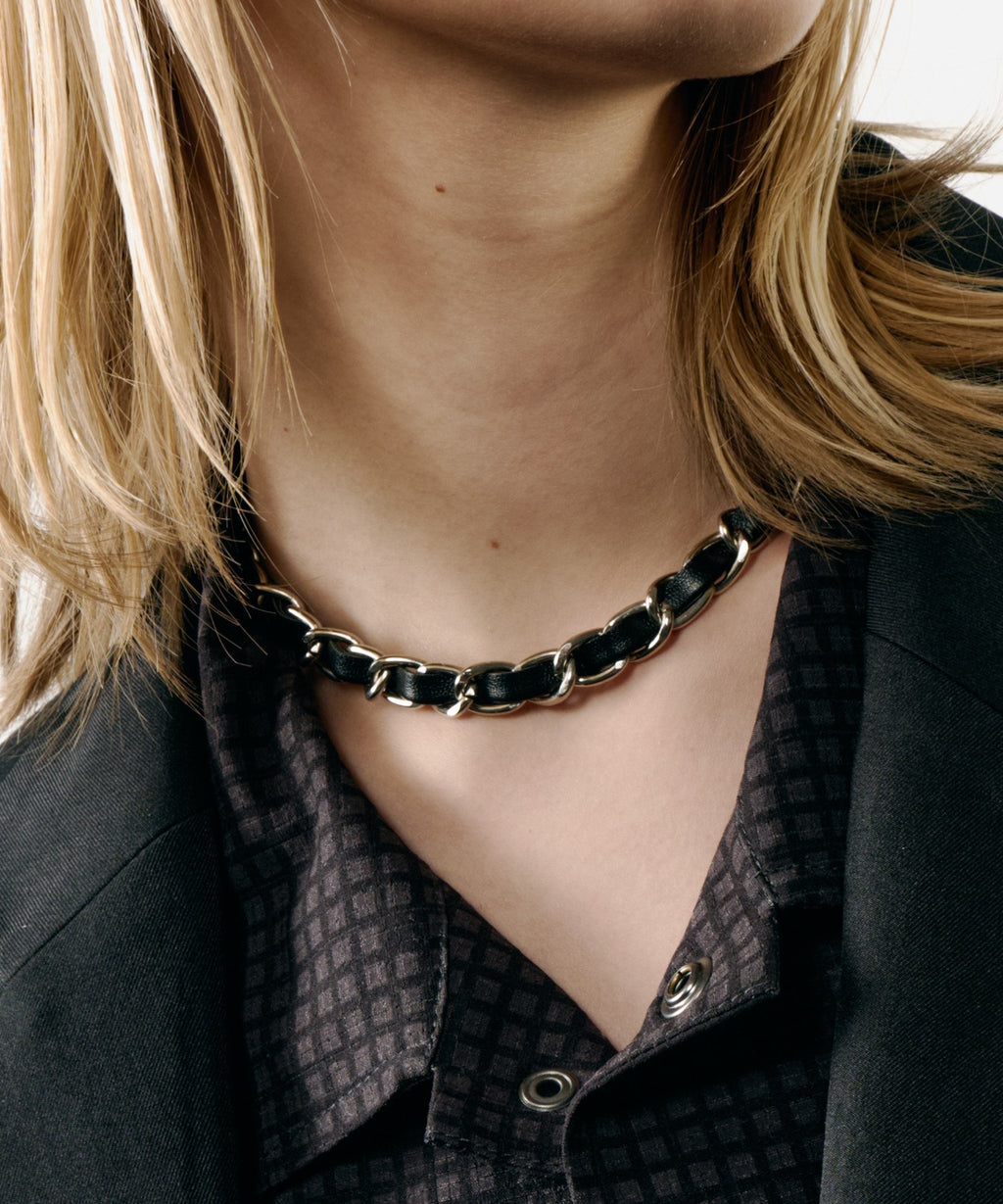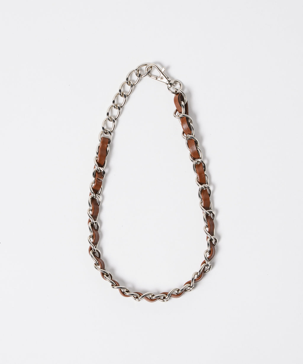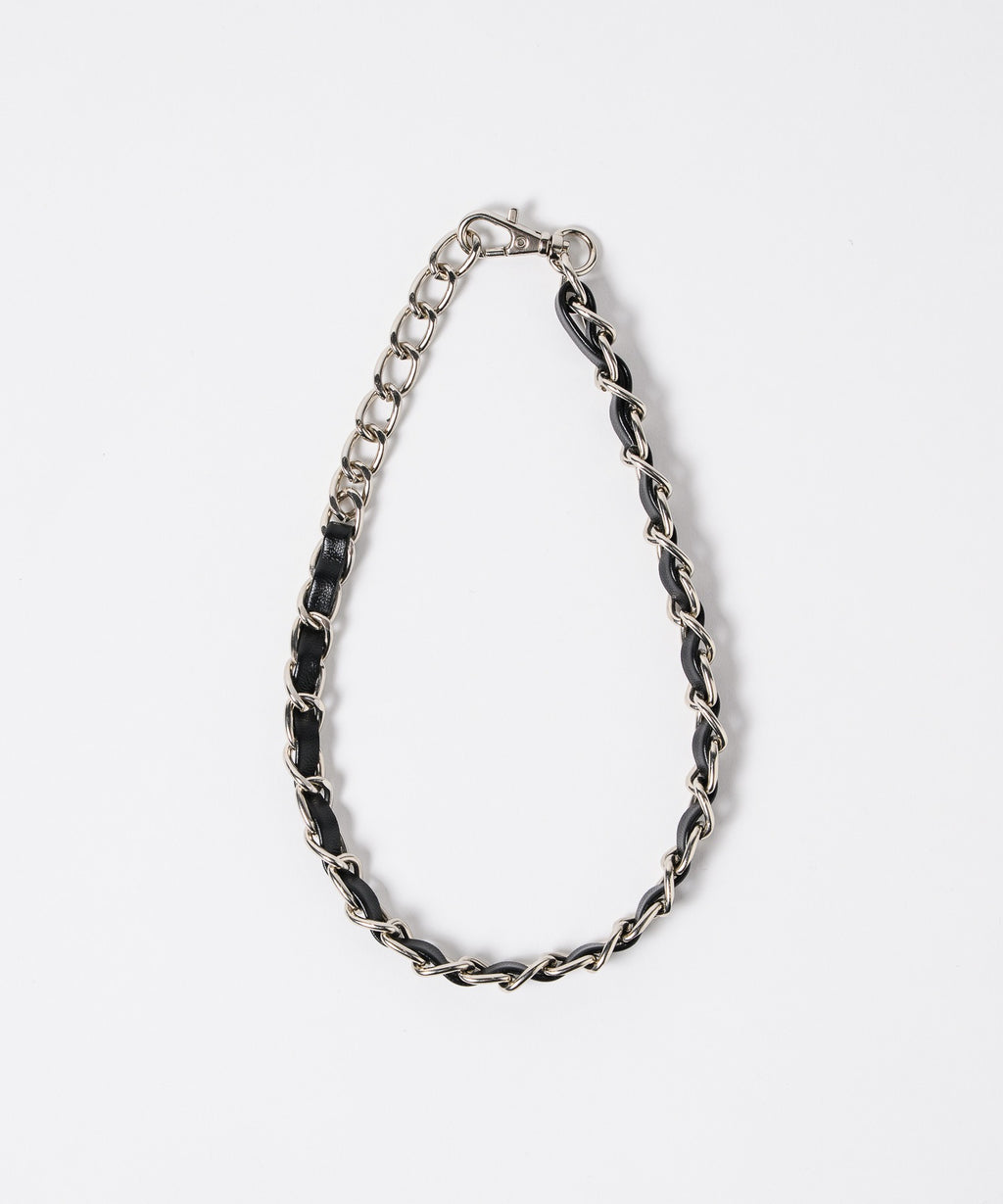 ・2面カットのチェーンにフェイクレザーを編み込んだデザイン・レザー自体はしなやかで柔らかく首に沿う仕上がり・好みの長さで付けられチョーカーネックレスでもショートネックレスでもどちらでも対応・レザーのないチェーン部分を約8cm取り付けているためその分サイズ調節可能・サイズ約35cm~約43cm対応・留め具にはナスカンを採用し止めやすい仕様・日本製・ブラック、ブラウン2色展開