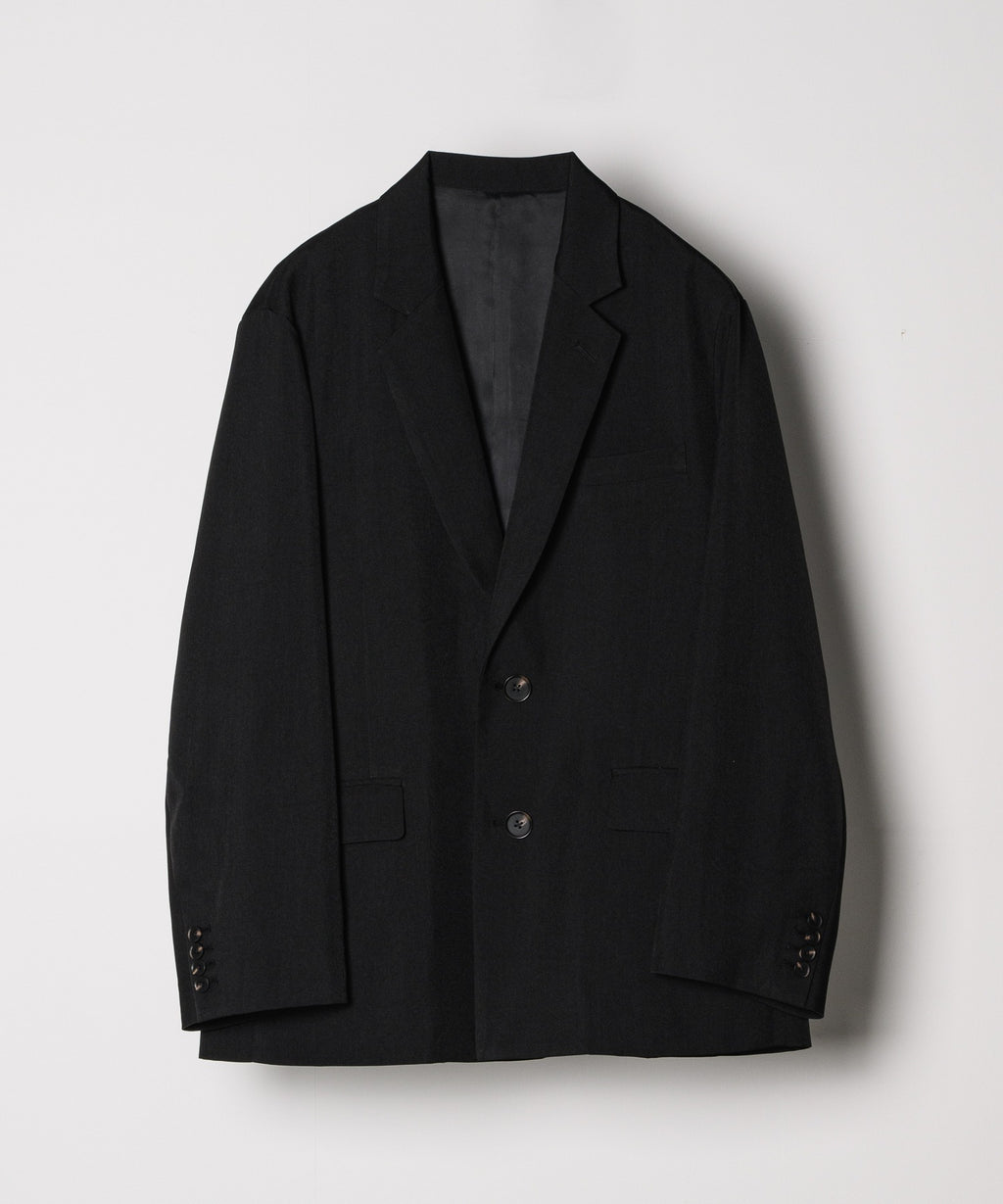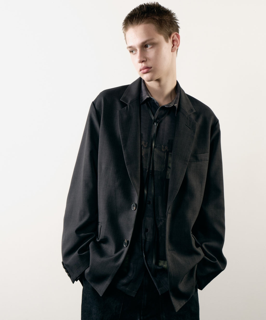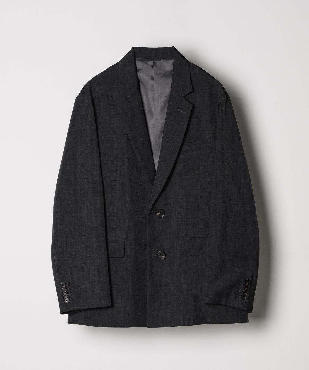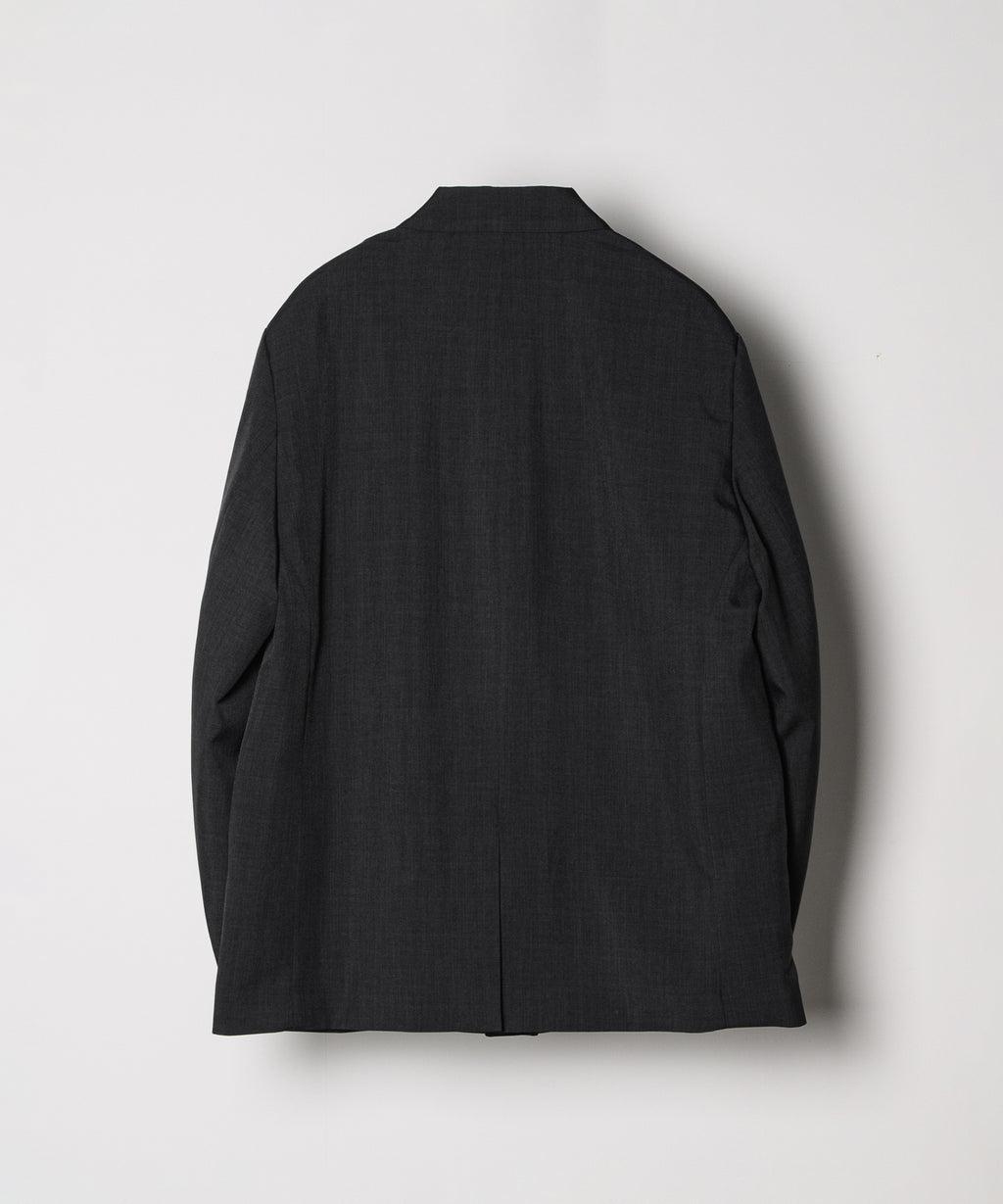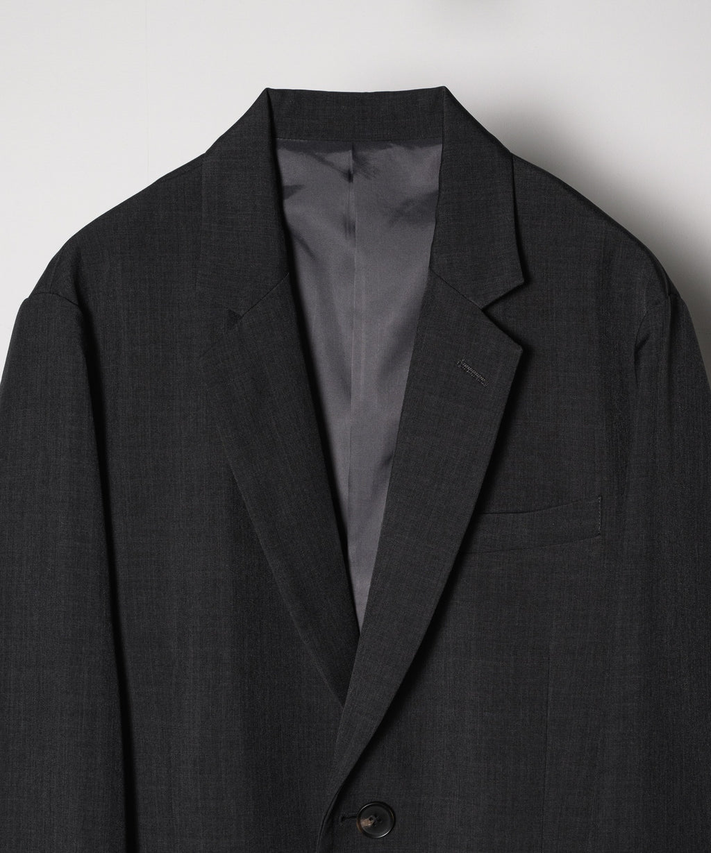 ・シワになりにくく、型崩れしにくい、適度な厚みとドレープ性を持ち合わたポリエステルドライツイル生地・ドライタッチでさらっとシャツ感覚で羽織りやすい軽量のテーラードジャケット・身頃と襟の芯地を調整し、適度に立体的な形をキープするよう仕上げ・ゆったりとした袖でフォーマル過ぎないゆるいシルエット・表に出るステッチ箇所を減らしたソリッドでミニマルな雰囲気・胸ポケット×1、フラップポケット×2、内側の胸元両サイドに内ポケット付き ・総裏、センターベント、袖口本切羽仕様・ボディと同系色の裏地付き・真っ黒過ぎないライトブラックとメランジ調のミックスグレーの2色展開。