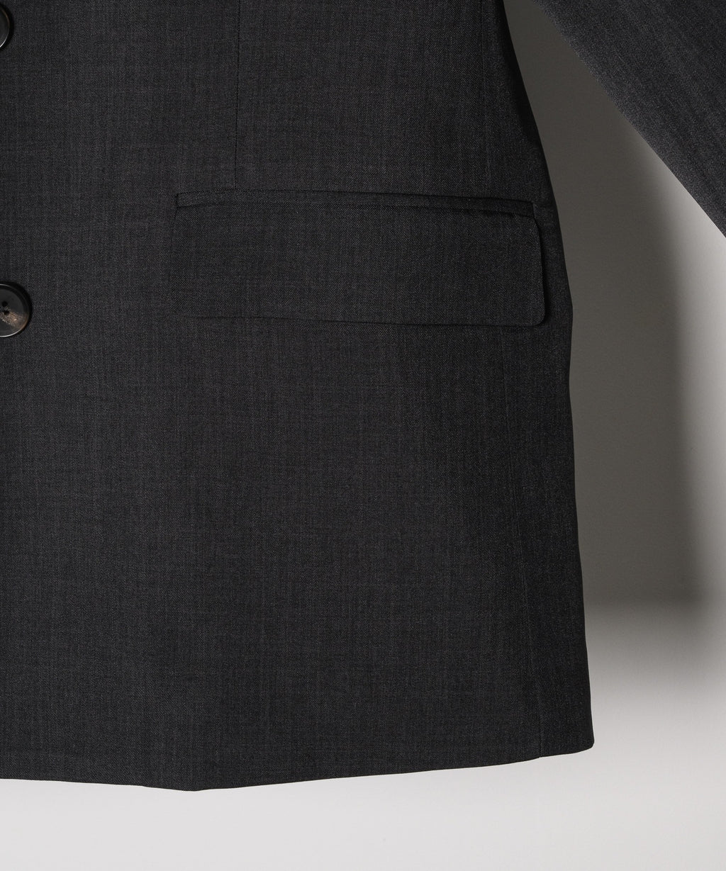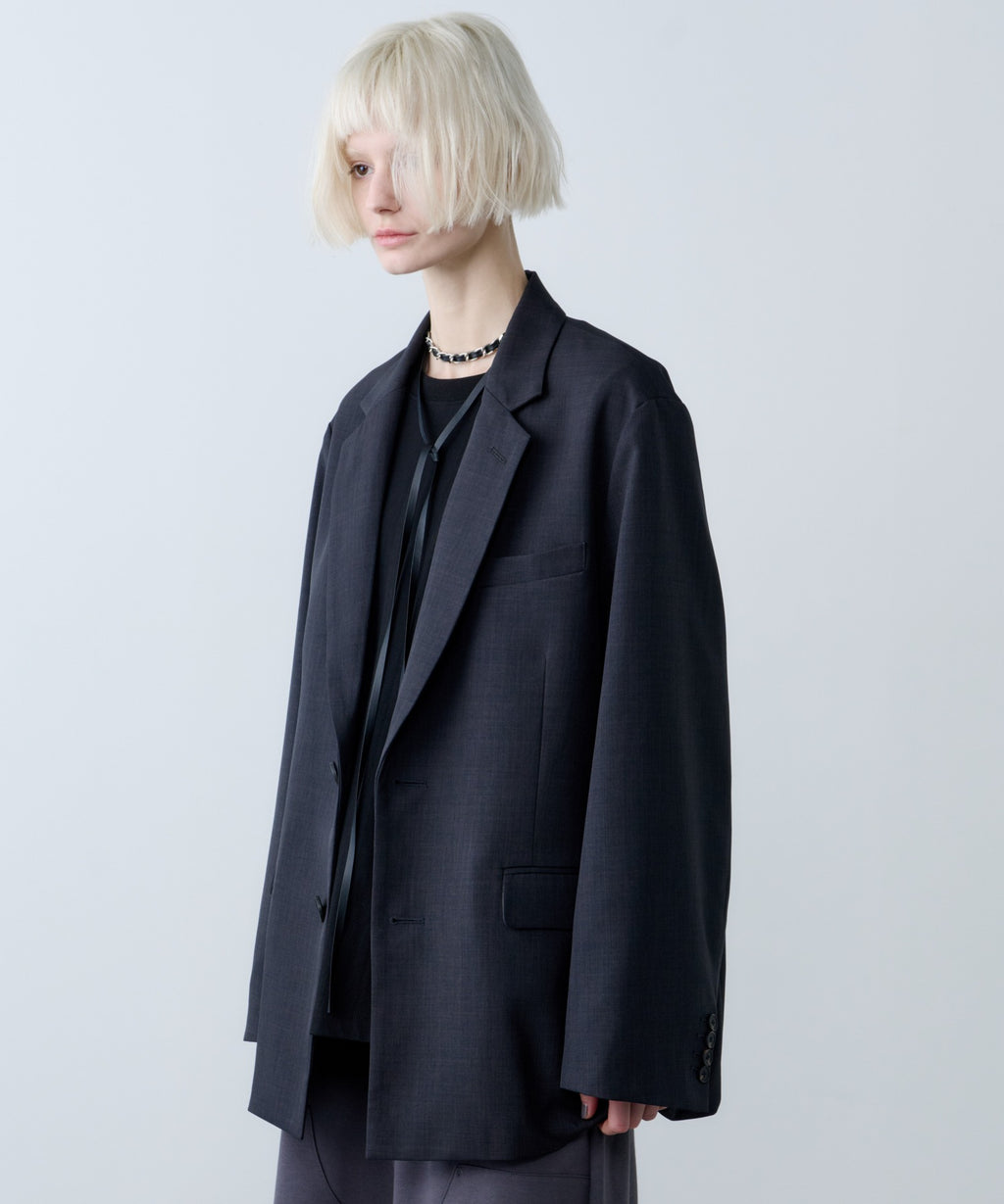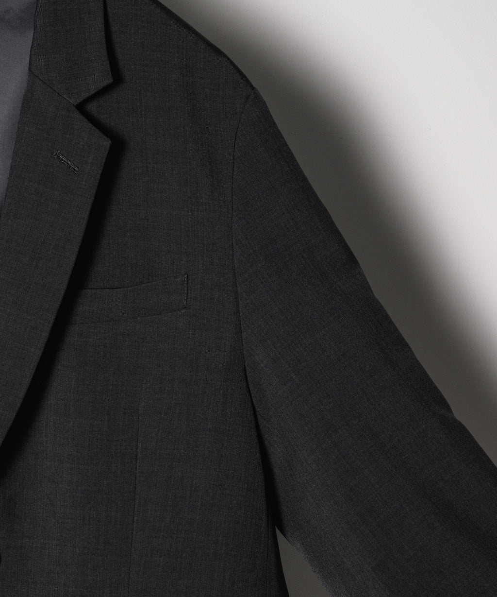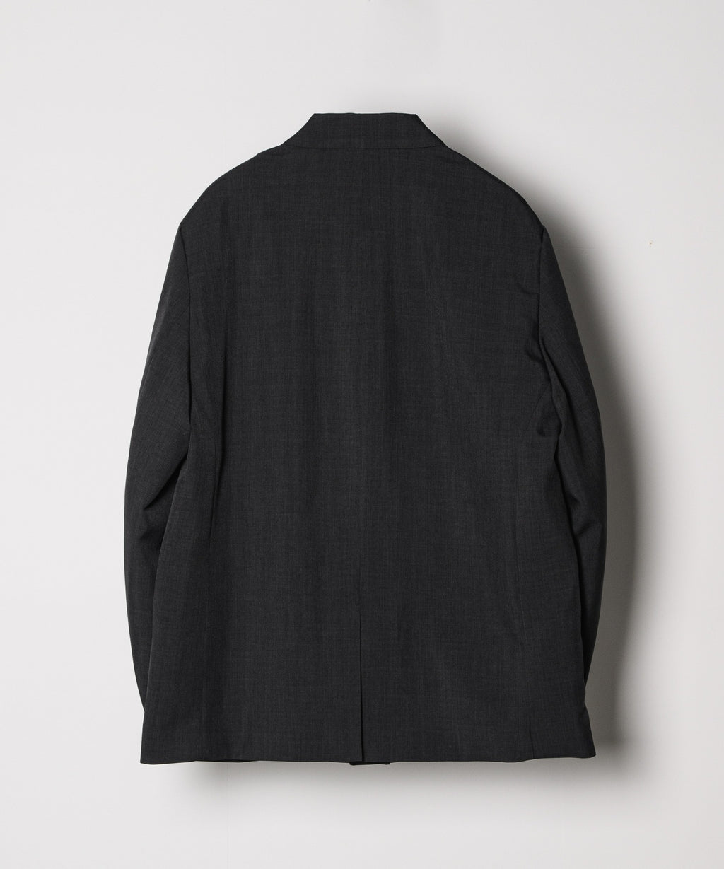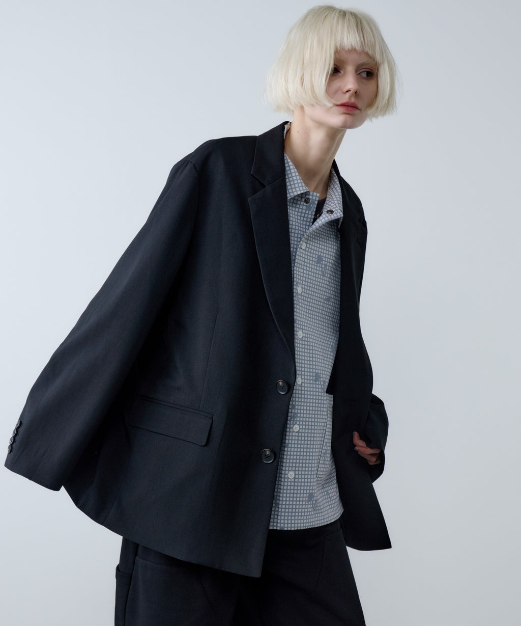 ・シワになりにくく、型崩れしにくい、適度な厚みとドレープ性を持ち合わたポリエステルドライツイル生地・ドライタッチでさらっとシャツ感覚で羽織りやすい軽量のテーラードジャケット・身頃と襟の芯地を調整し、適度に立体的な形をキープするよう仕上げ・ゆったりとした袖でフォーマル過ぎないゆるいシルエット・表に出るステッチ箇所を減らしたソリッドでミニマルな雰囲気・胸ポケット×1、フラップポケット×2、内側の胸元両サイドに内ポケット付き ・総裏、センターベント、袖口本切羽仕様・ボディと同系色の裏地付き・真っ黒過ぎないライトブラックとメランジ調のミックスグレーの2色展開。