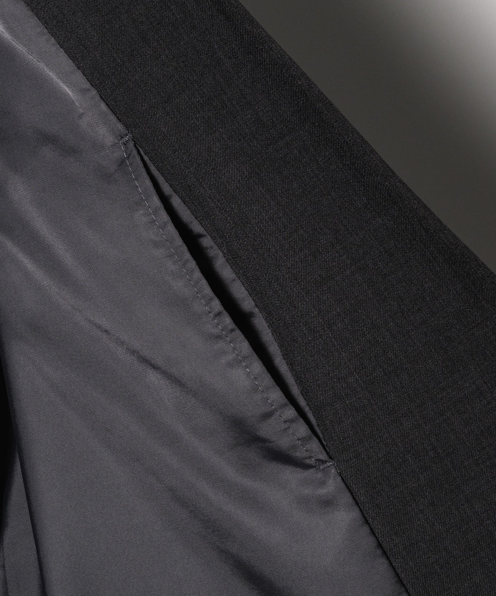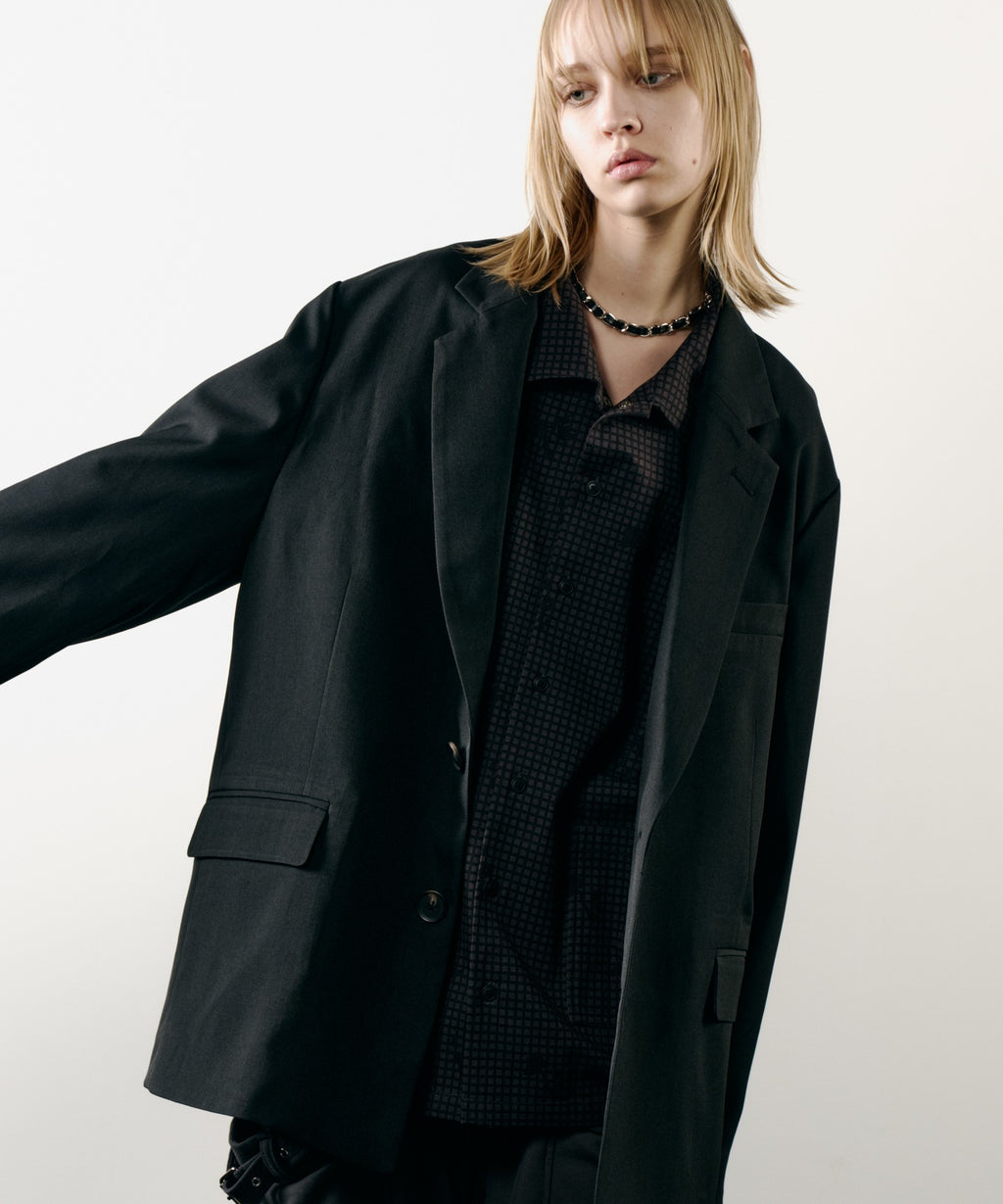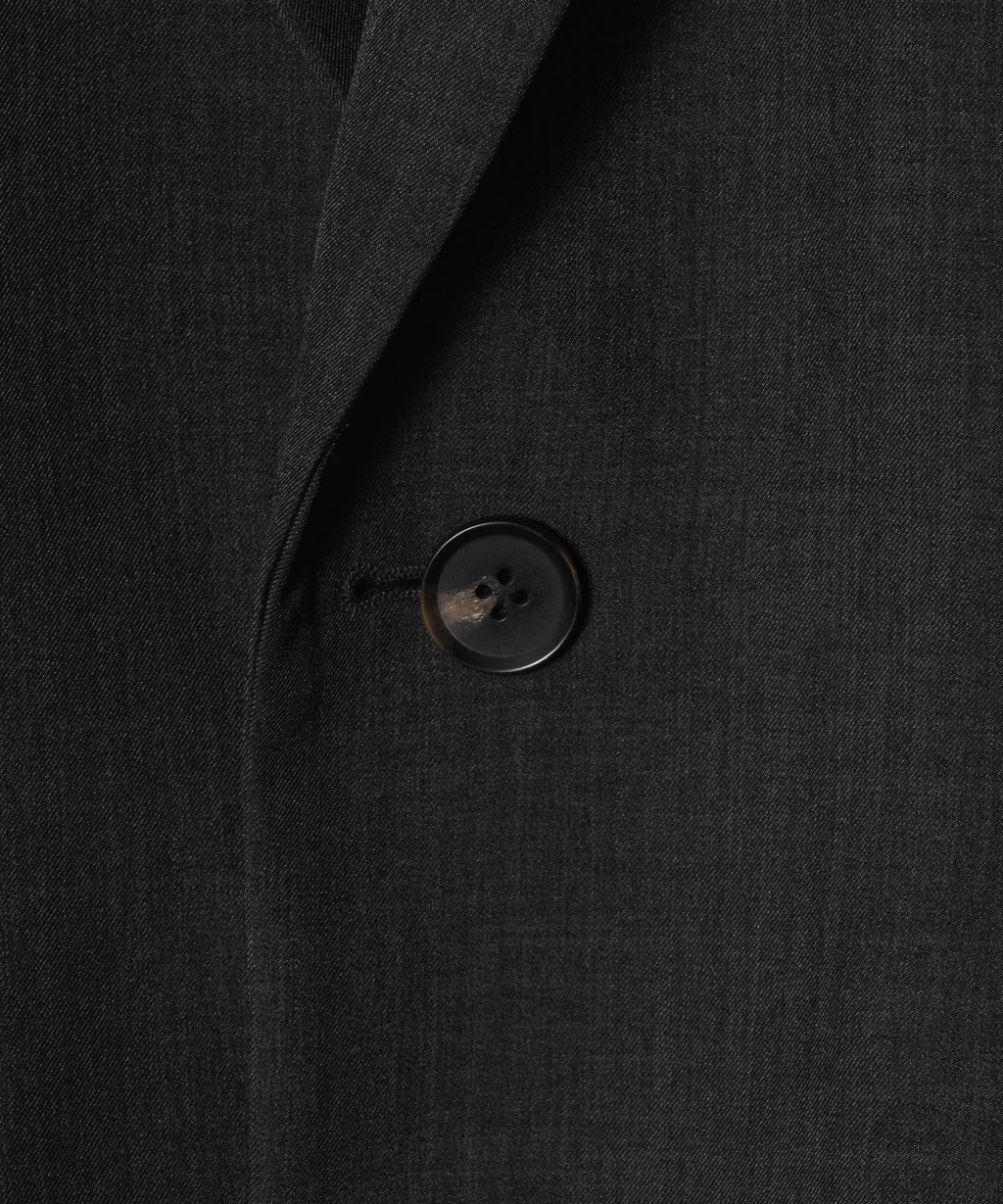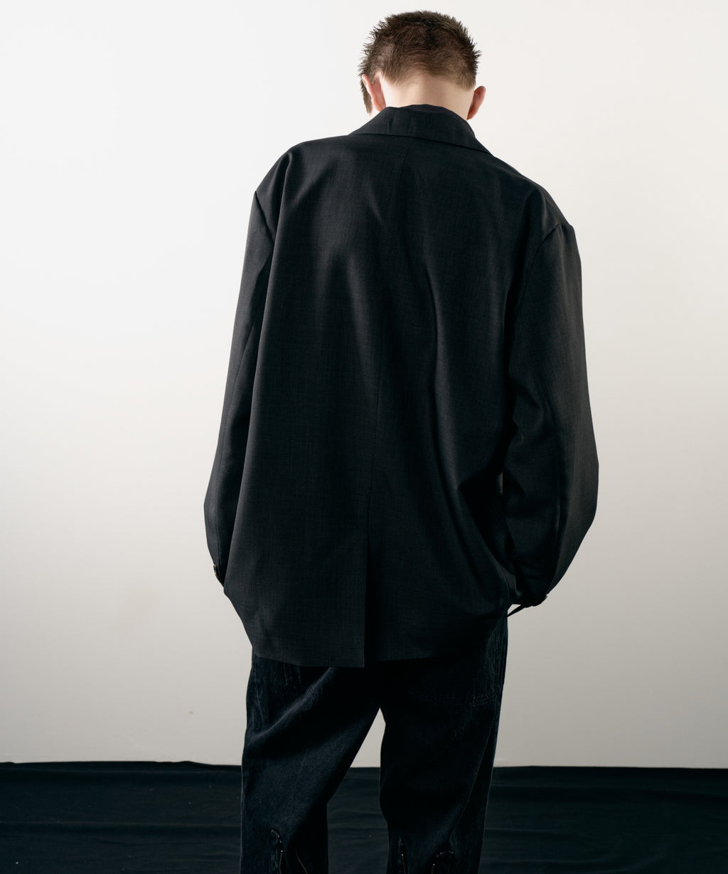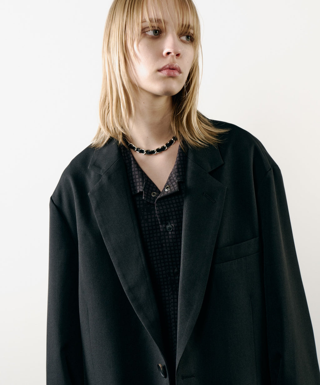 ・シワになりにくく、型崩れしにくい、適度な厚みとドレープ性を持ち合わたポリエステルドライツイル生地・ドライタッチでさらっとシャツ感覚で羽織りやすい軽量のテーラードジャケット・身頃と襟の芯地を調整し、適度に立体的な形をキープするよう仕上げ・ゆったりとした袖でフォーマル過ぎないゆるいシルエット・表に出るステッチ箇所を減らしたソリッドでミニマルな雰囲気・胸ポケット×1、フラップポケット×2、内側の胸元両サイドに内ポケット付き ・総裏、センターベント、袖口本切羽仕様・ボディと同系色の裏地付き・真っ黒過ぎないライトブラックとメランジ調のミックスグレーの2色展開。
