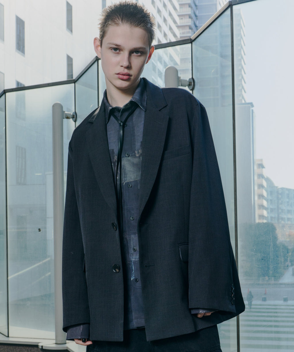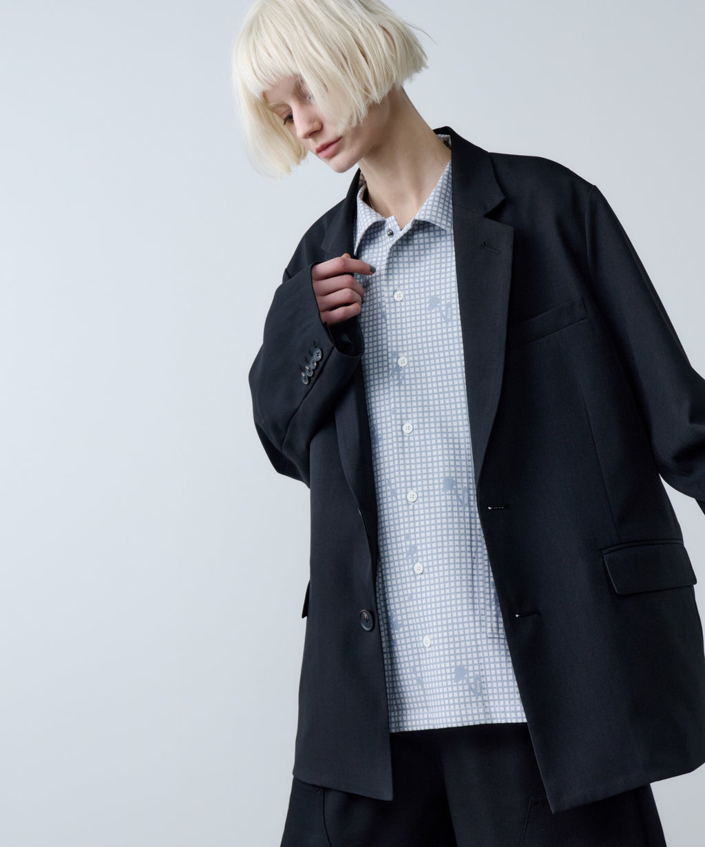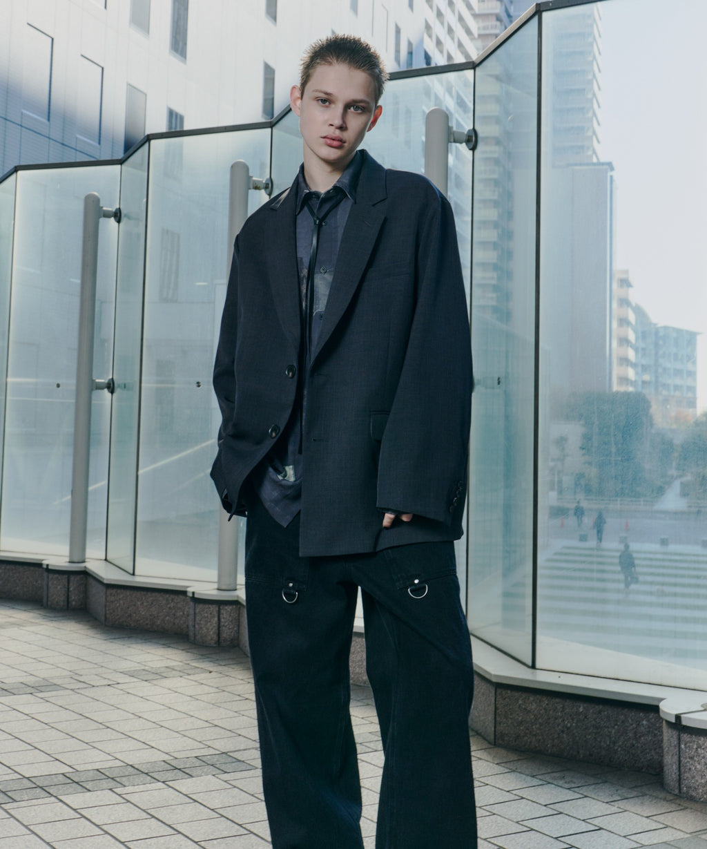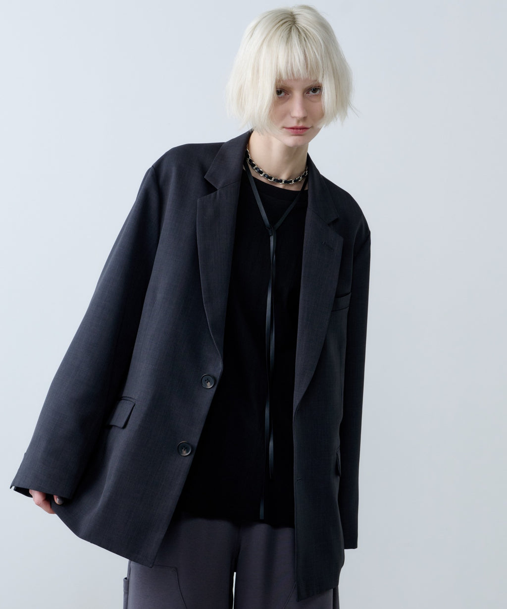 ・シワになりにくく、型崩れしにくい、適度な厚みとドレープ性を持ち合わたポリエステルドライツイル生地・ドライタッチでさらっとシャツ感覚で羽織りやすい軽量のテーラードジャケット・身頃と襟の芯地を調整し、適度に立体的な形をキープするよう仕上げ・ゆったりとした袖でフォーマル過ぎないゆるいシルエット・表に出るステッチ箇所を減らしたソリッドでミニマルな雰囲気・胸ポケット×1、フラップポケット×2、内側の胸元両サイドに内ポケット付き ・総裏、センターベント、袖口本切羽仕様・ボディと同系色の裏地付き・真っ黒過ぎないライトブラックとメランジ調のミックスグレーの2色展開。
