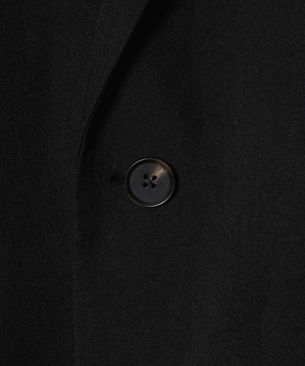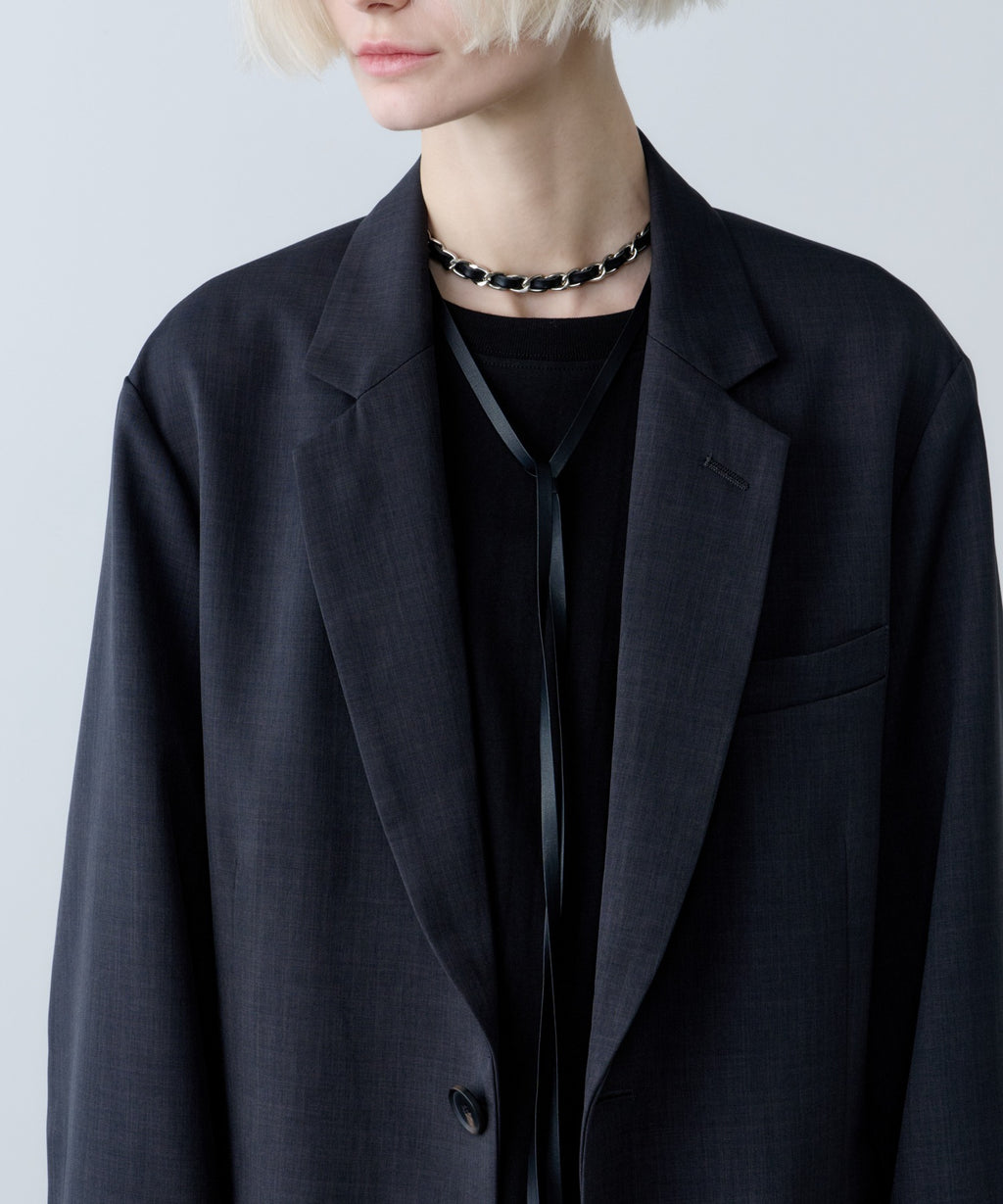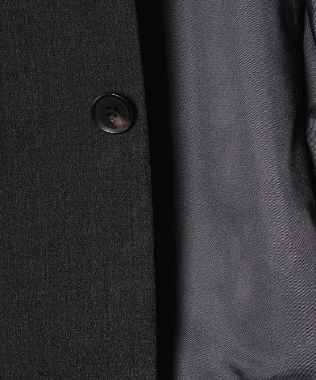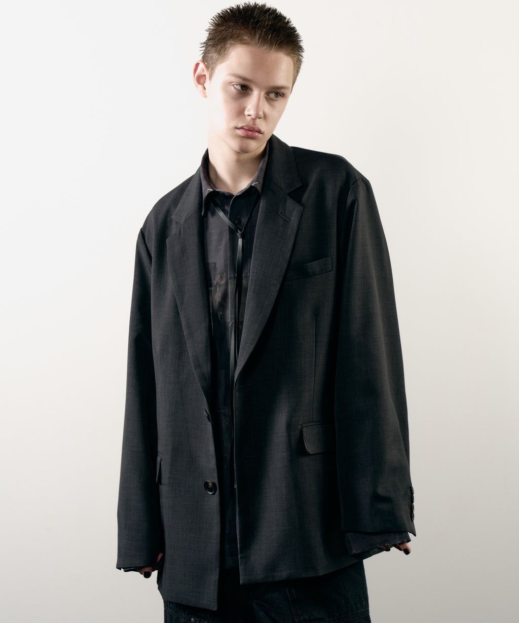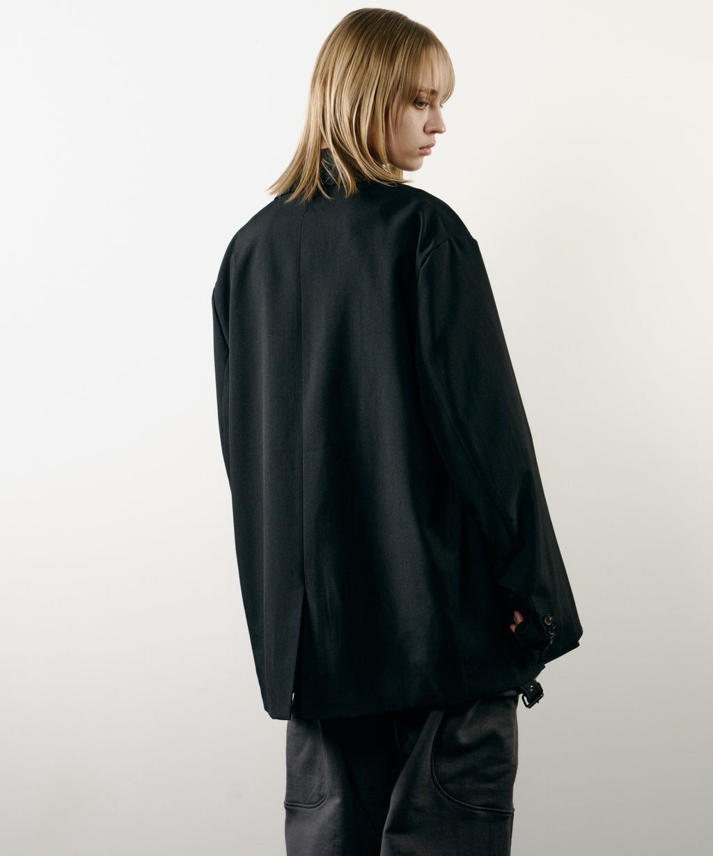 ・シワになりにくく、型崩れしにくい、適度な厚みとドレープ性を持ち合わたポリエステルドライツイル生地・ドライタッチでさらっとシャツ感覚で羽織りやすい軽量のテーラードジャケット・身頃と襟の芯地を調整し、適度に立体的な形をキープするよう仕上げ・ゆったりとした袖でフォーマル過ぎないゆるいシルエット・表に出るステッチ箇所を減らしたソリッドでミニマルな雰囲気・胸ポケット×1、フラップポケット×2、内側の胸元両サイドに内ポケット付き ・総裏、センターベント、袖口本切羽仕様・ボディと同系色の裏地付き・真っ黒過ぎないライトブラックとメランジ調のミックスグレーの2色展開。