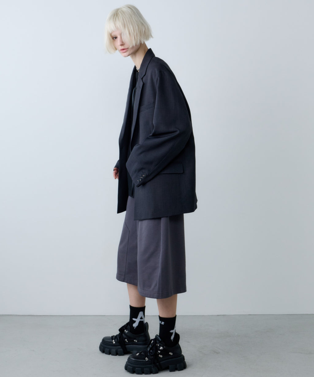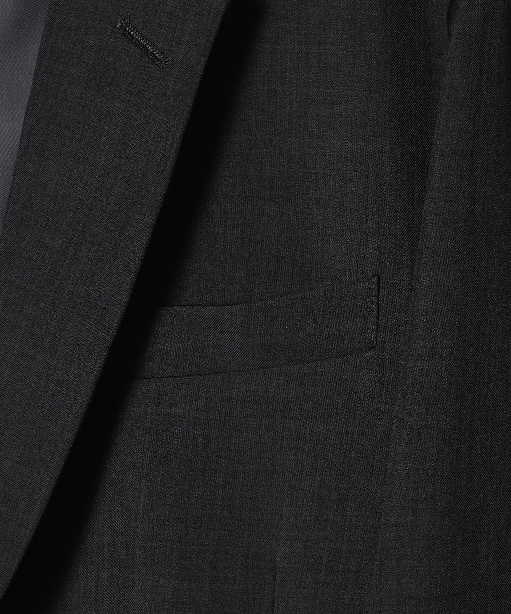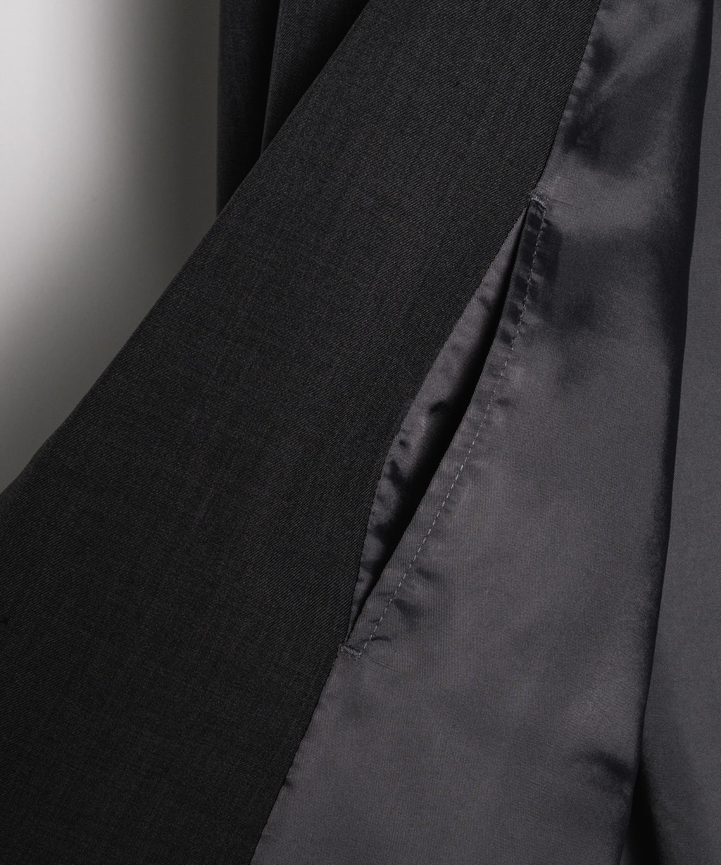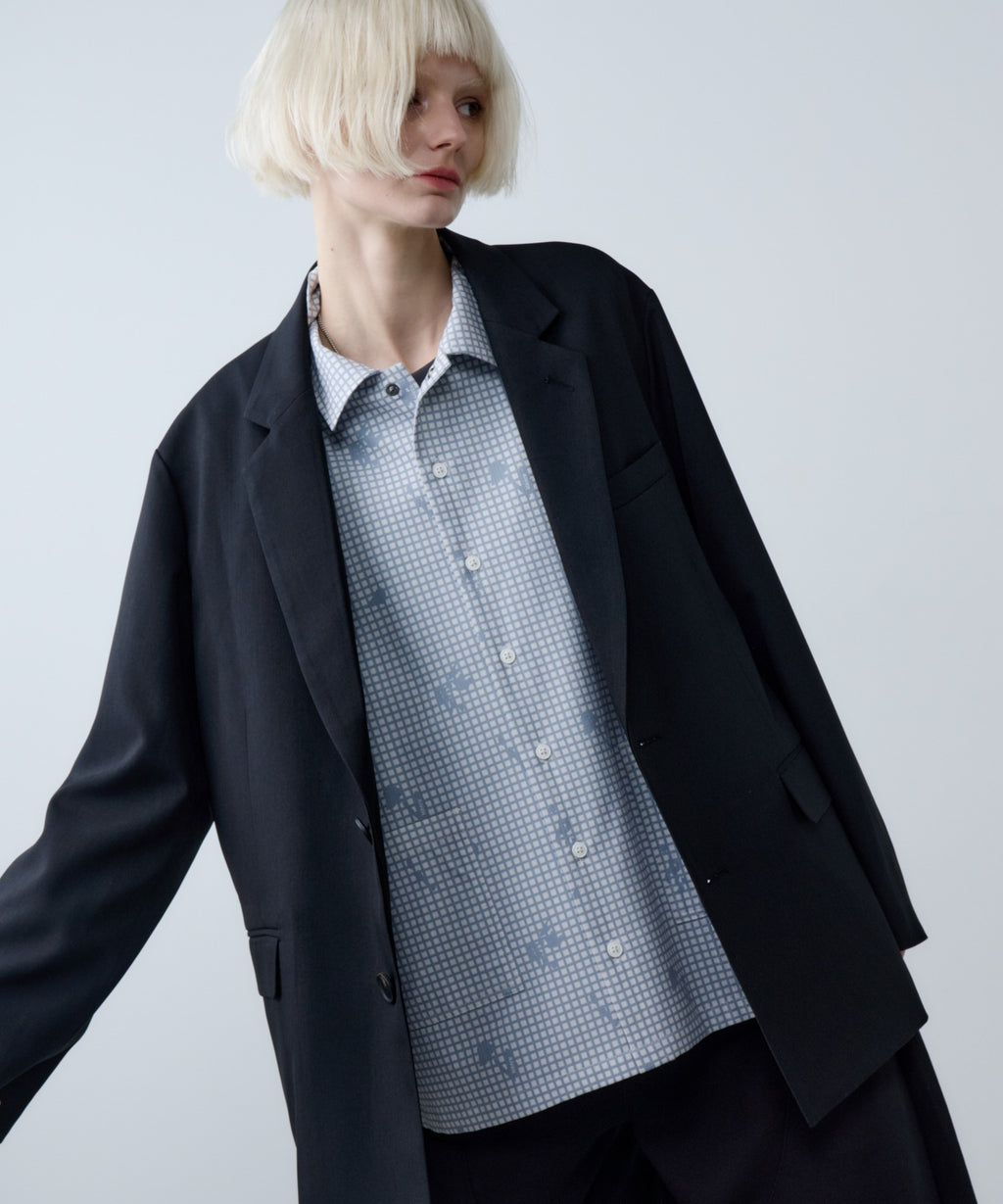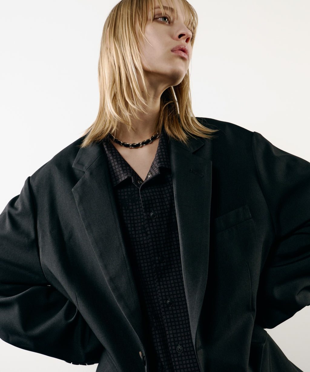 ・シワになりにくく、型崩れしにくい、適度な厚みとドレープ性を持ち合わたポリエステルドライツイル生地・ドライタッチでさらっとシャツ感覚で羽織りやすい軽量のテーラードジャケット・身頃と襟の芯地を調整し、適度に立体的な形をキープするよう仕上げ・ゆったりとした袖でフォーマル過ぎないゆるいシルエット・表に出るステッチ箇所を減らしたソリッドでミニマルな雰囲気・胸ポケット×1、フラップポケット×2、内側の胸元両サイドに内ポケット付き ・総裏、センターベント、袖口本切羽仕様・ボディと同系色の裏地付き・真っ黒過ぎないライトブラックとメランジ調のミックスグレーの2色展開。