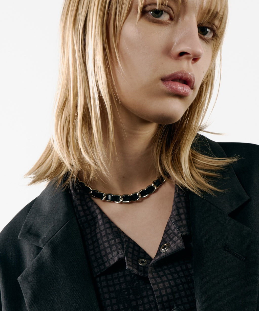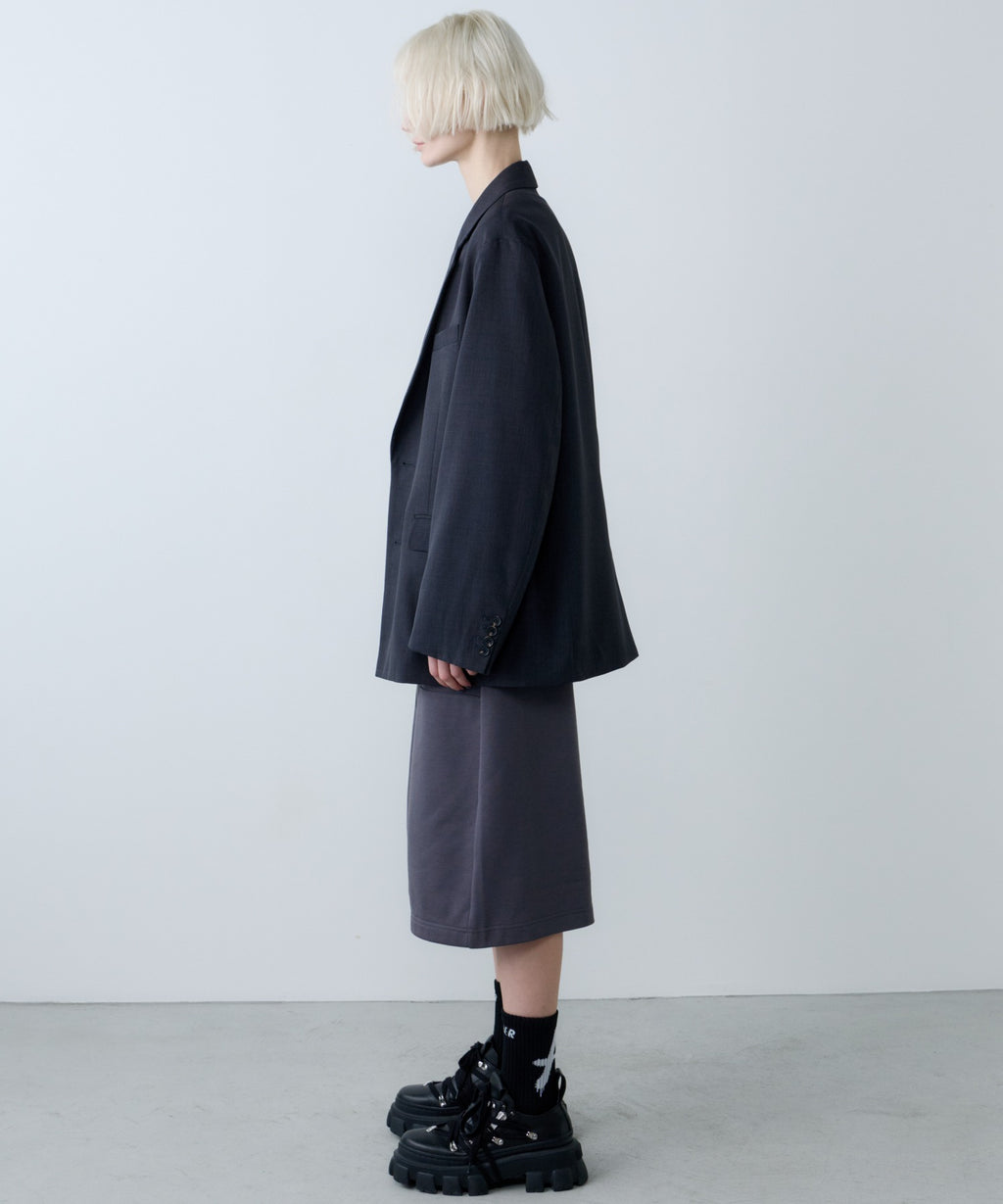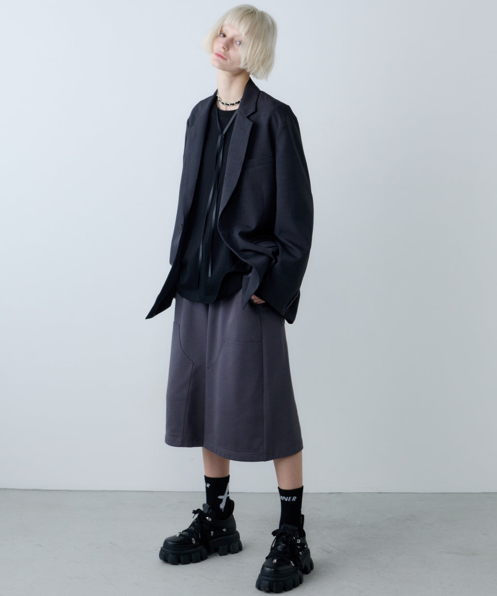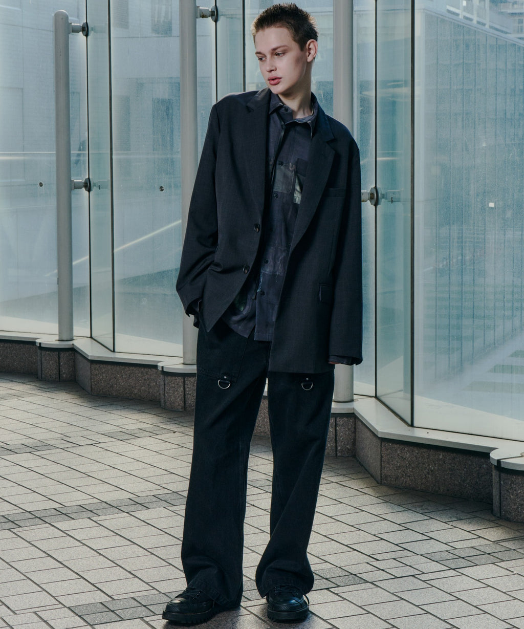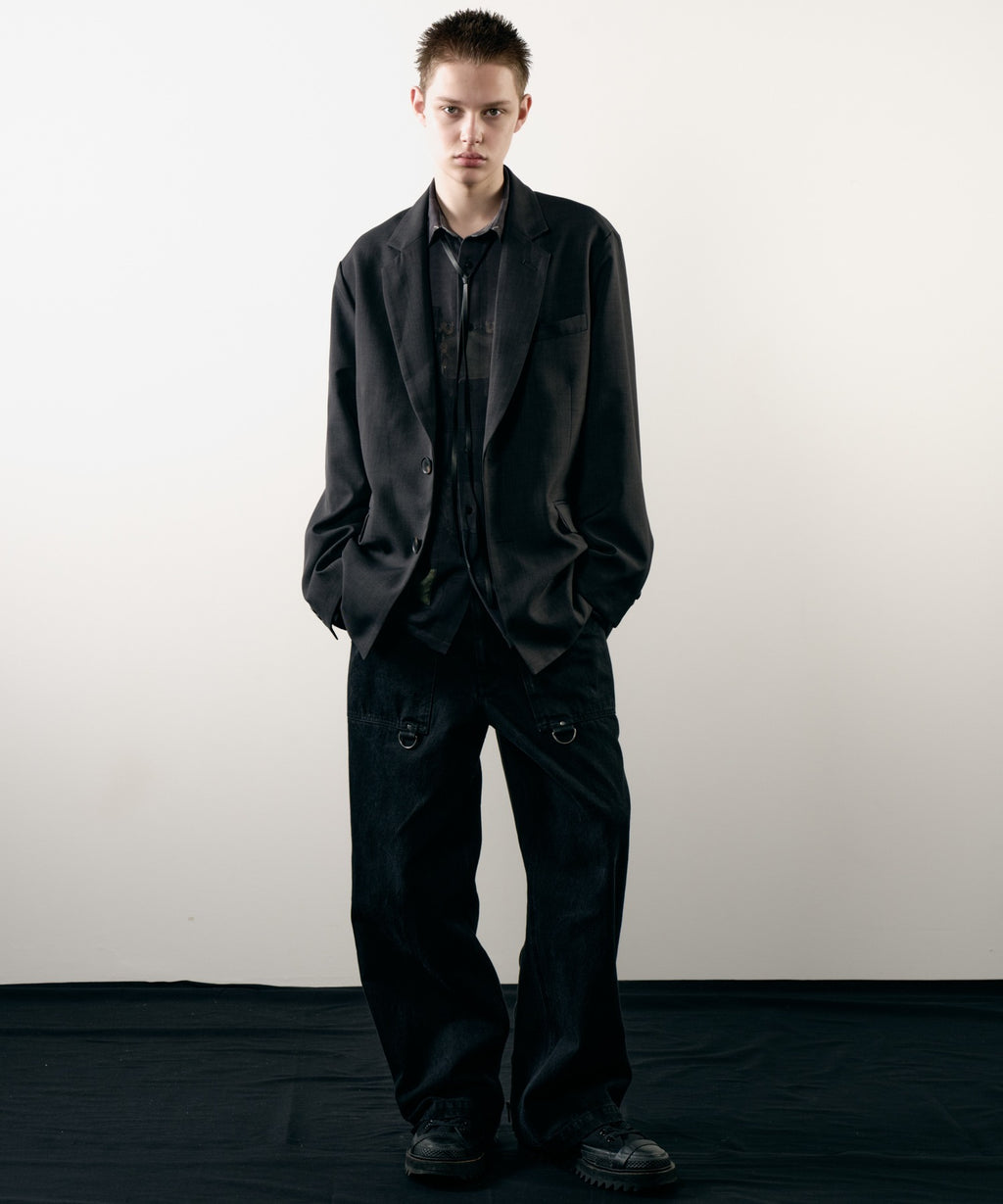 ・シワになりにくく、型崩れしにくい、適度な厚みとドレープ性を持ち合わたポリエステルドライツイル生地・ドライタッチでさらっとシャツ感覚で羽織りやすい軽量のテーラードジャケット・身頃と襟の芯地を調整し、適度に立体的な形をキープするよう仕上げ・ゆったりとした袖でフォーマル過ぎないゆるいシルエット・表に出るステッチ箇所を減らしたソリッドでミニマルな雰囲気・胸ポケット×1、フラップポケット×2、内側の胸元両サイドに内ポケット付き ・総裏、センターベント、袖口本切羽仕様・ボディと同系色の裏地付き・真っ黒過ぎないライトブラックとメランジ調のミックスグレーの2色展開。